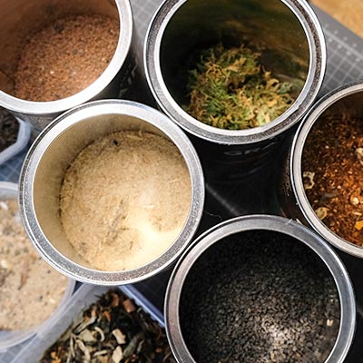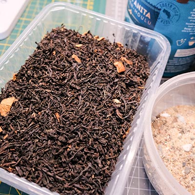 Mousse d’arbre, morceau d’écorce, sable de Rhin, sable jaune ou blanc, cailloux pour sol d’aquarium, thé, sciure de bois, tant de chose que vous pouvez ramasser, stocker pour vos futures créations. Sortez vos boîtes et remplissez-les !