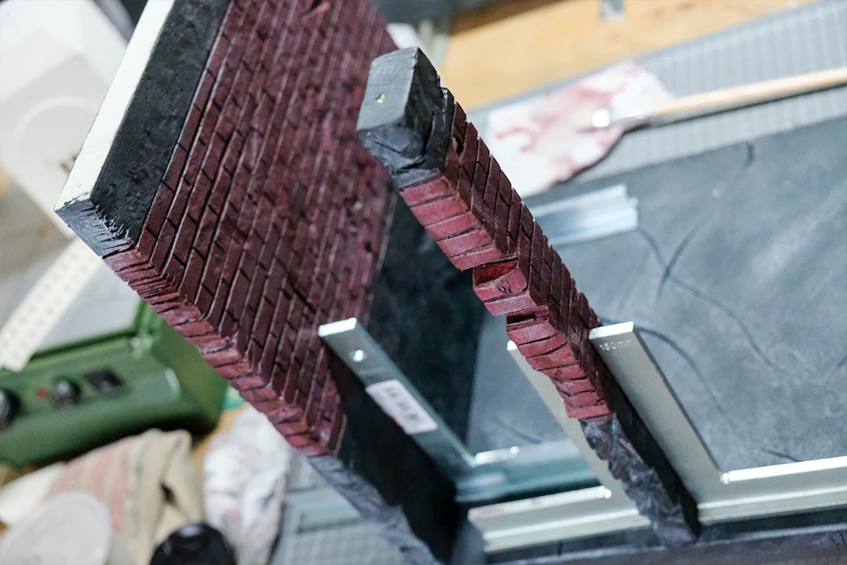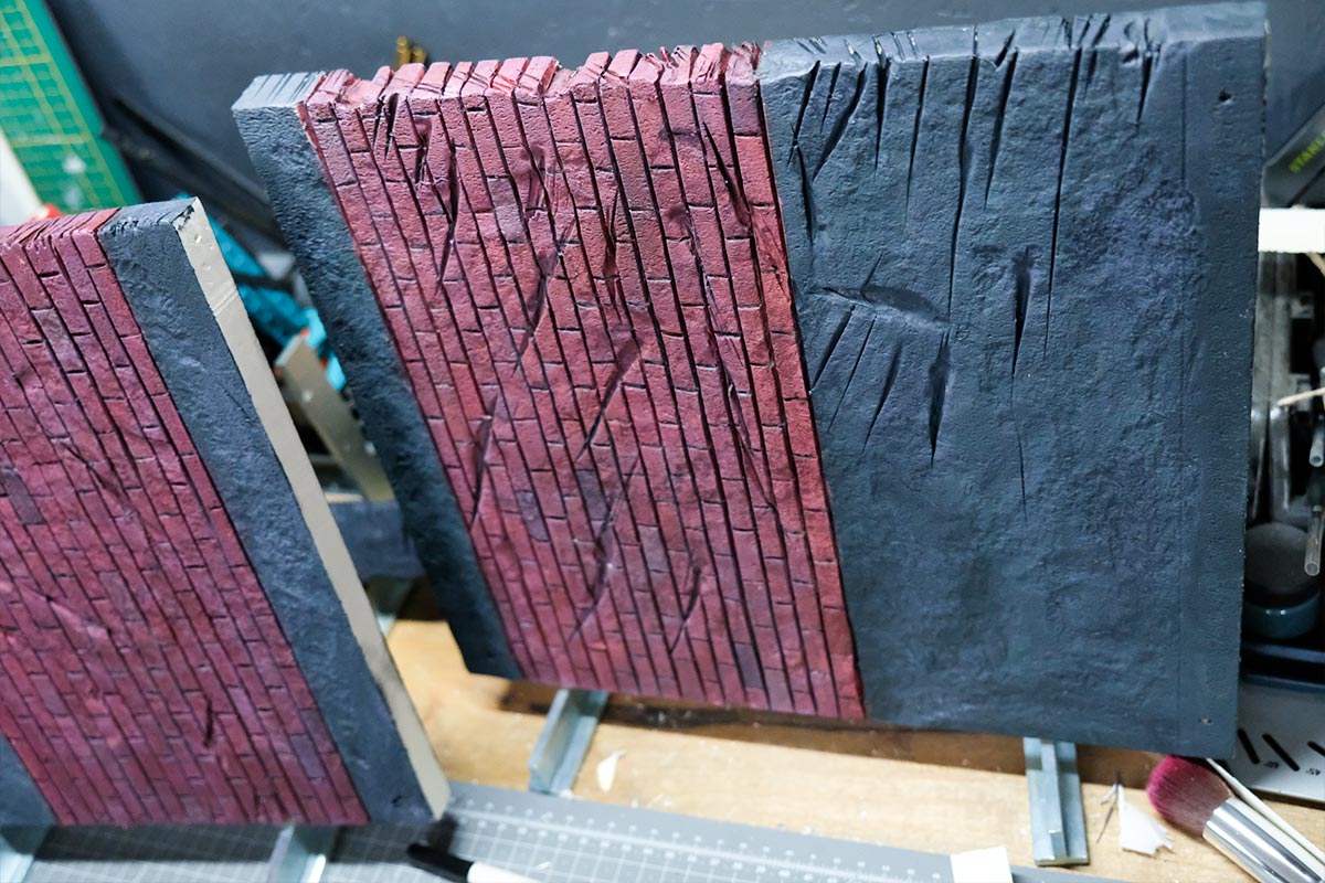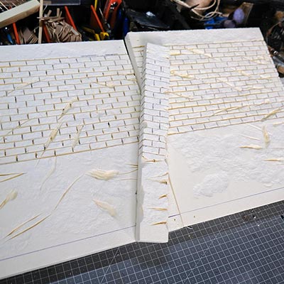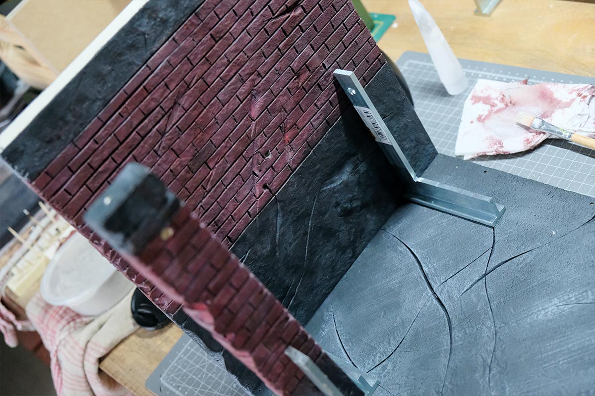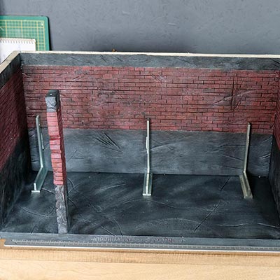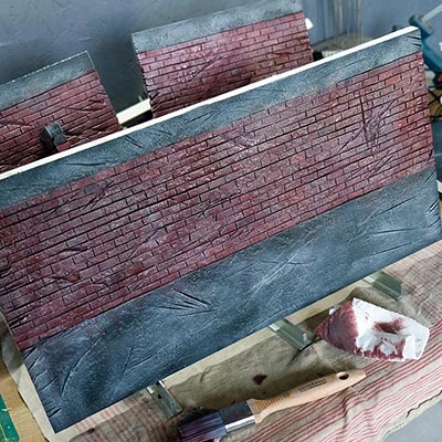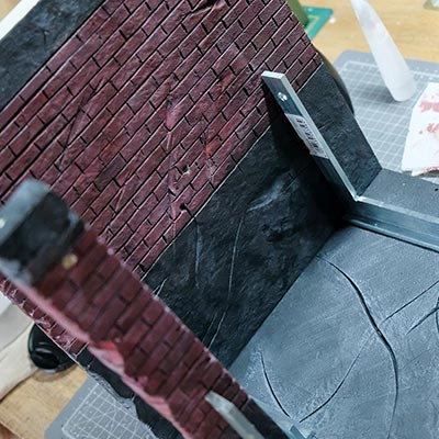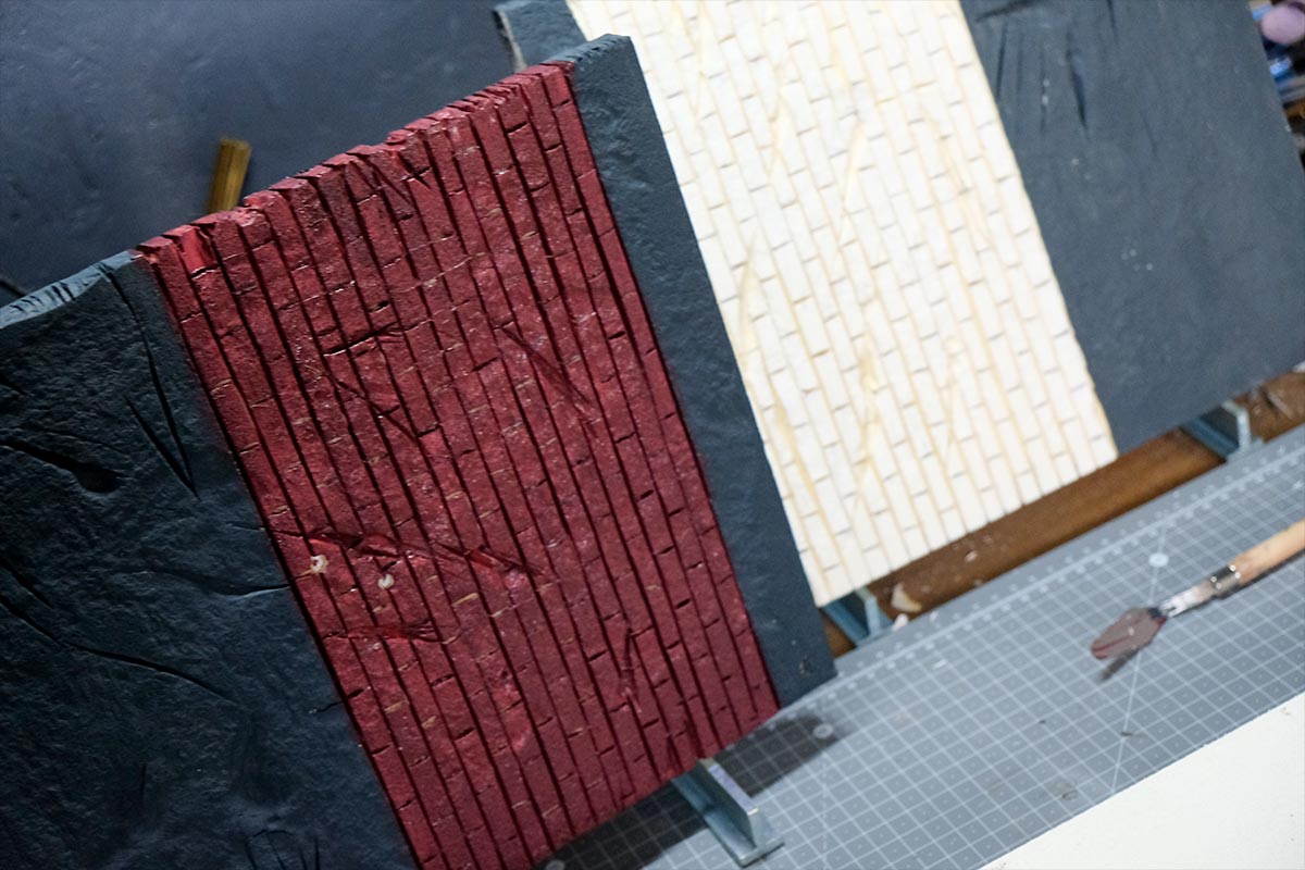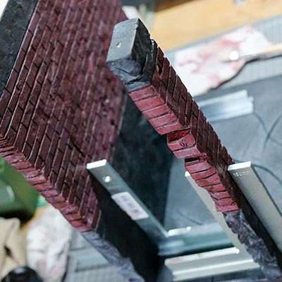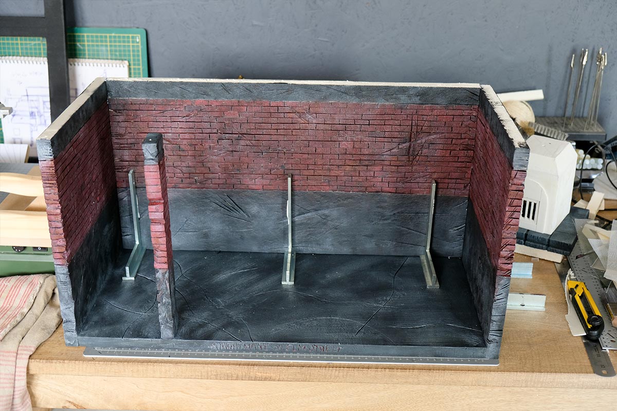 Les entailles, fissures et briques sont faites avec un fer à souder dont la lame est un "bistouri". La texture sur les briques est réalisée grâce à une boulette d'aluminium. La couleur toujours à base d'acrylique. Un peu de sable blanc pour donner l'effet de texture du salpêtre à la base des murs.