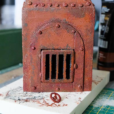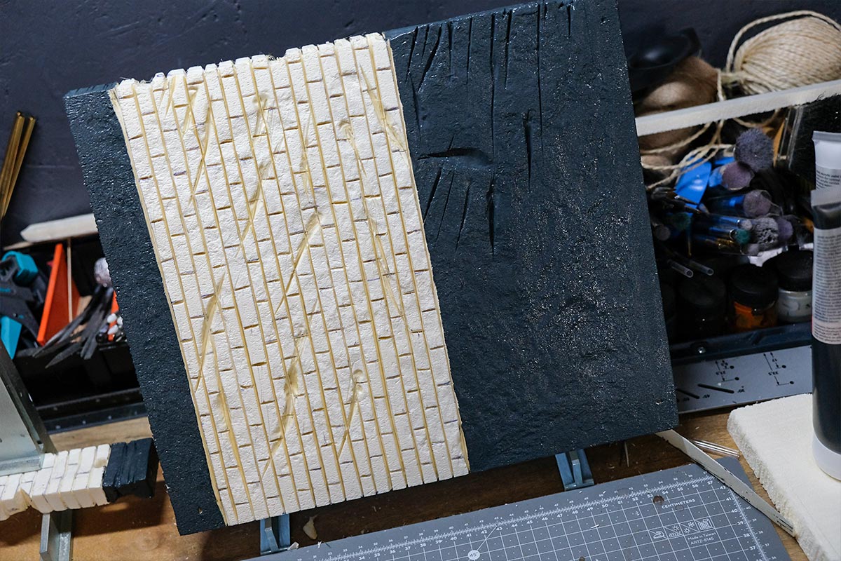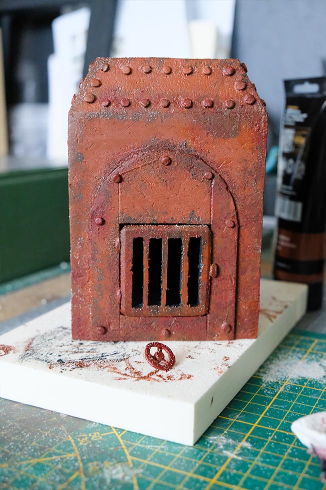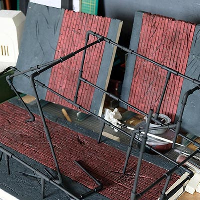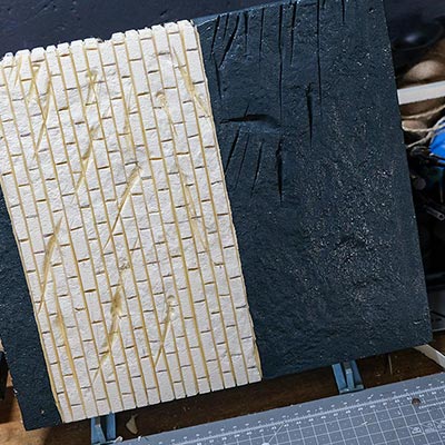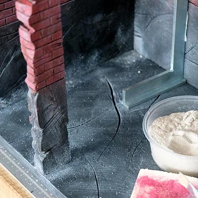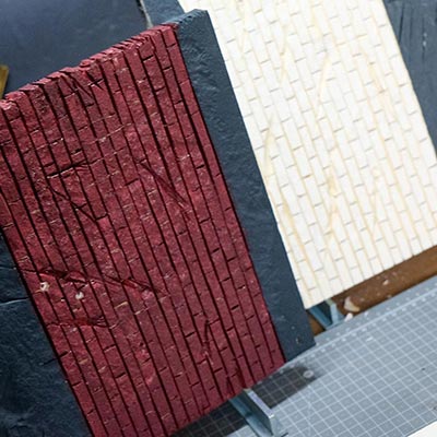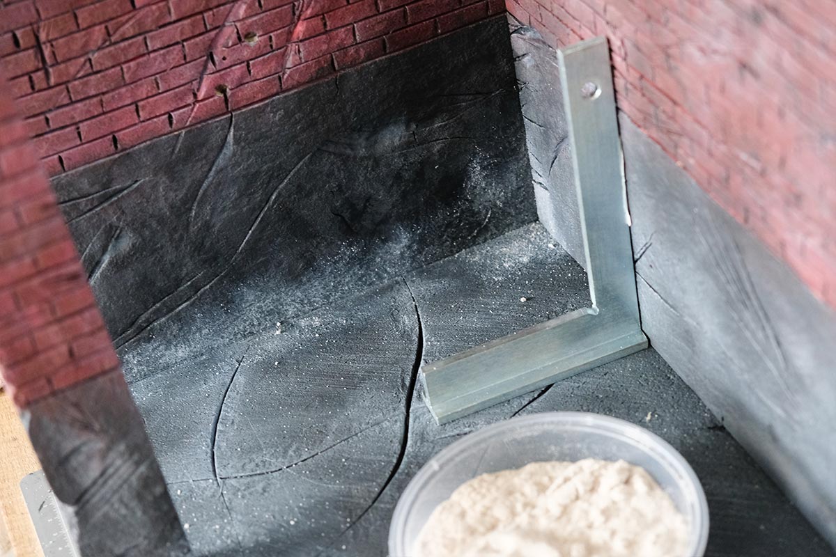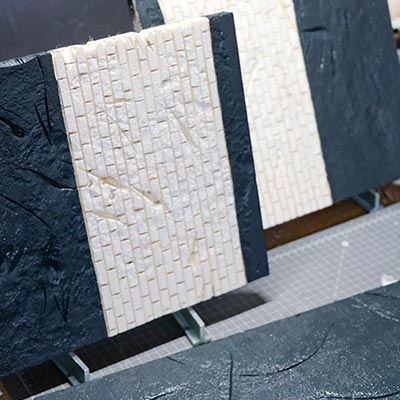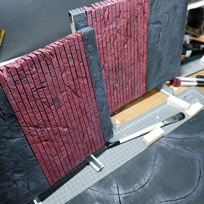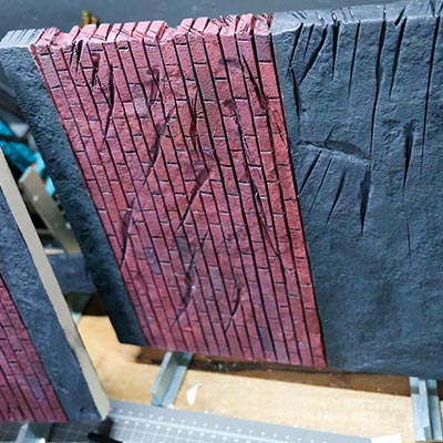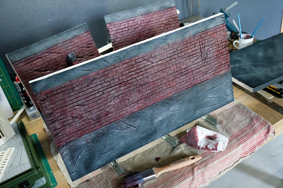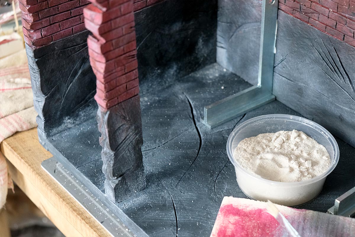 Les entailles, fissures et briques sont faites avec un fer à souder dont la lame est un "bistouri". La texture sur les briques est réalisée grâce à une boulette d'aluminium. La couleur toujours à base d'acrylique. Un peu de sable blanc pour donner l'effet de texture du salpêtre à la base des murs.