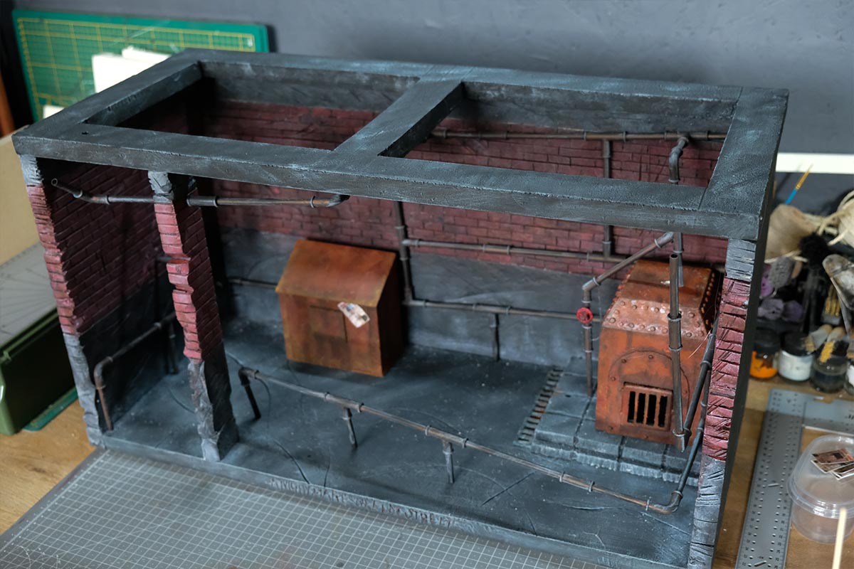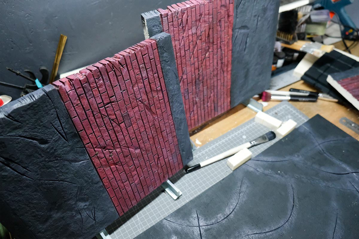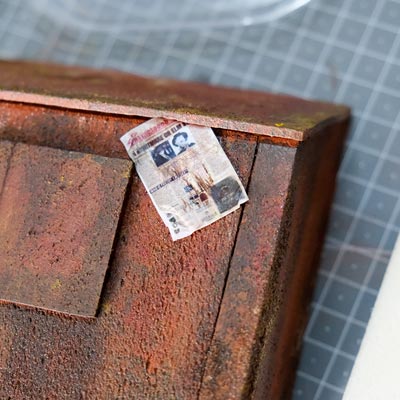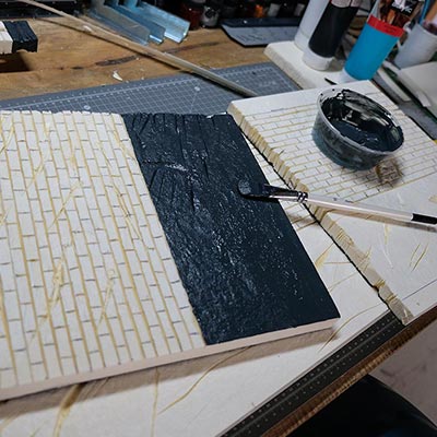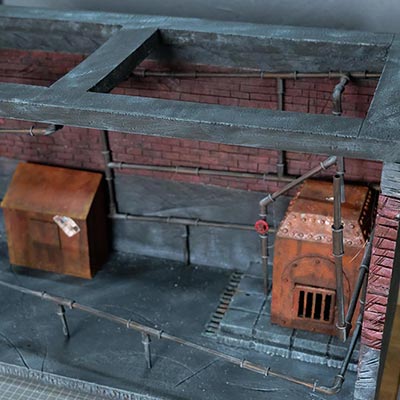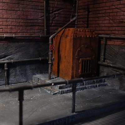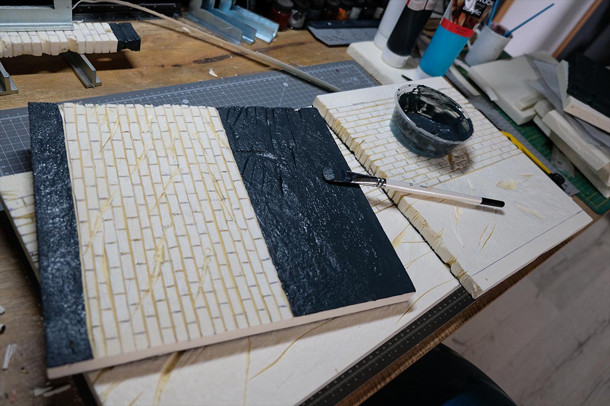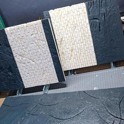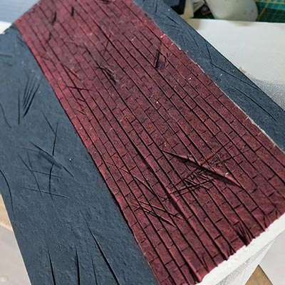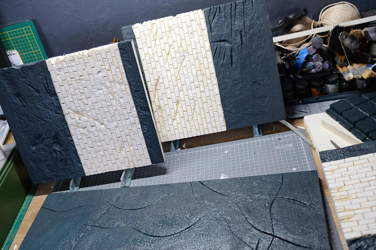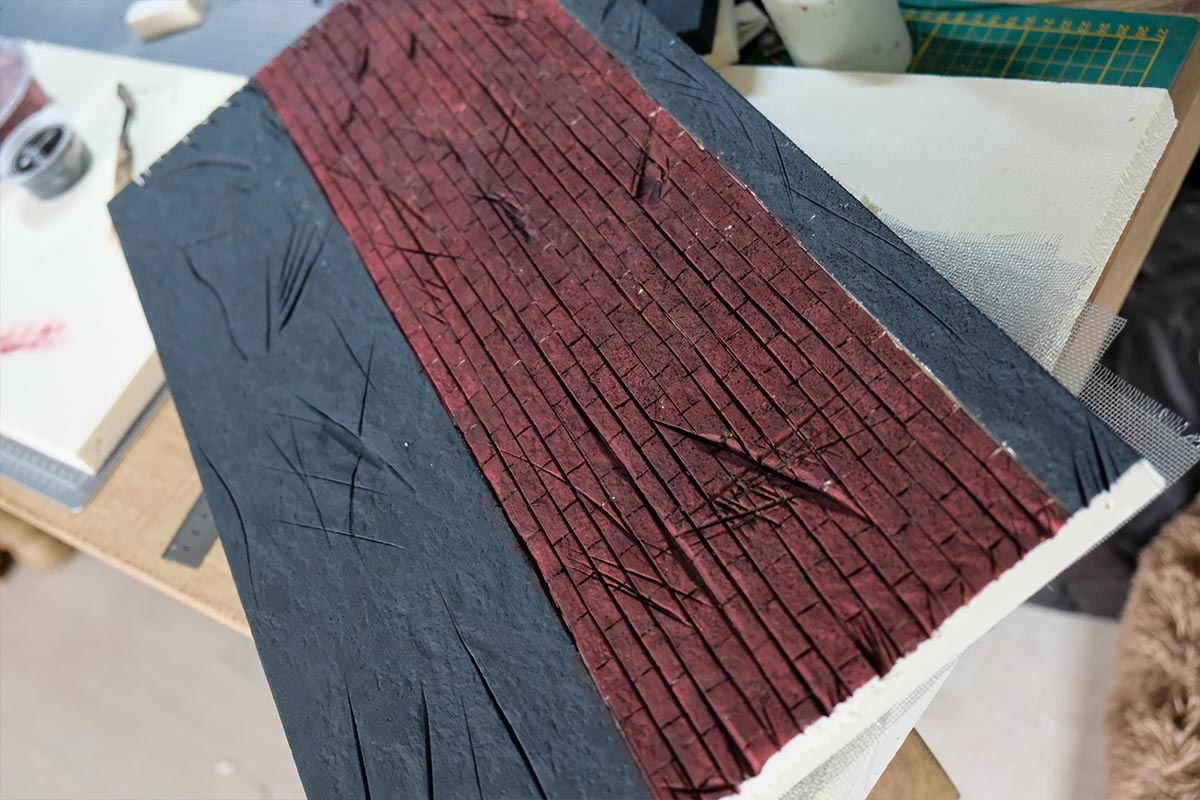 Les entailles, fissures et briques sont faites avec un fer à souder dont la lame est un "bistouri". La texture sur les briques est réalisée grâce à une boulette d'aluminium. La couleur toujours à base d'acrylique. Un peu de sable blanc pour donner l'effet de texture du salpêtre à la base des murs.