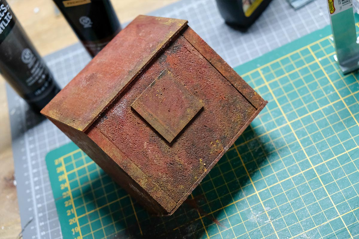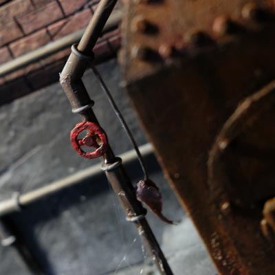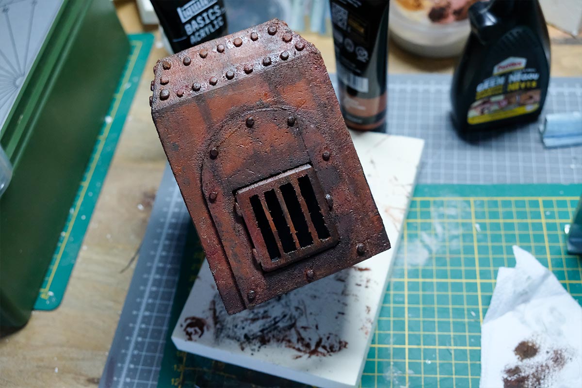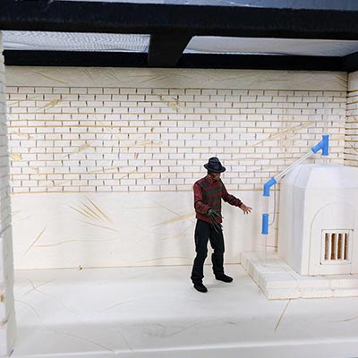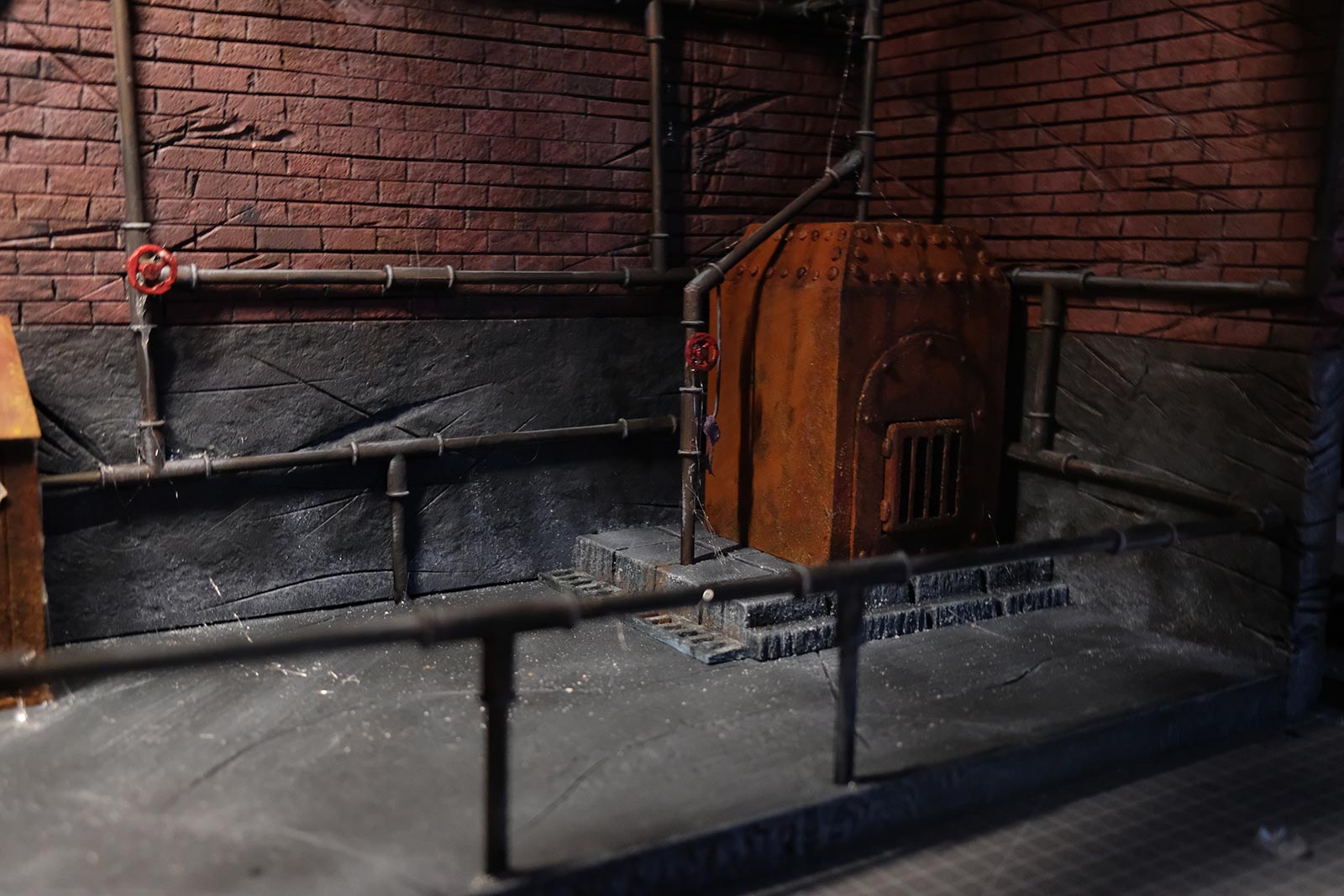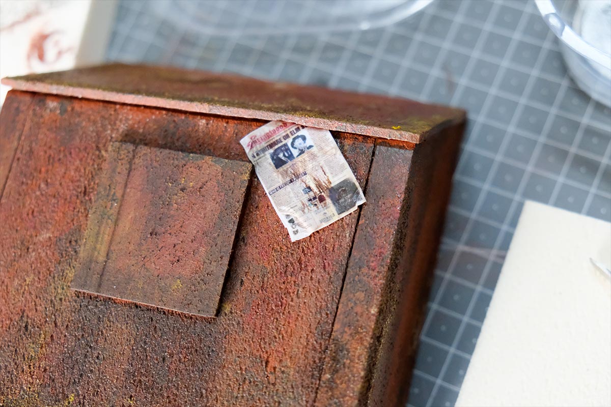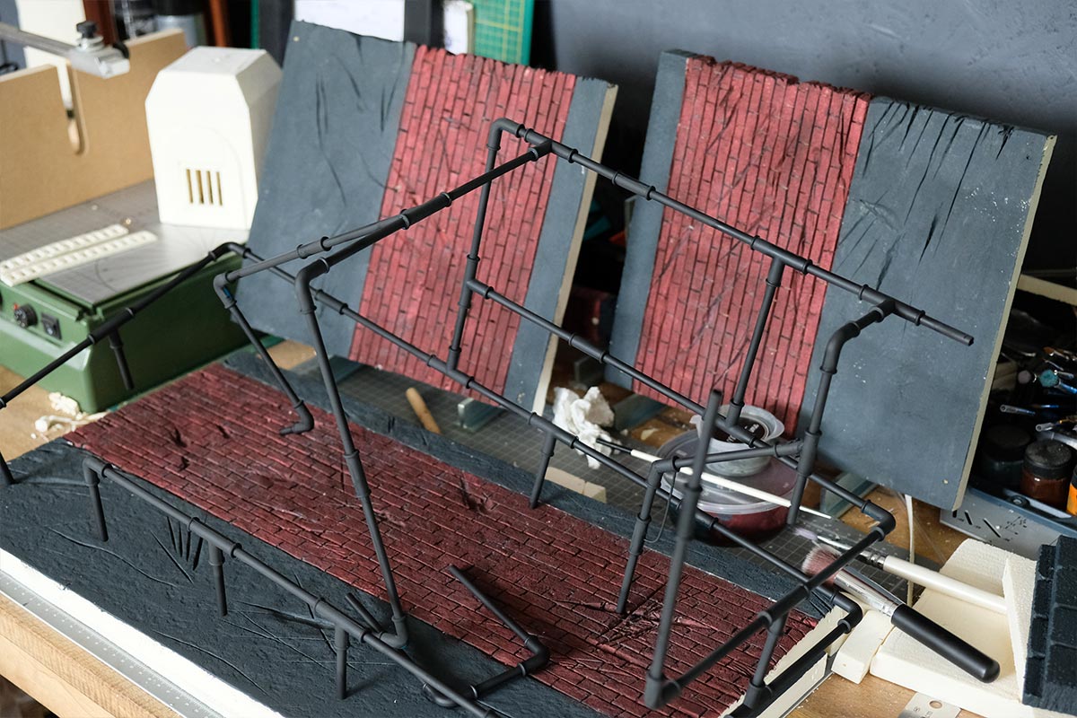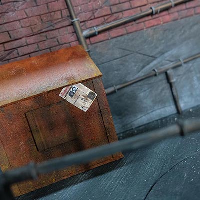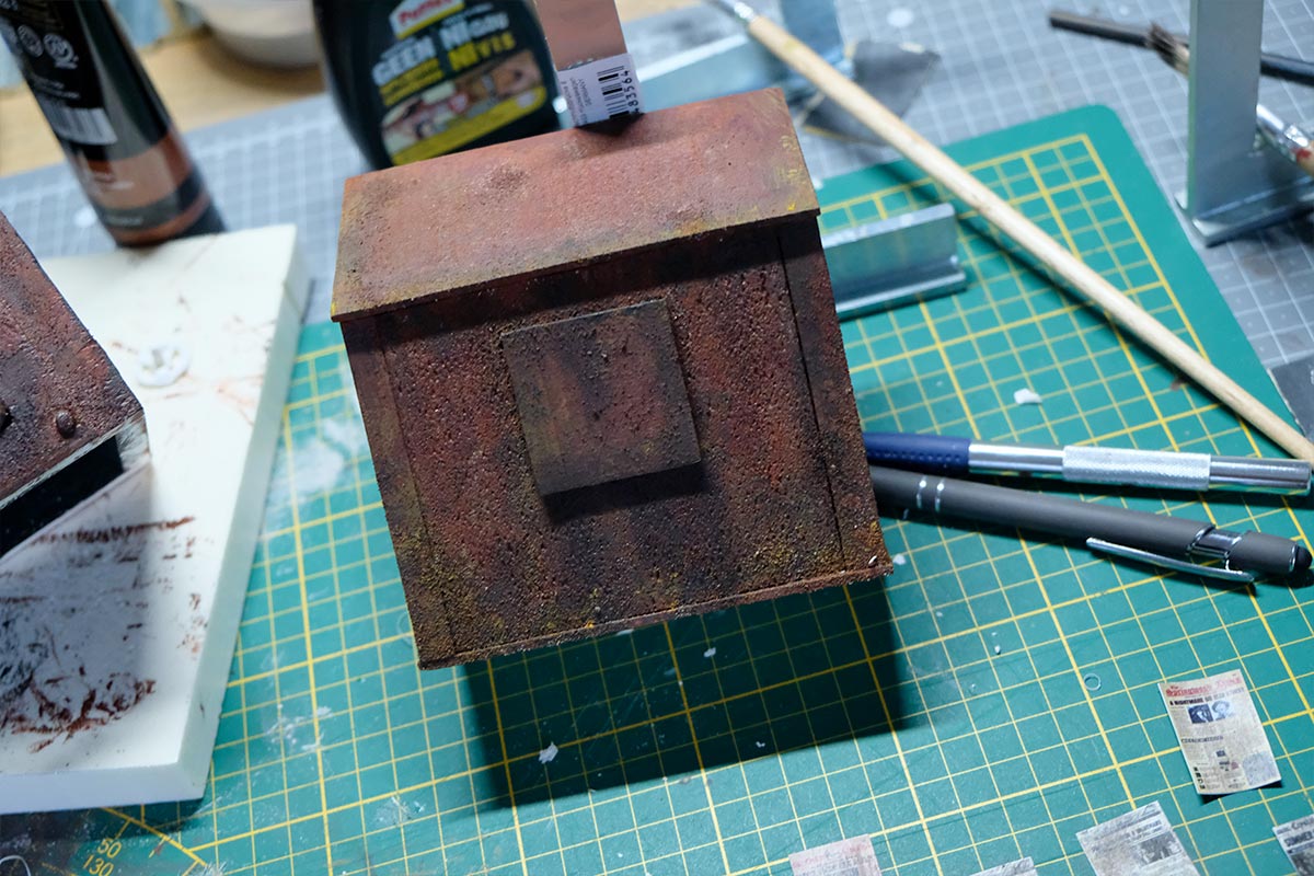 Les entailles, fissures et briques sont faites avec un fer à souder dont la lame est un "bistouri". La texture sur les briques est réalisée grâce à une boulette d'aluminium. La couleur toujours à base d'acrylique. Un peu de sable blanc pour donner l'effet de texture du salpêtre à la base des murs.