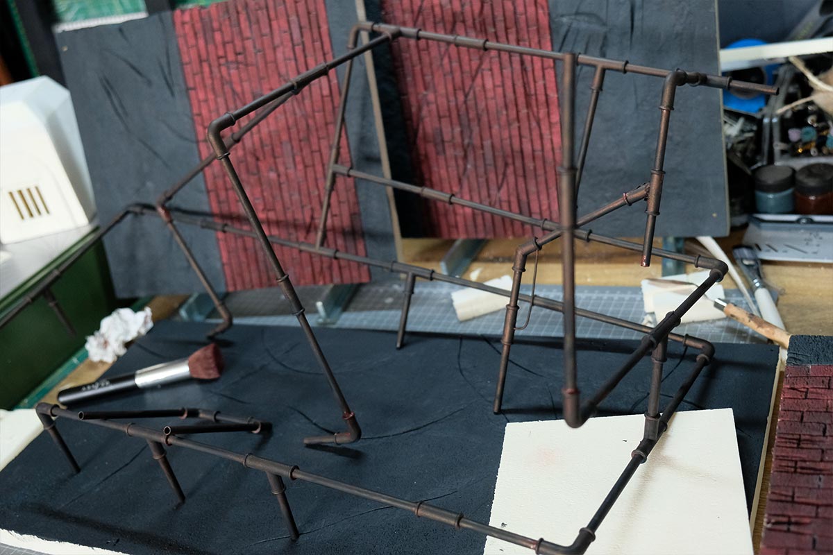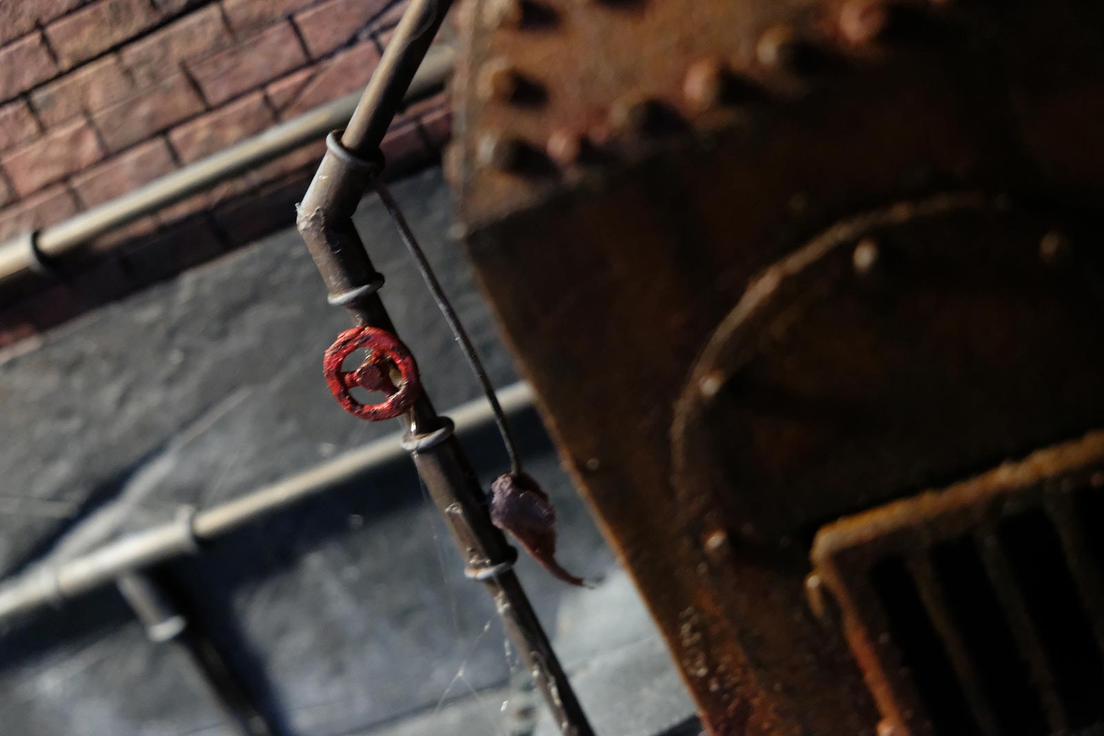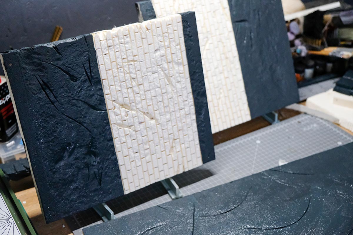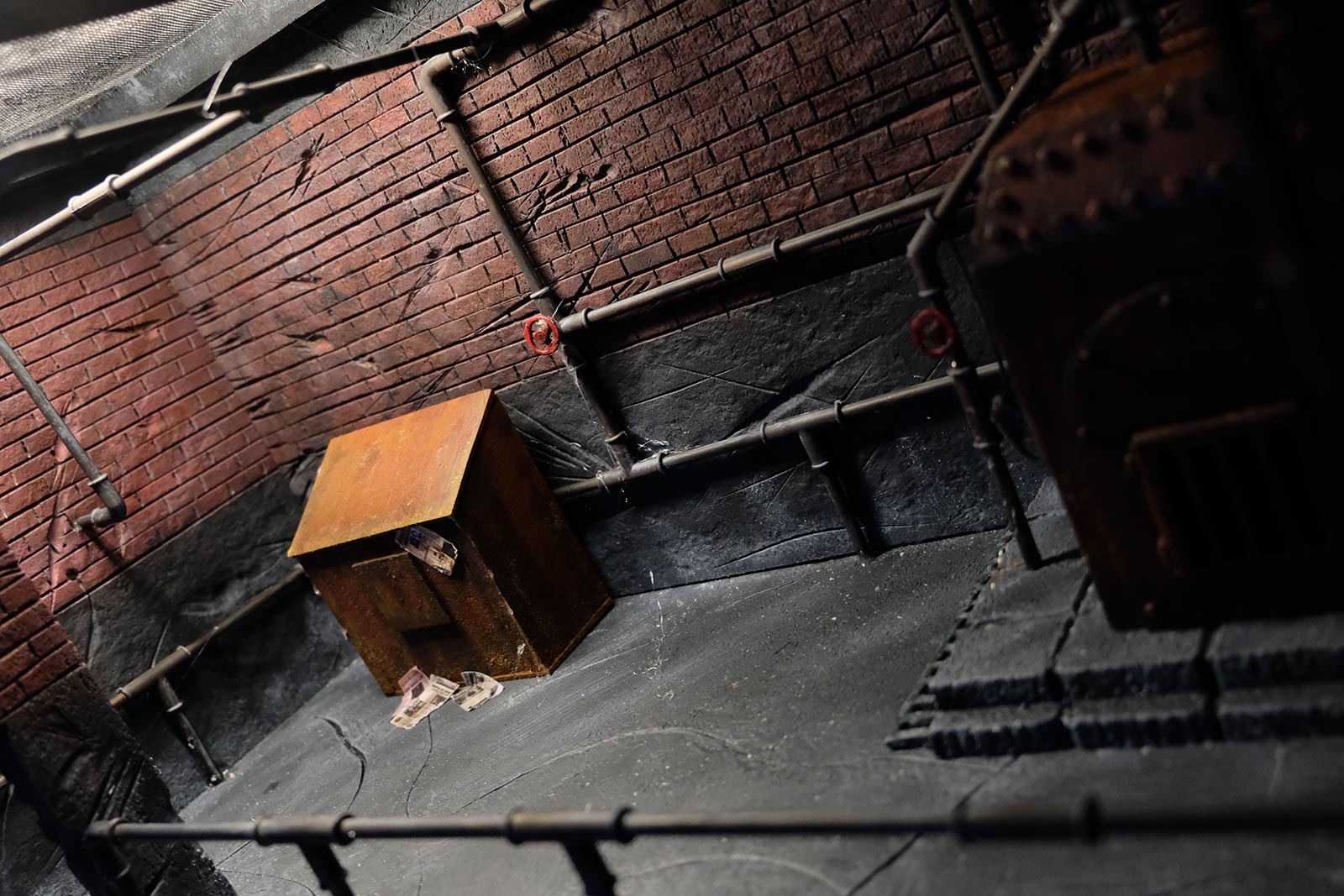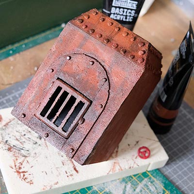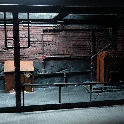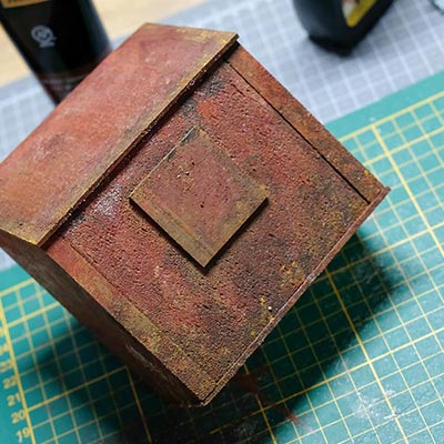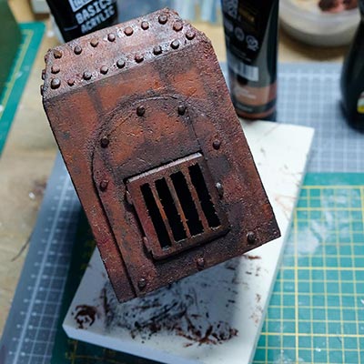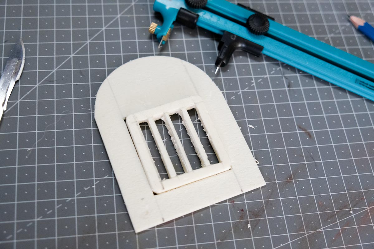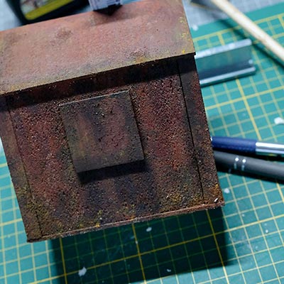 Les entailles, fissures et briques sont faites avec un fer à souder dont la lame est un "bistouri". La texture sur les briques est réalisée grâce à une boulette d'aluminium. La couleur toujours à base d'acrylique. Un peu de sable blanc pour donner l'effet de texture du salpêtre à la base des murs.
