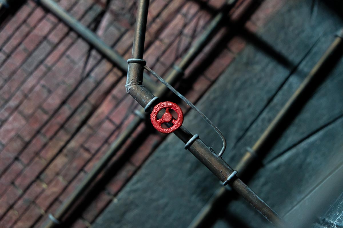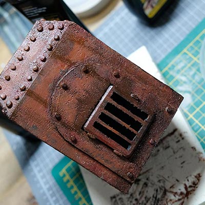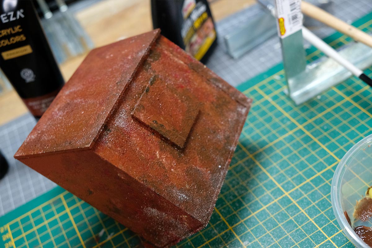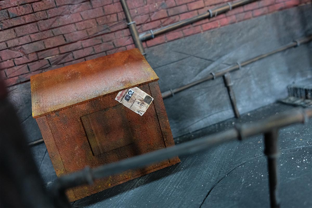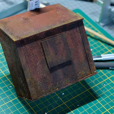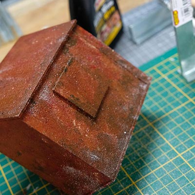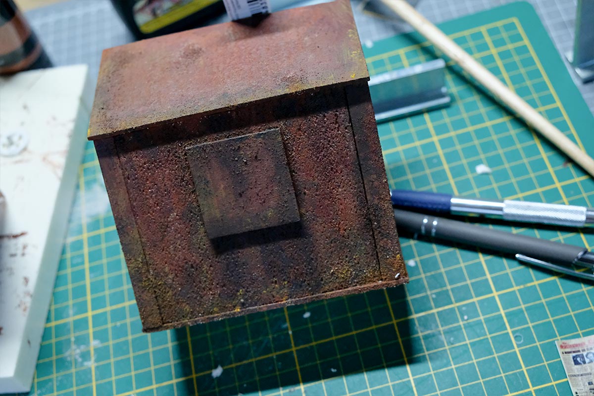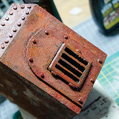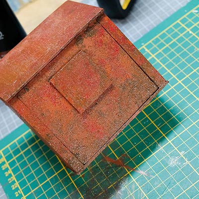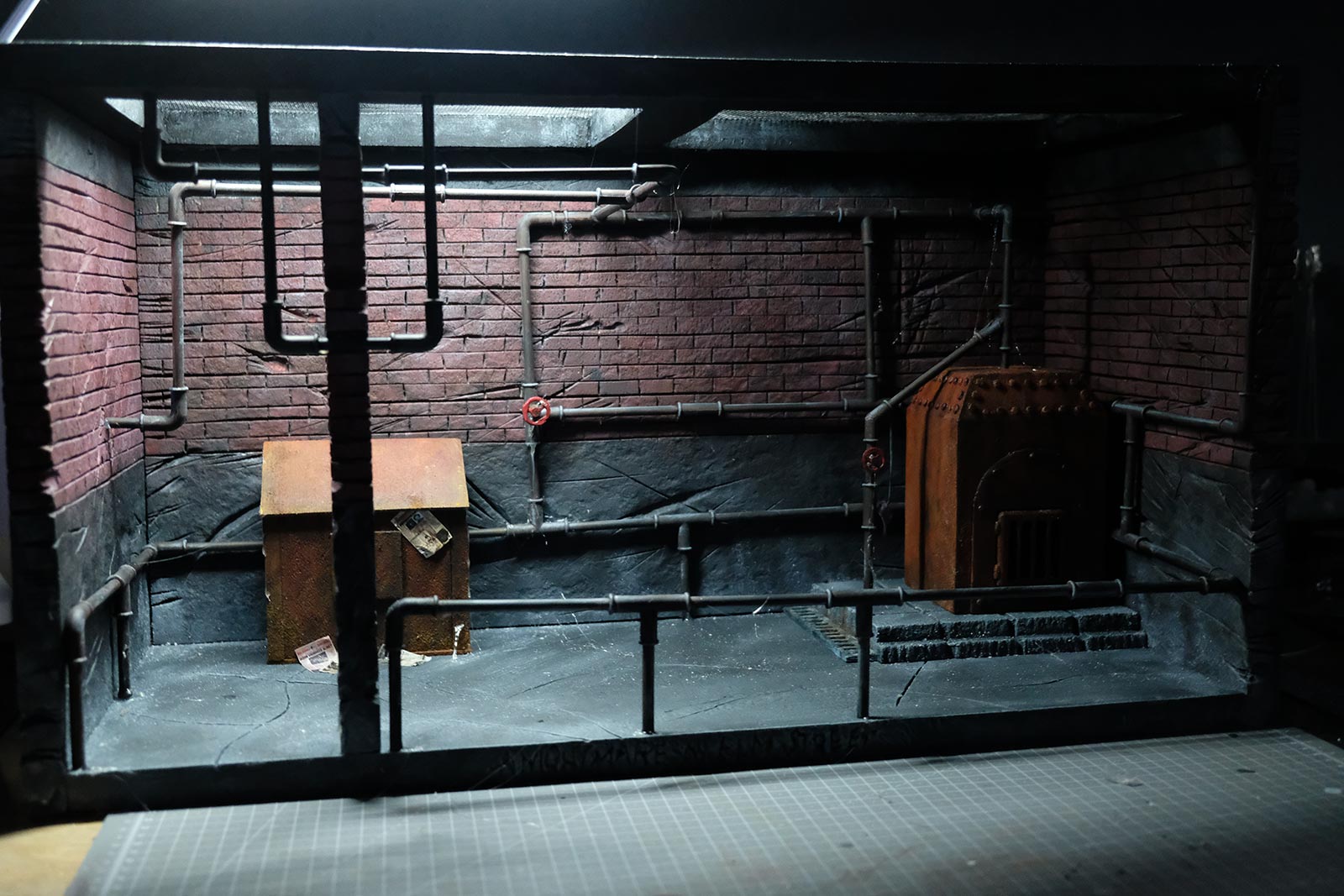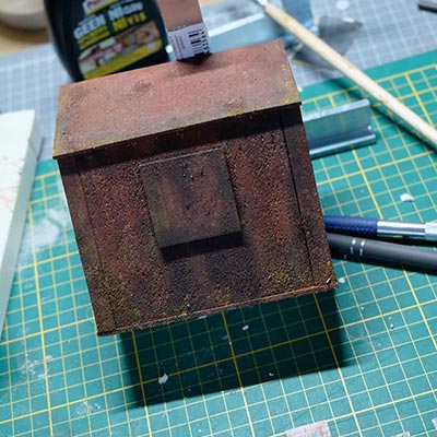 Les entailles, fissures et briques sont faites avec un fer à souder dont la lame est un "bistouri". La texture sur les briques est réalisée grâce à une boulette d'aluminium. La couleur toujours à base d'acrylique. Un peu de sable blanc pour donner l'effet de texture du salpêtre à la base des murs.