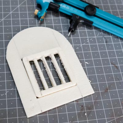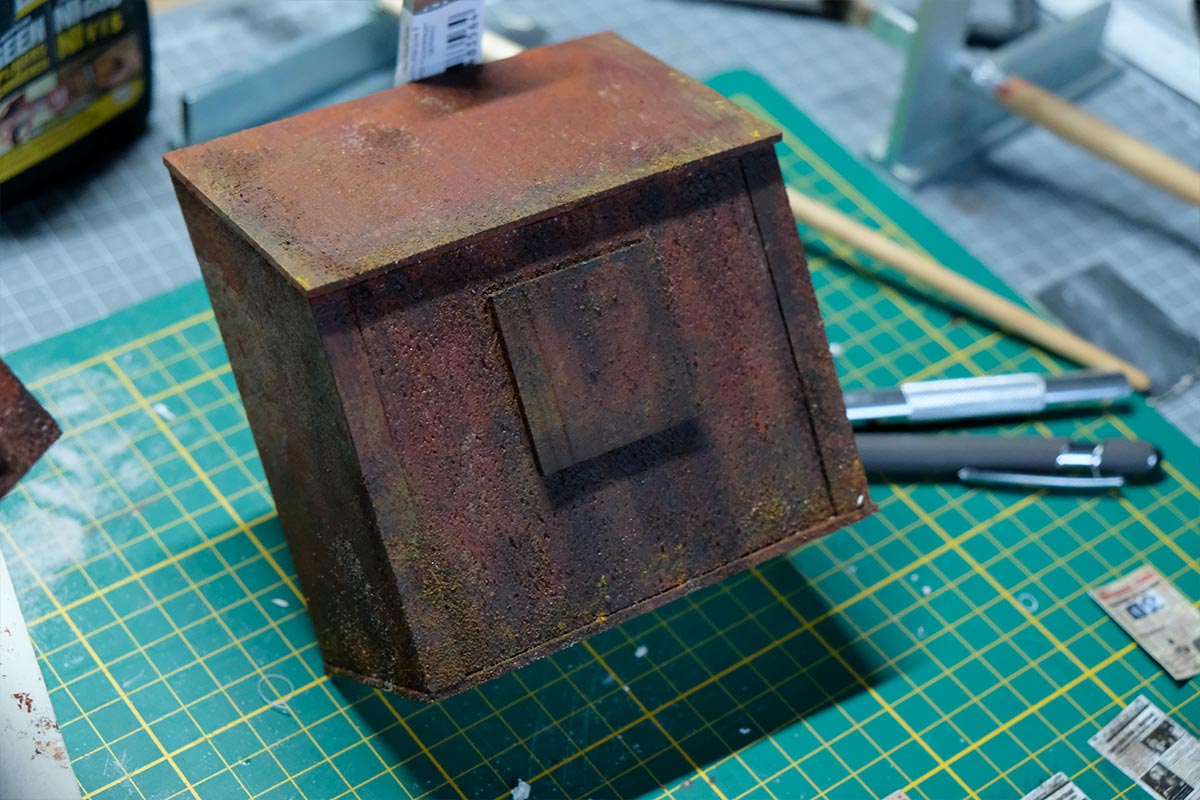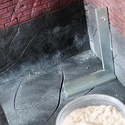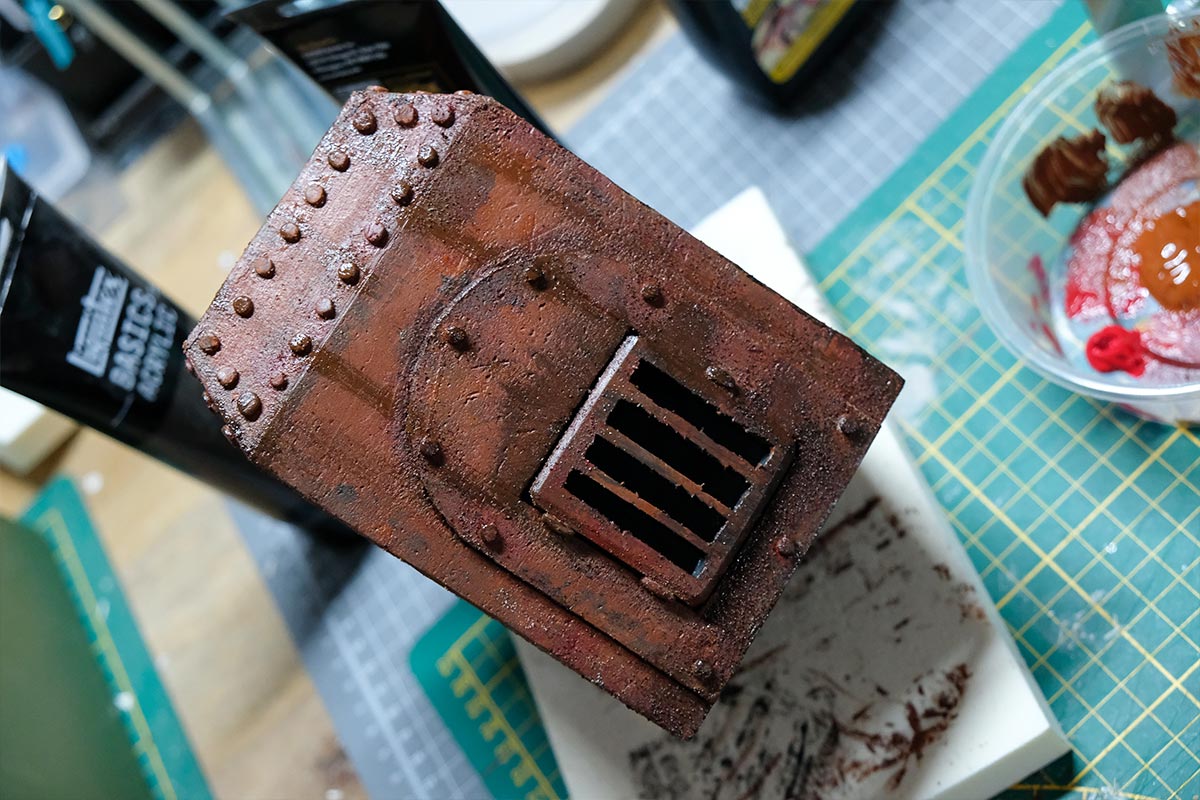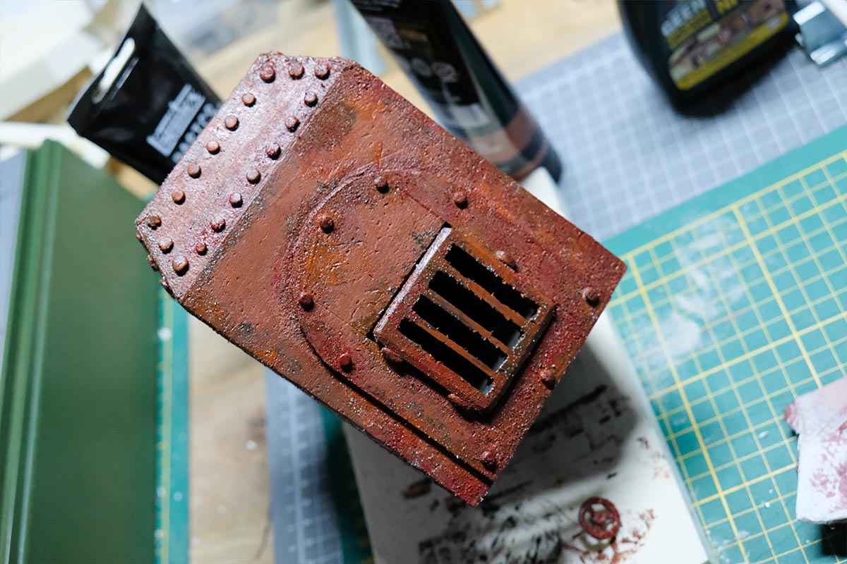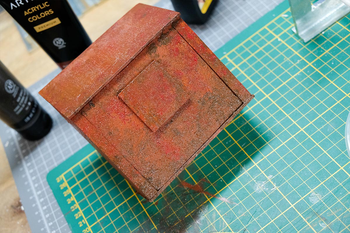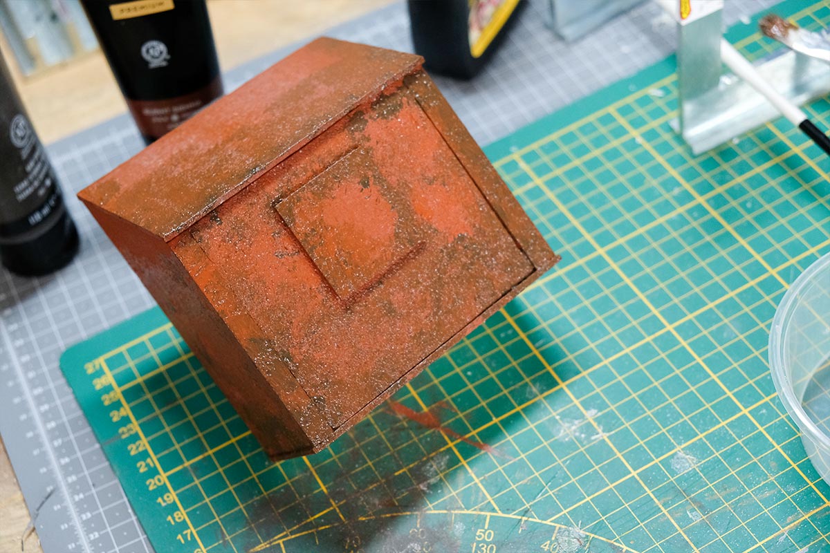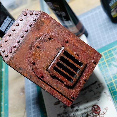 Les entailles, fissures et briques sont faites avec un fer à souder dont la lame est un "bistouri". La texture sur les briques est réalisée grâce à une boulette d'aluminium. La couleur toujours à base d'acrylique. Un peu de sable blanc pour donner l'effet de texture du salpêtre à la base des murs.