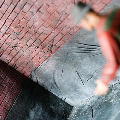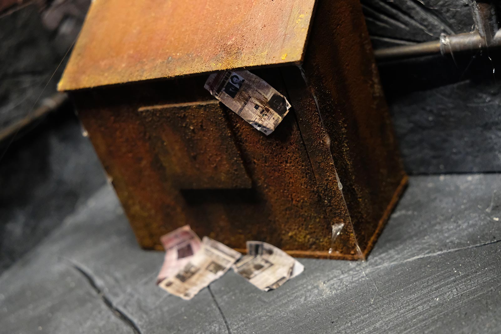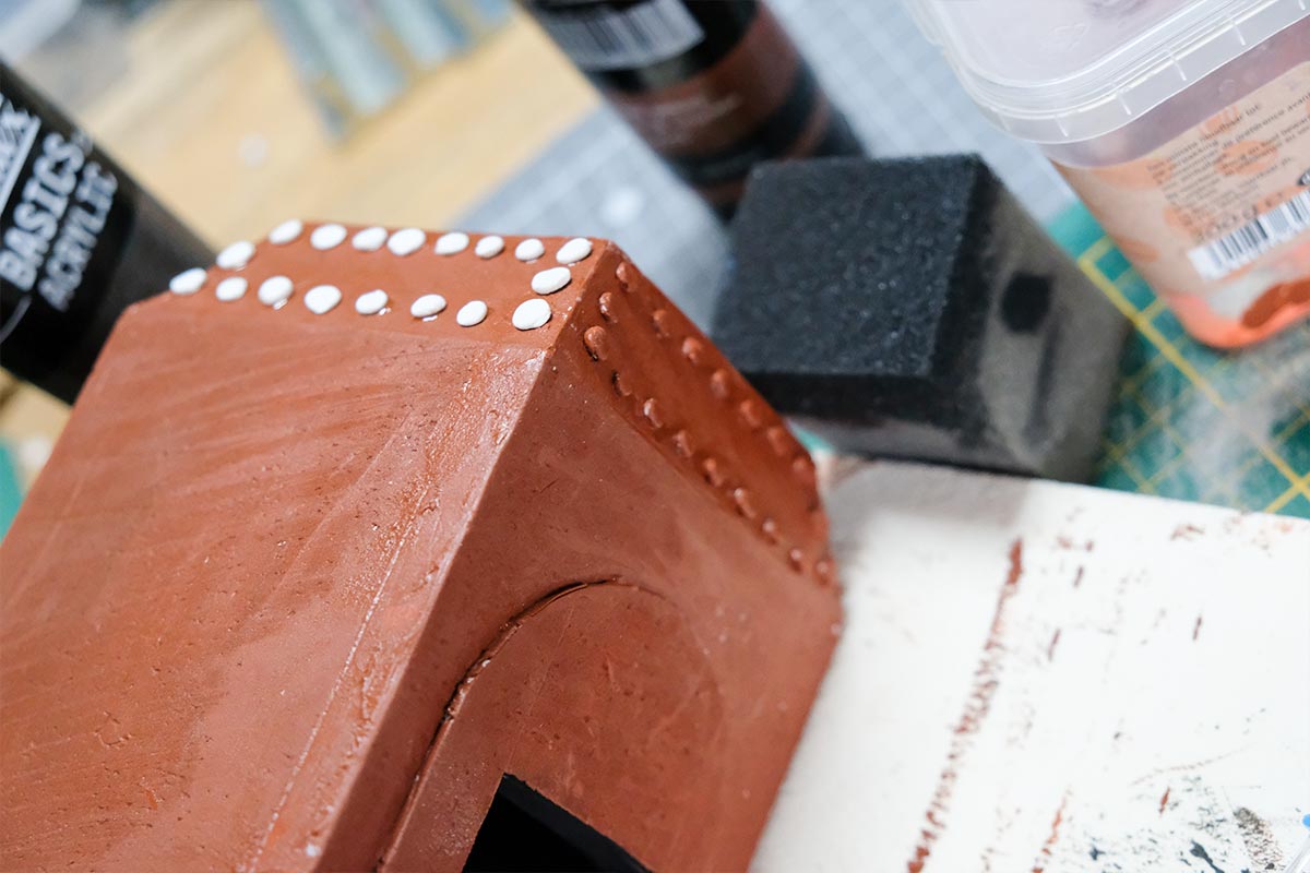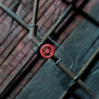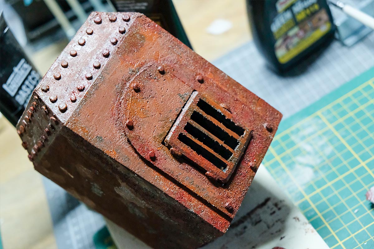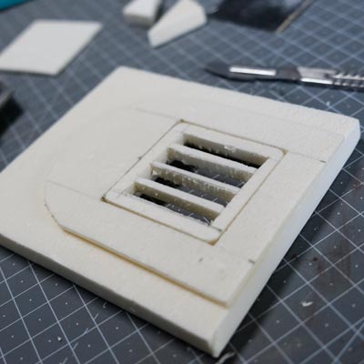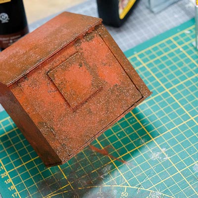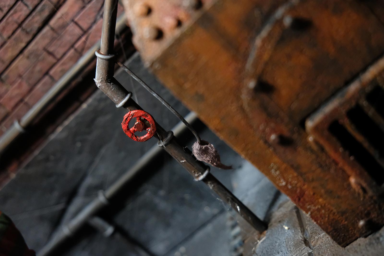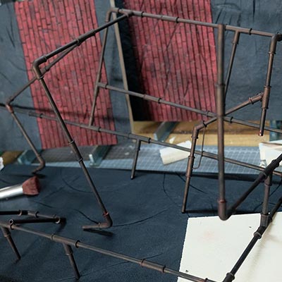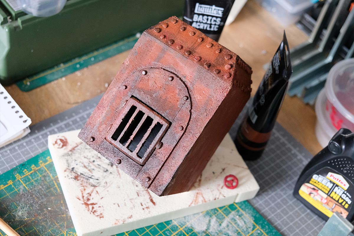 Les entailles, fissures et briques sont faites avec un fer à souder dont la lame est un "bistouri". La texture sur les briques est réalisée grâce à une boulette d'aluminium. La couleur toujours à base d'acrylique. Un peu de sable blanc pour donner l'effet de texture du salpêtre à la base des murs.