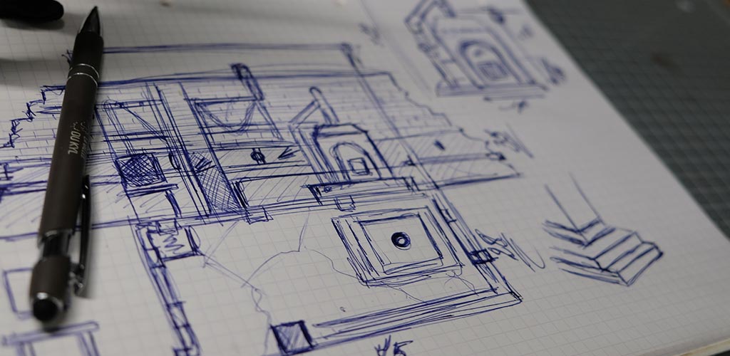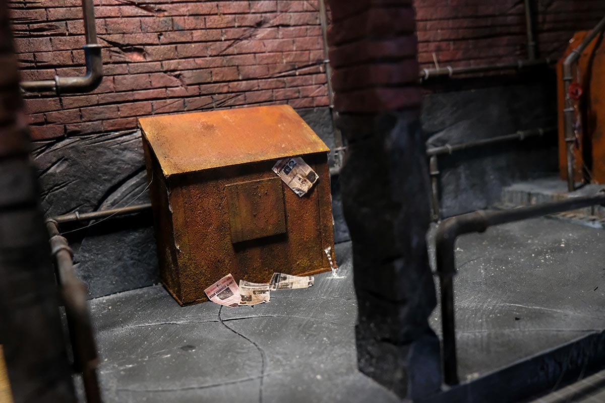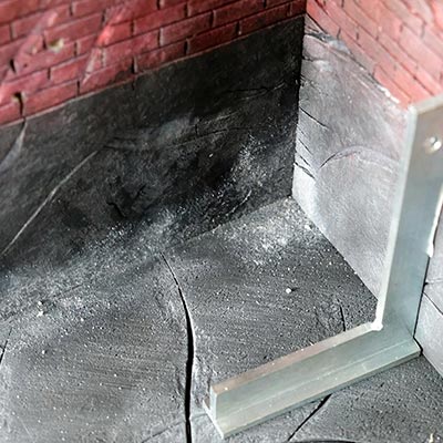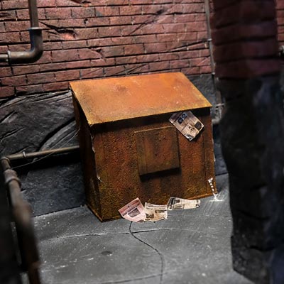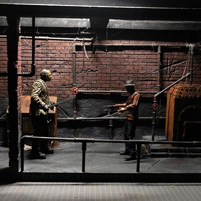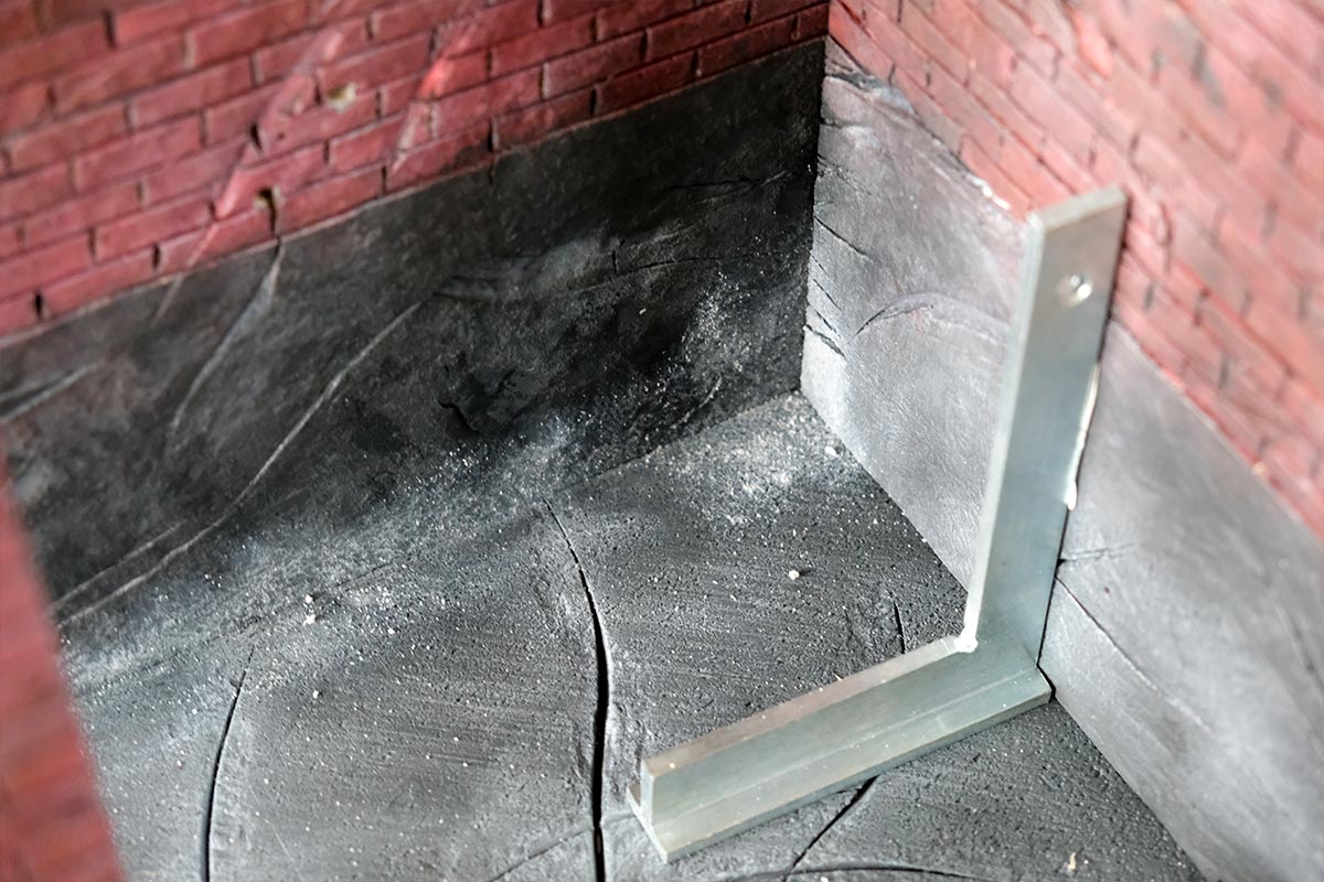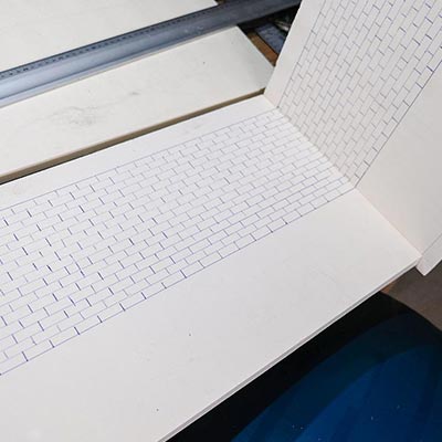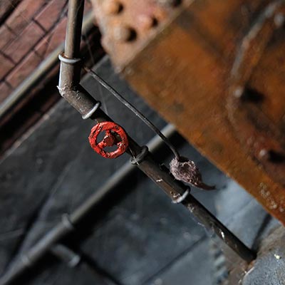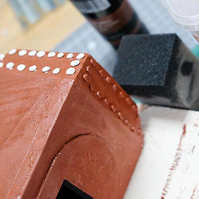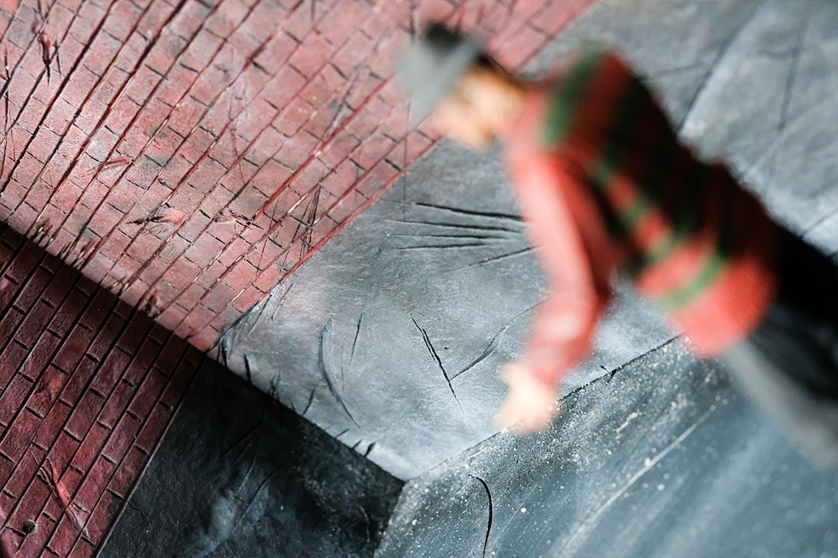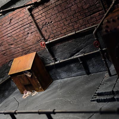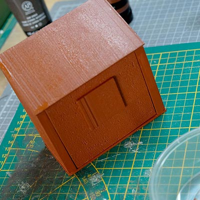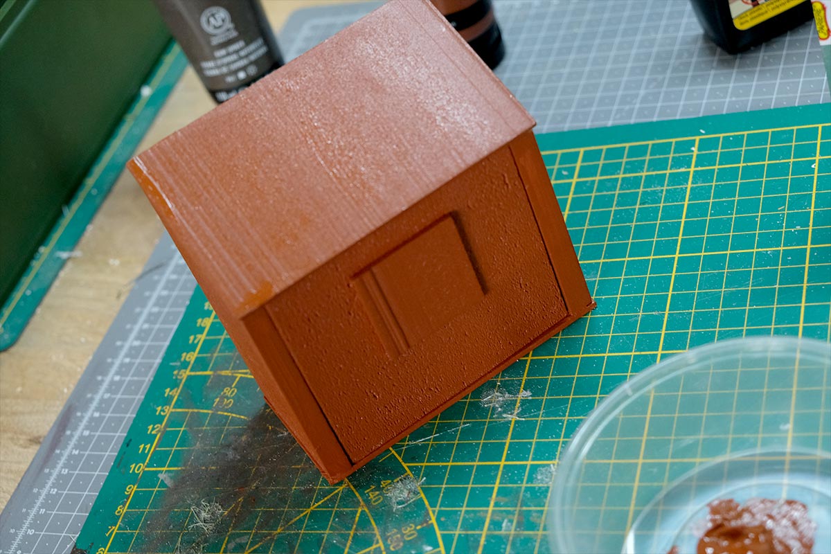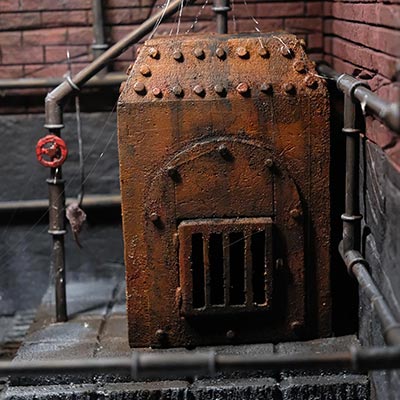 Les entailles, fissures et briques sont faites avec un fer à souder dont la lame est un "bistouri". La texture sur les briques est réalisée grâce à une boulette d'aluminium. La couleur toujours à base d'acrylique. Un peu de sable blanc pour donner l'effet de texture du salpêtre à la base des murs.