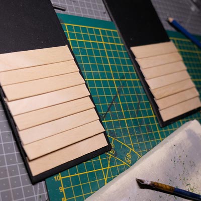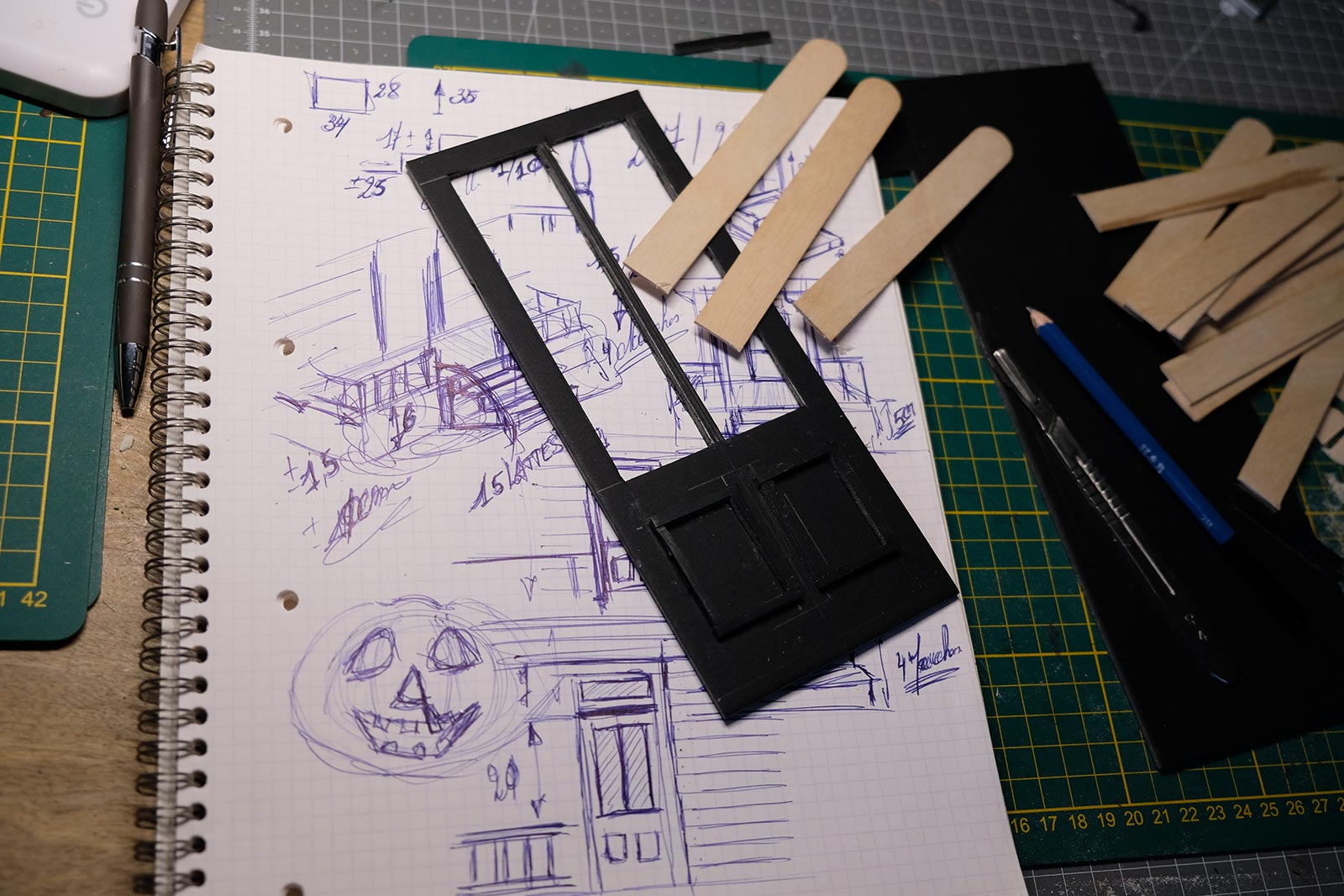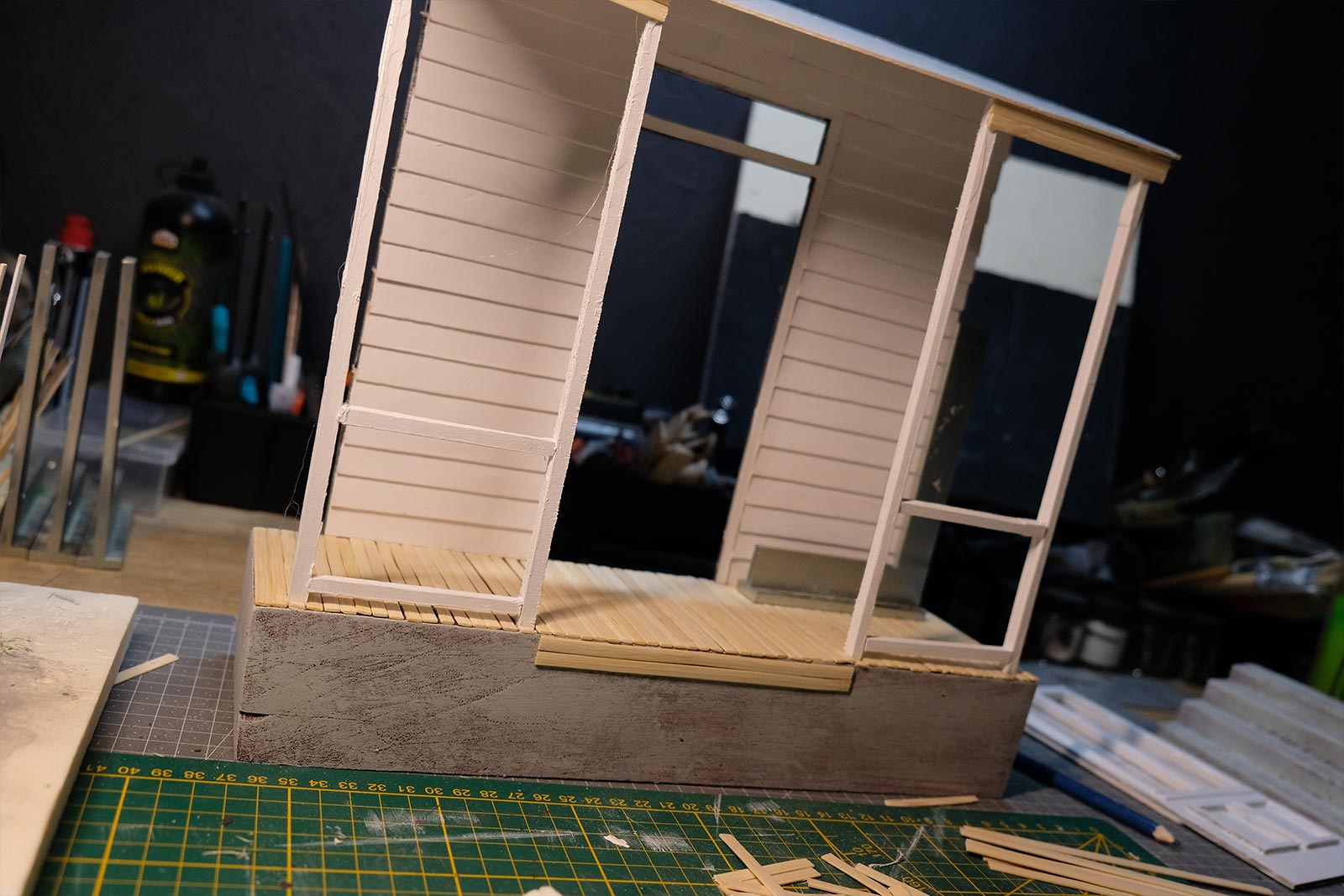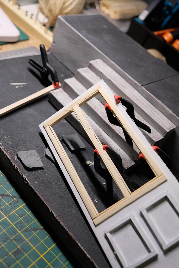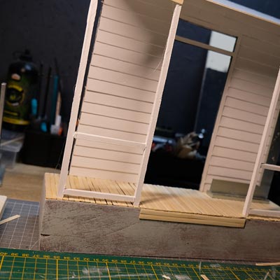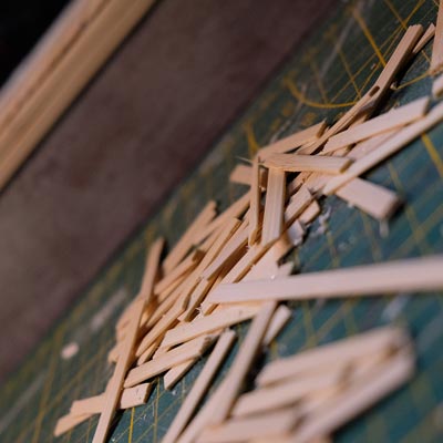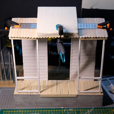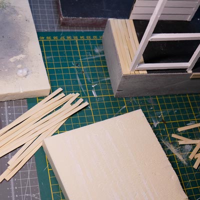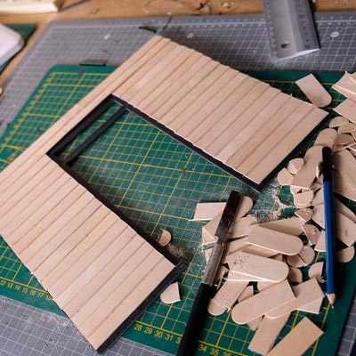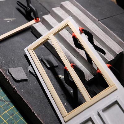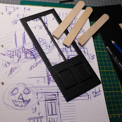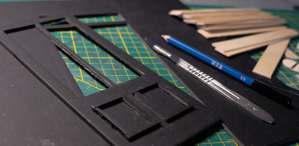 Première étape, la préparation de la devanture de la maison des “Myers”. Du carton plume, une feuille de balsa et des bâtonnets de glaces. Latte, crayon, cutter et colle à bois pour bien débuter.