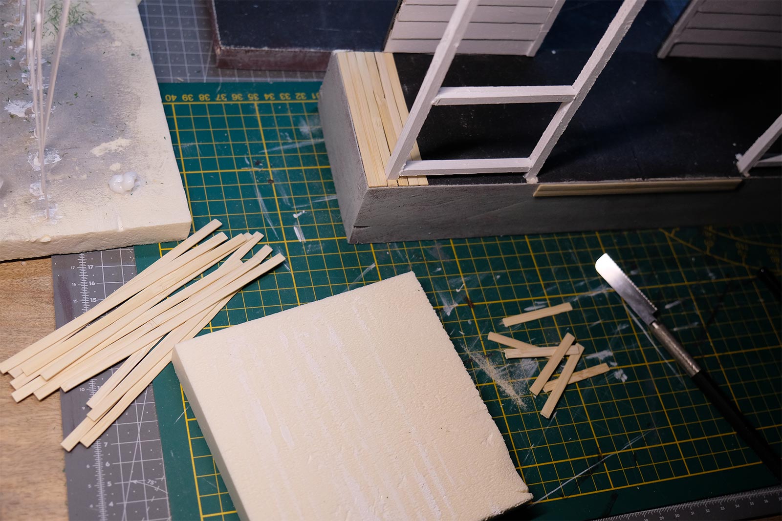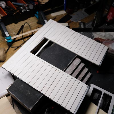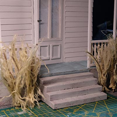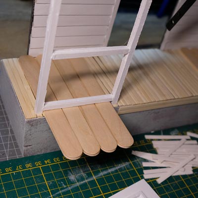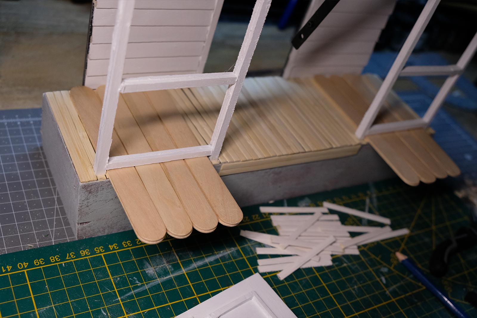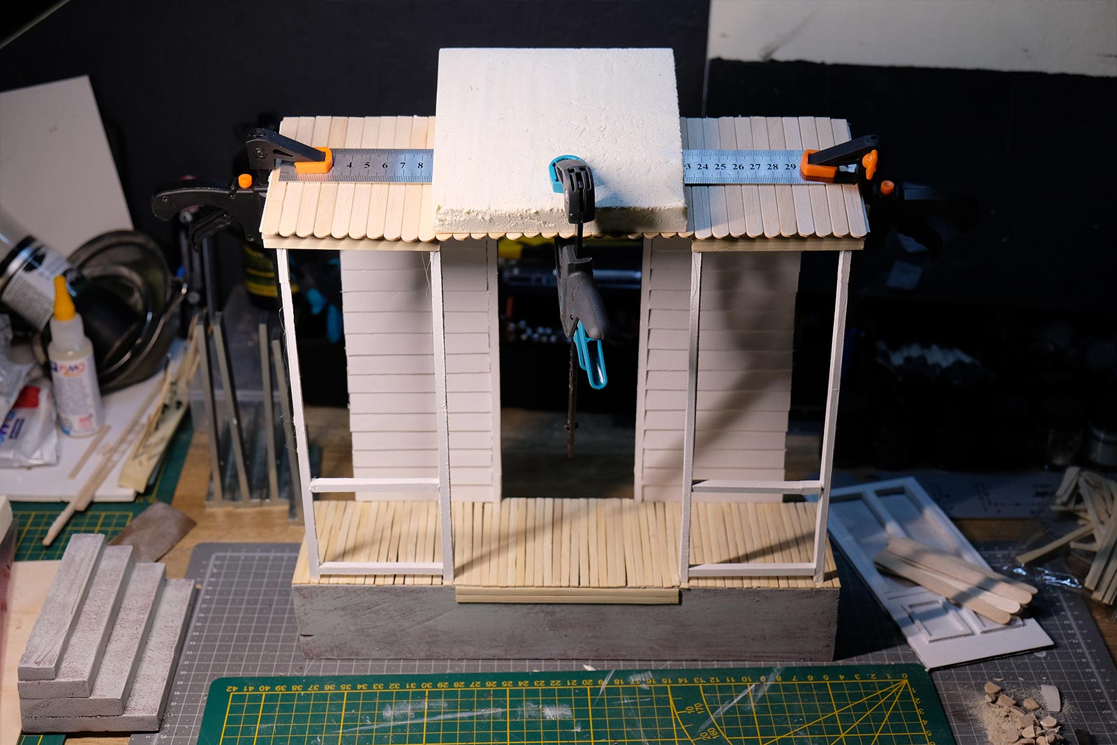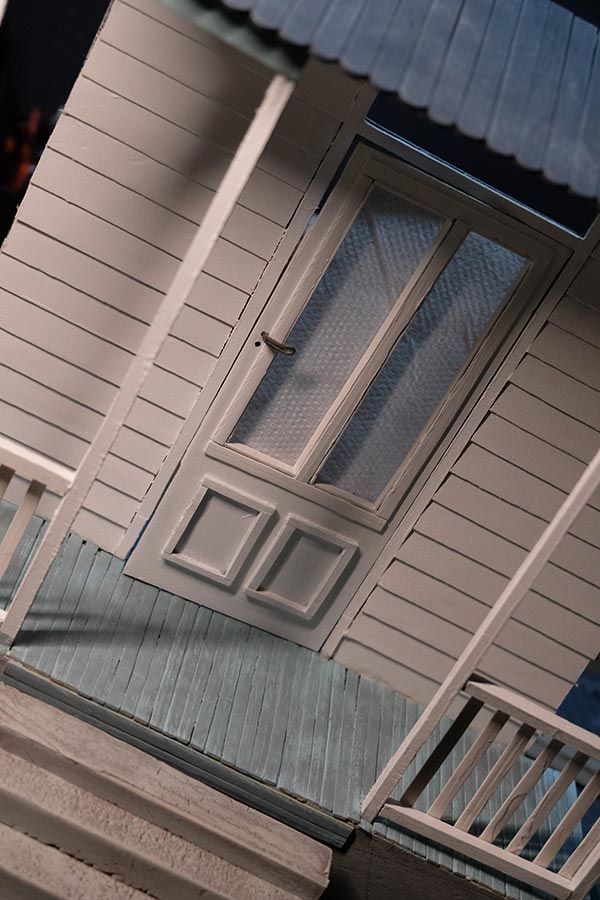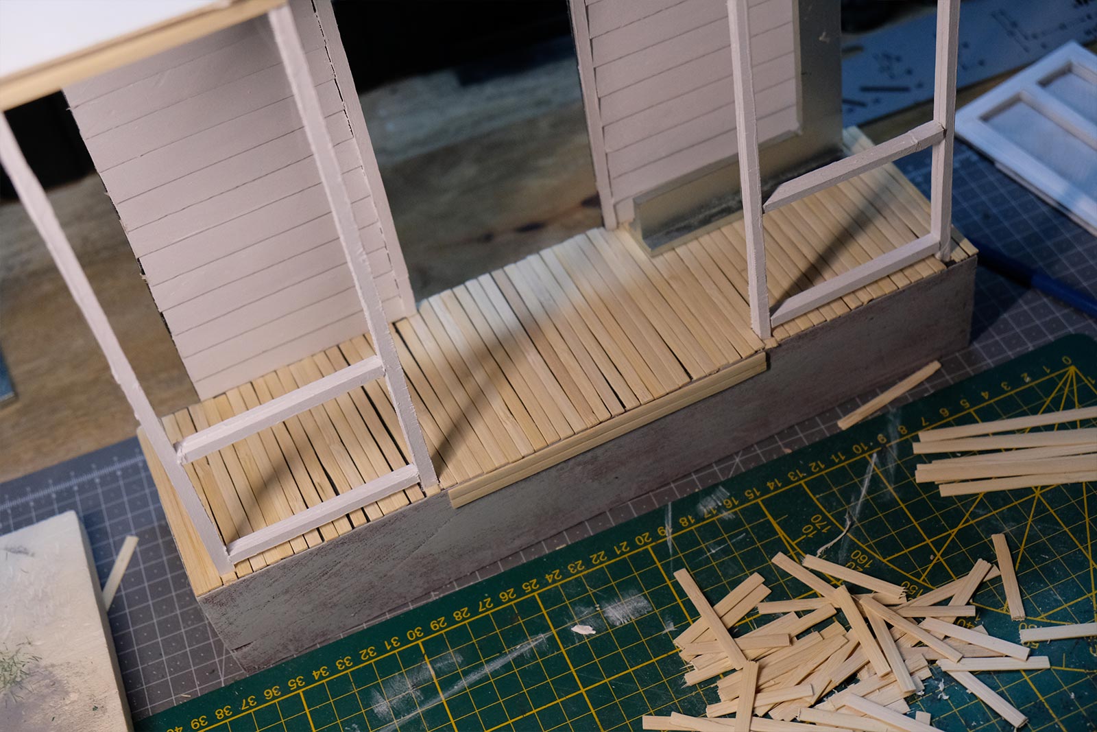 Première étape, la préparation de la devanture de la maison des “Myers”. Du carton plume, une feuille de balsa et des bâtonnets de glaces. Latte, crayon, cutter et colle à bois pour bien débuter.