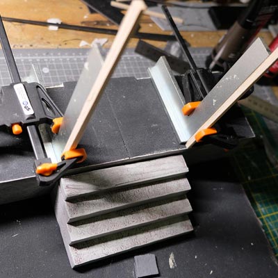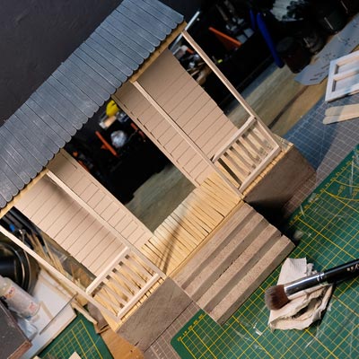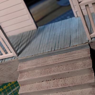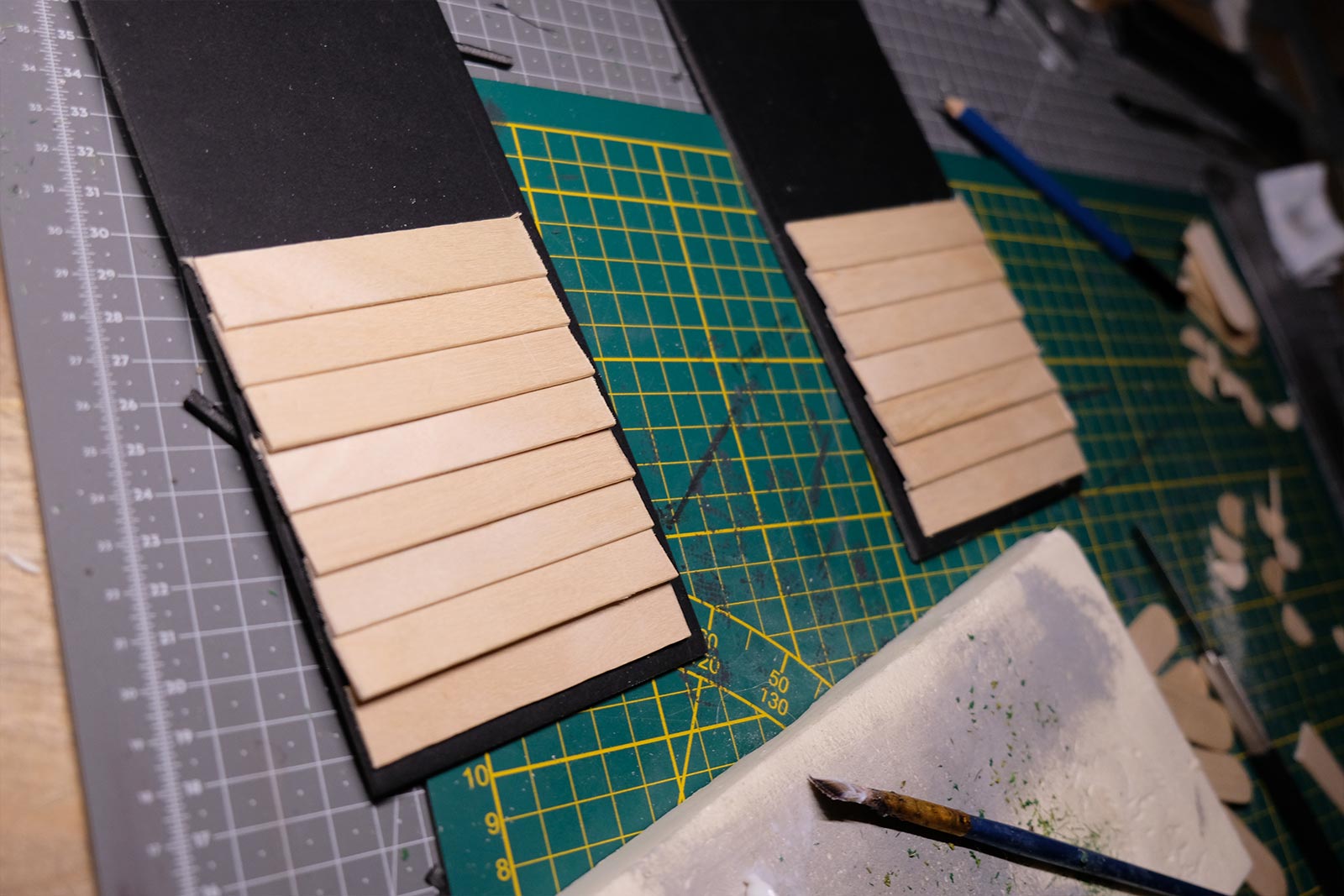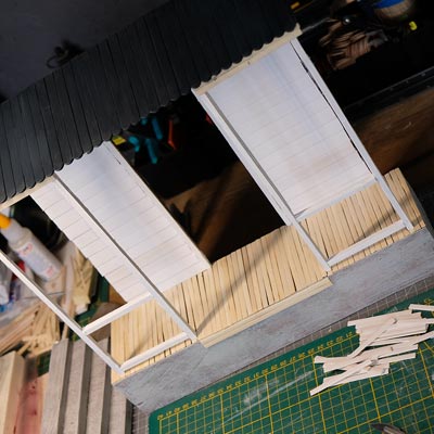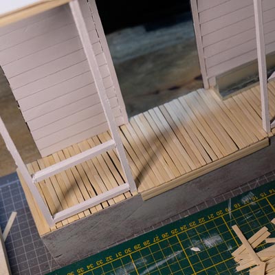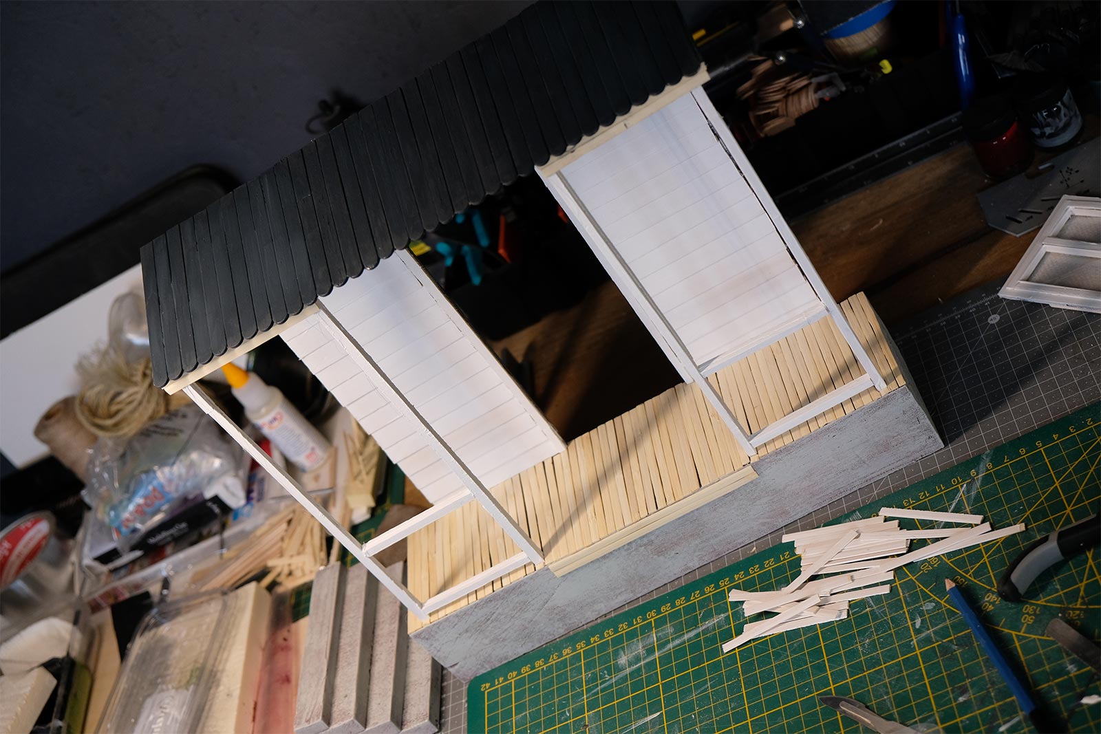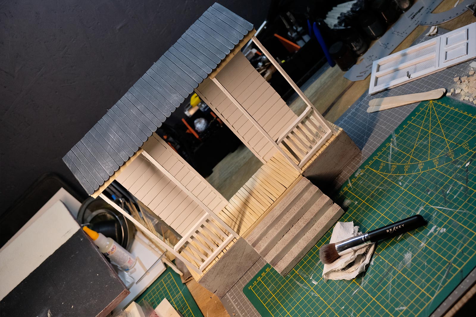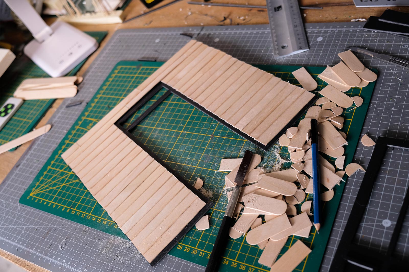 Première étape, la préparation de la devanture de la maison des “Myers”. Du carton plume, une feuille de balsa et des bâtonnets de glaces. Latte, crayon, cutter et colle à bois pour bien débuter.