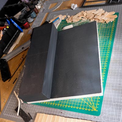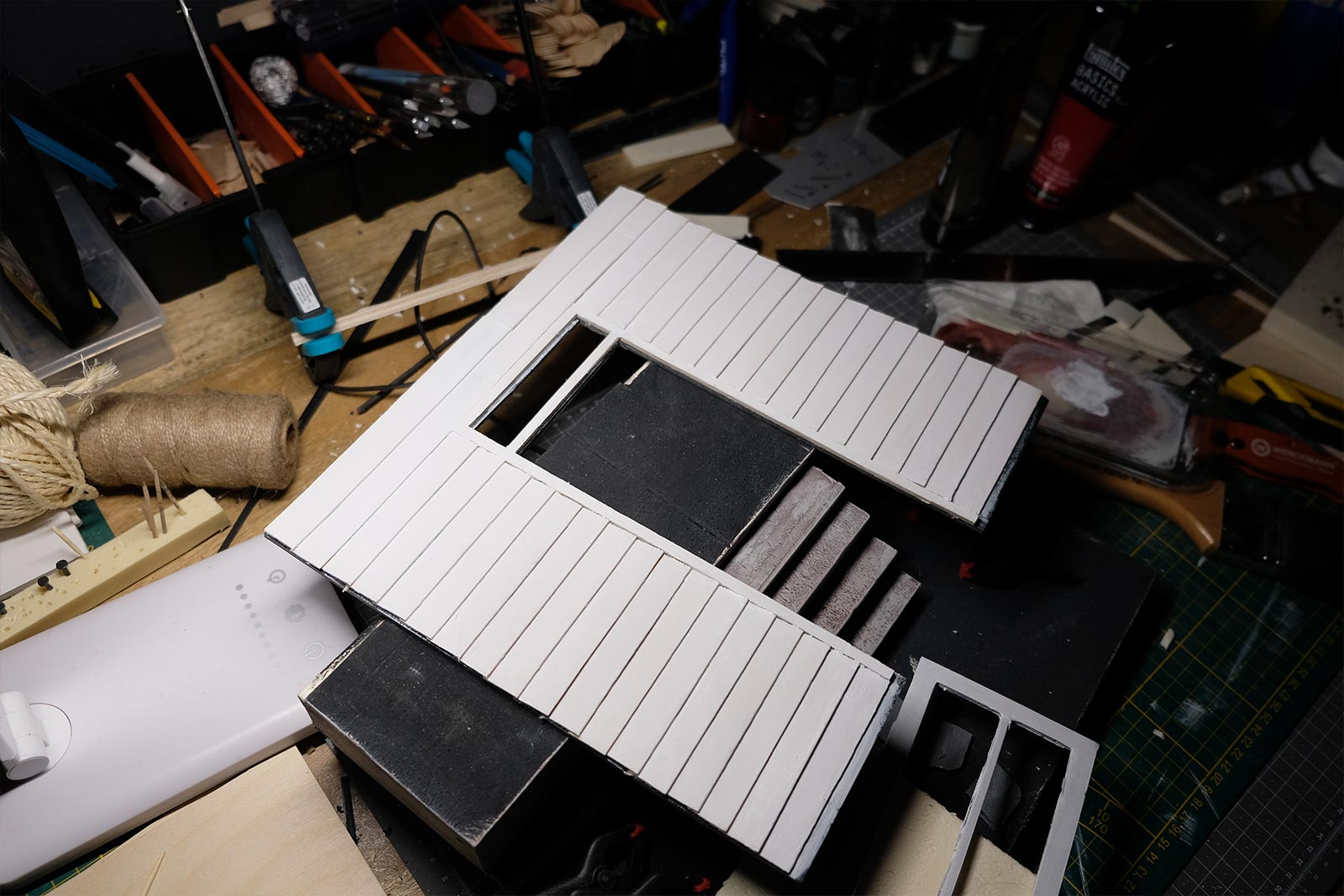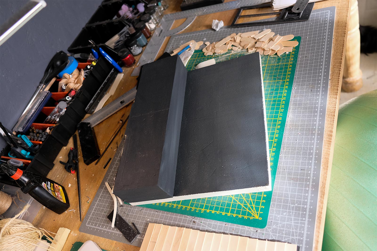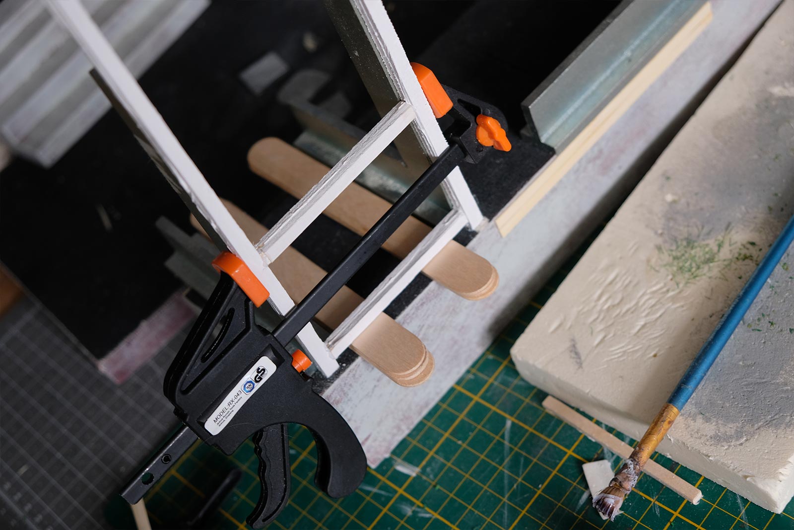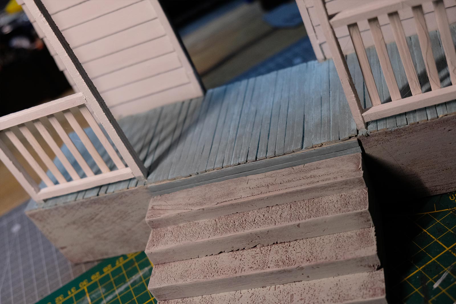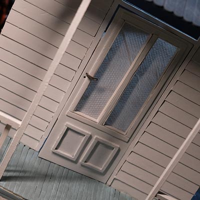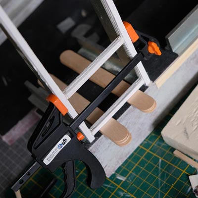 Première étape, la préparation de la devanture de la maison des “Myers”. Du carton plume, une feuille de balsa et des bâtonnets de glaces. Latte, crayon, cutter et colle à bois pour bien débuter.