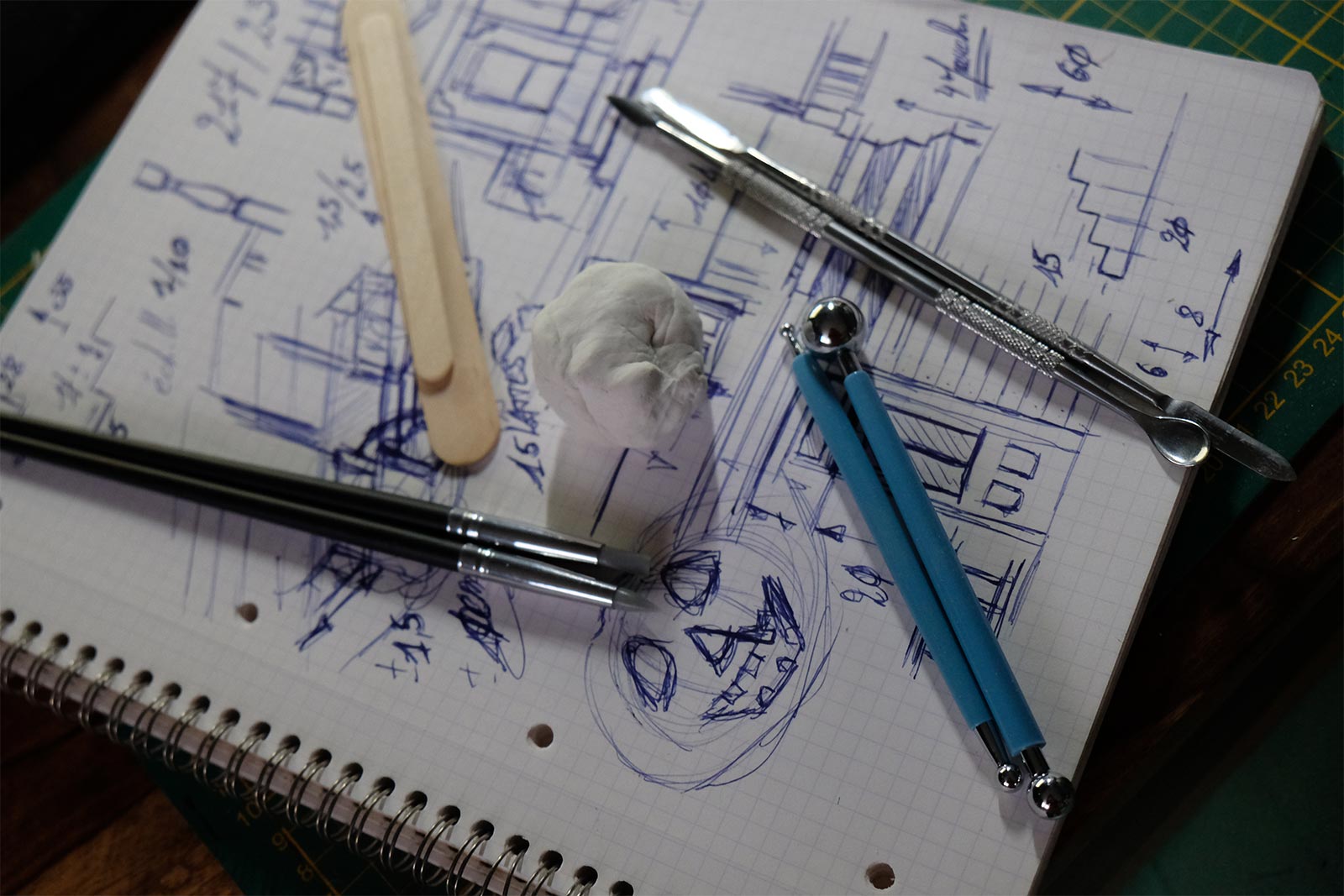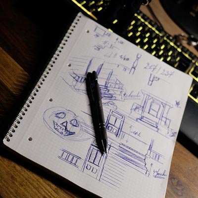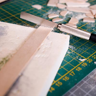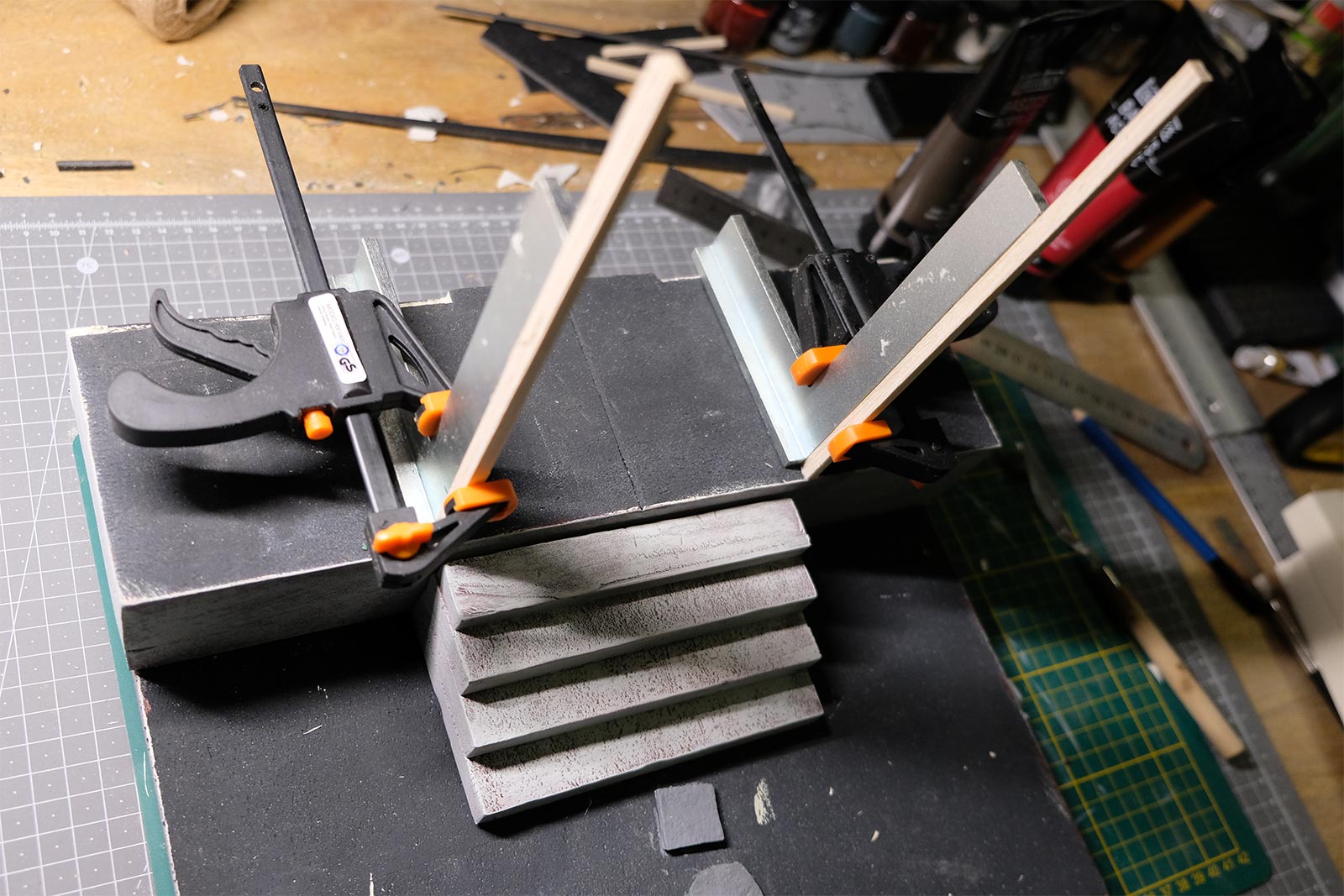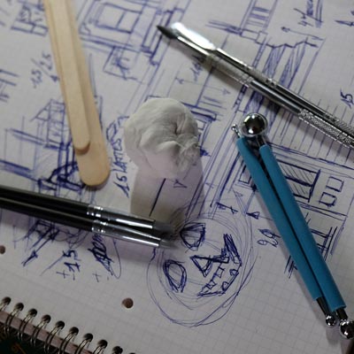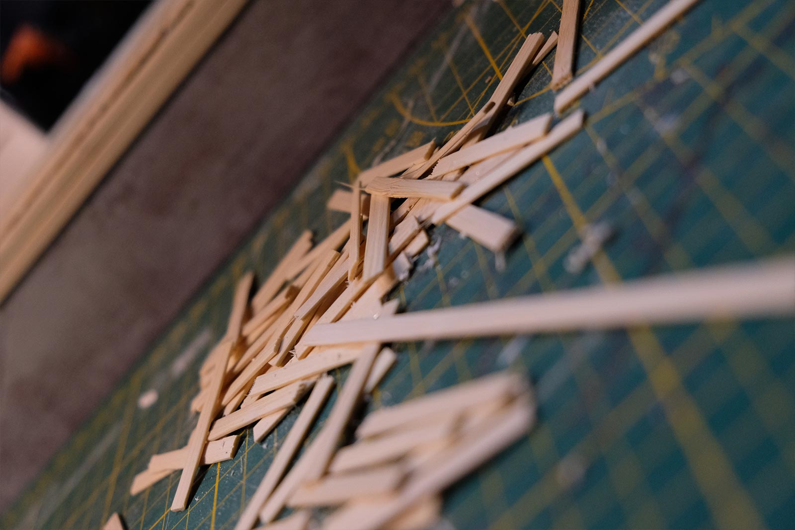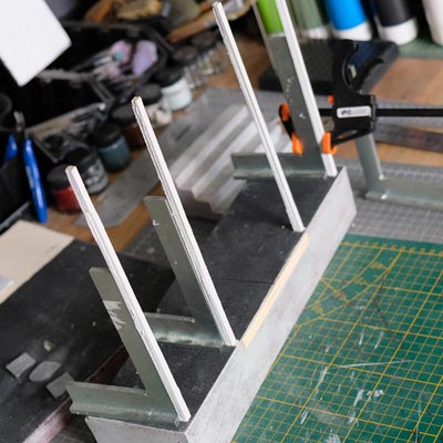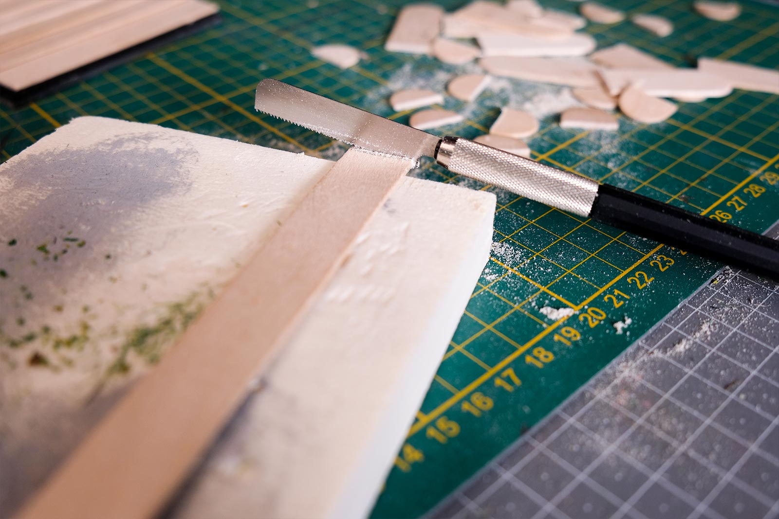 Première étape, la préparation de la devanture de la maison des “Myers”. Du carton plume, une feuille de balsa et des bâtonnets de glaces. Latte, crayon, cutter et colle à bois pour bien débuter.