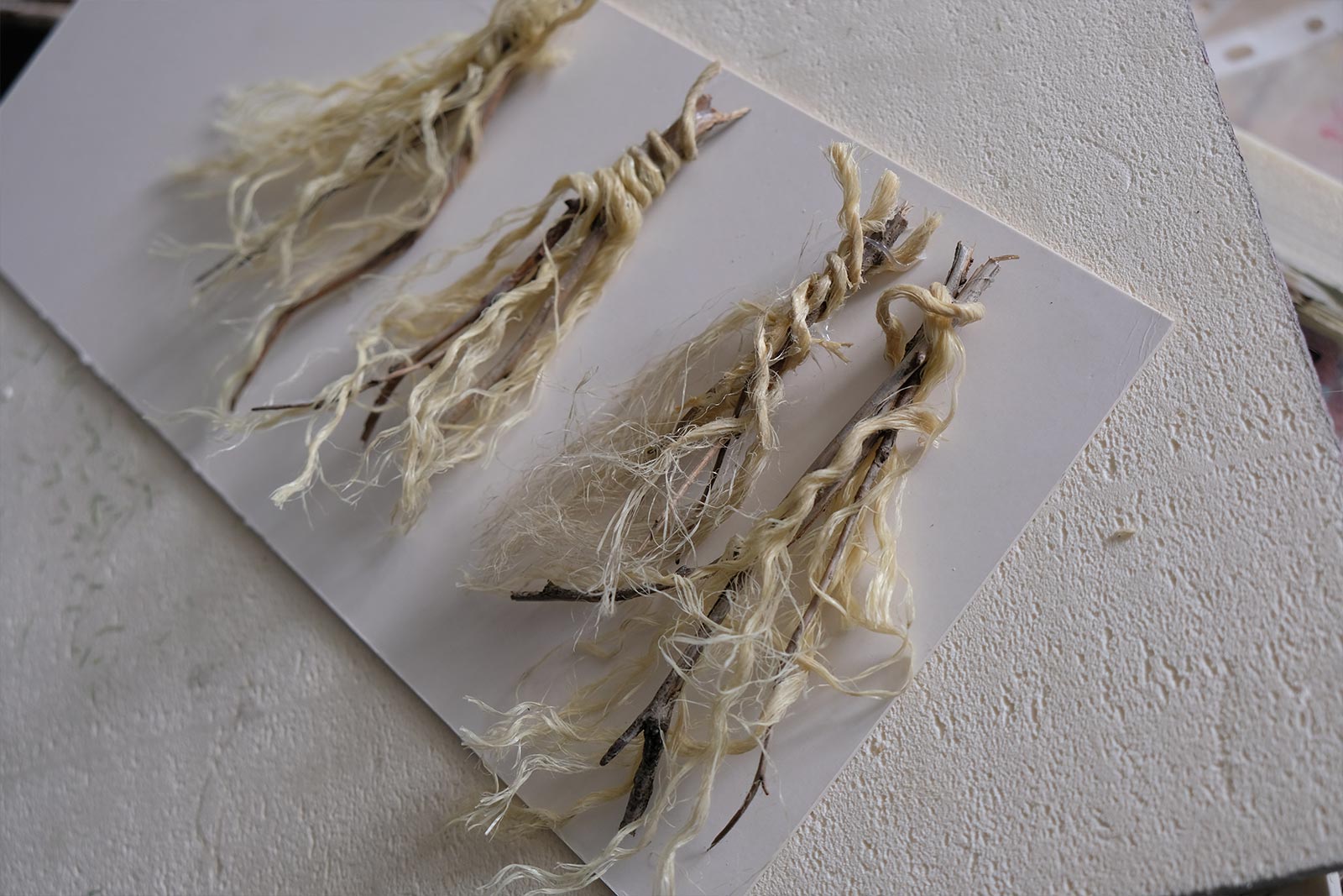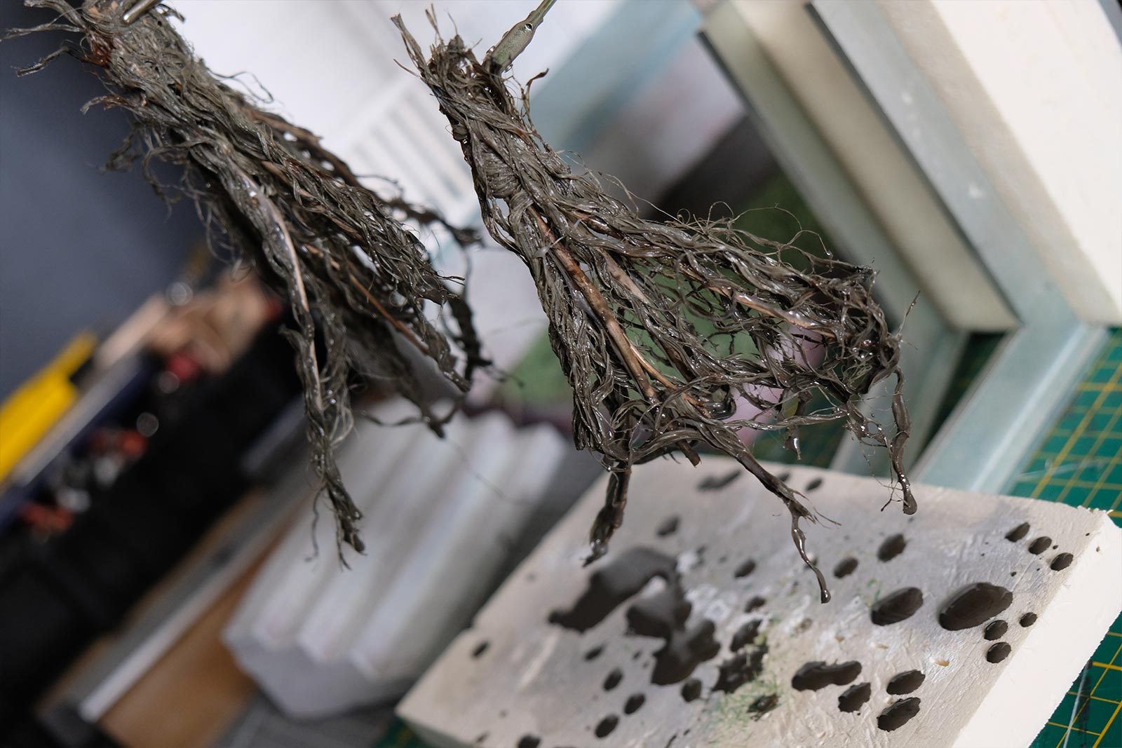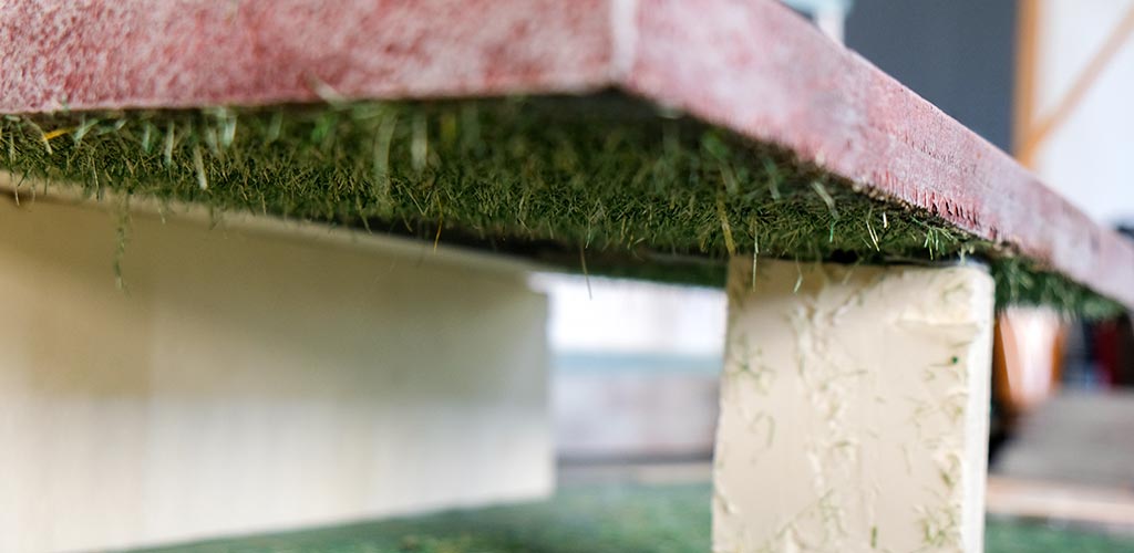Au niveau du gazon, celle-ci est créée à partir de corde de jus. On coupe des bout de ficelle que l’on mélange ensuite avec de la peinture acrylique. Elle sera ensuite fixée grâce à un applicateur d’herbes fait maison. Le support sera placé ensuite à l’envers durant 24 heures.
