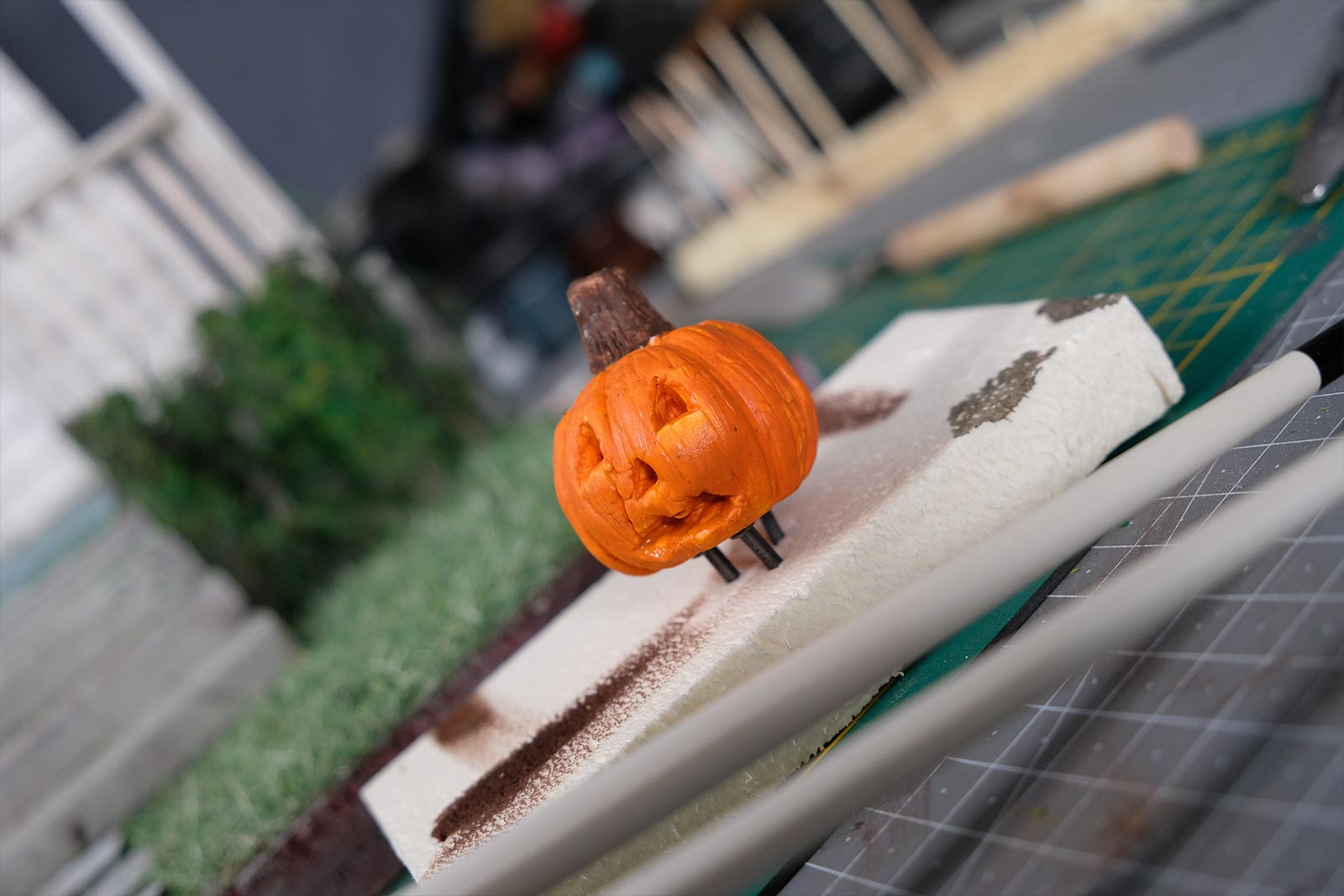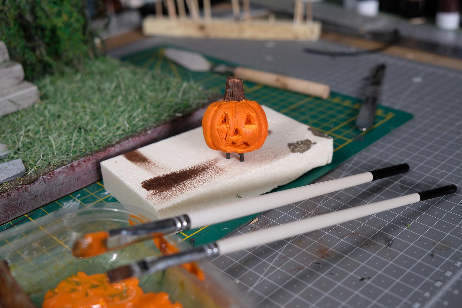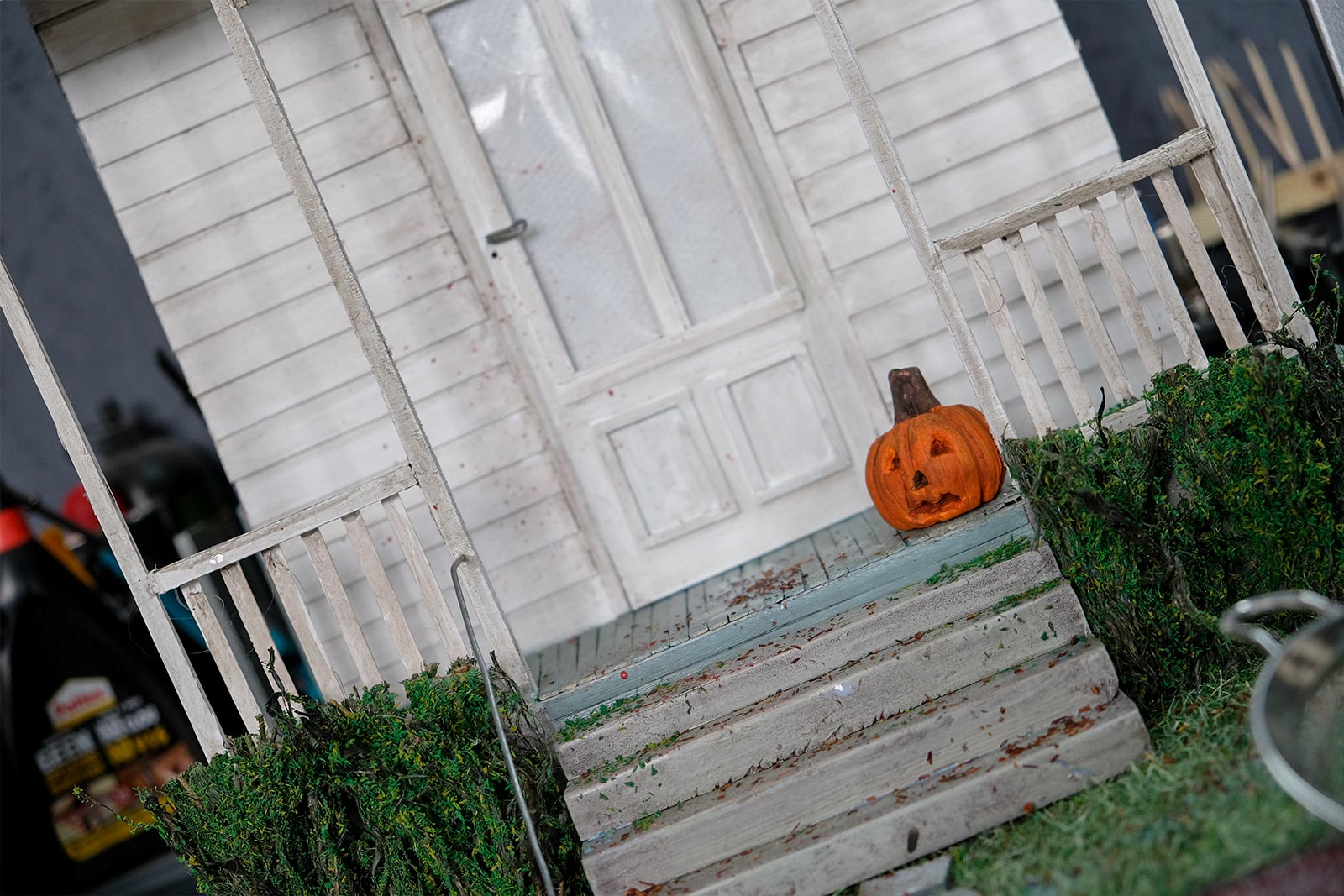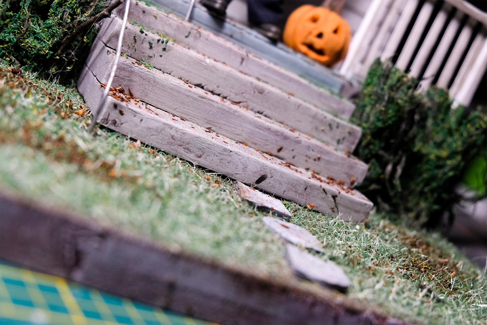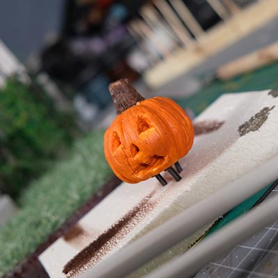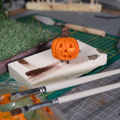 On continue, on parle “effet”. De la peinture en passant par la création du gazon sans oublier la citrouille ! L’assemblage continue son petit bout de chemin.