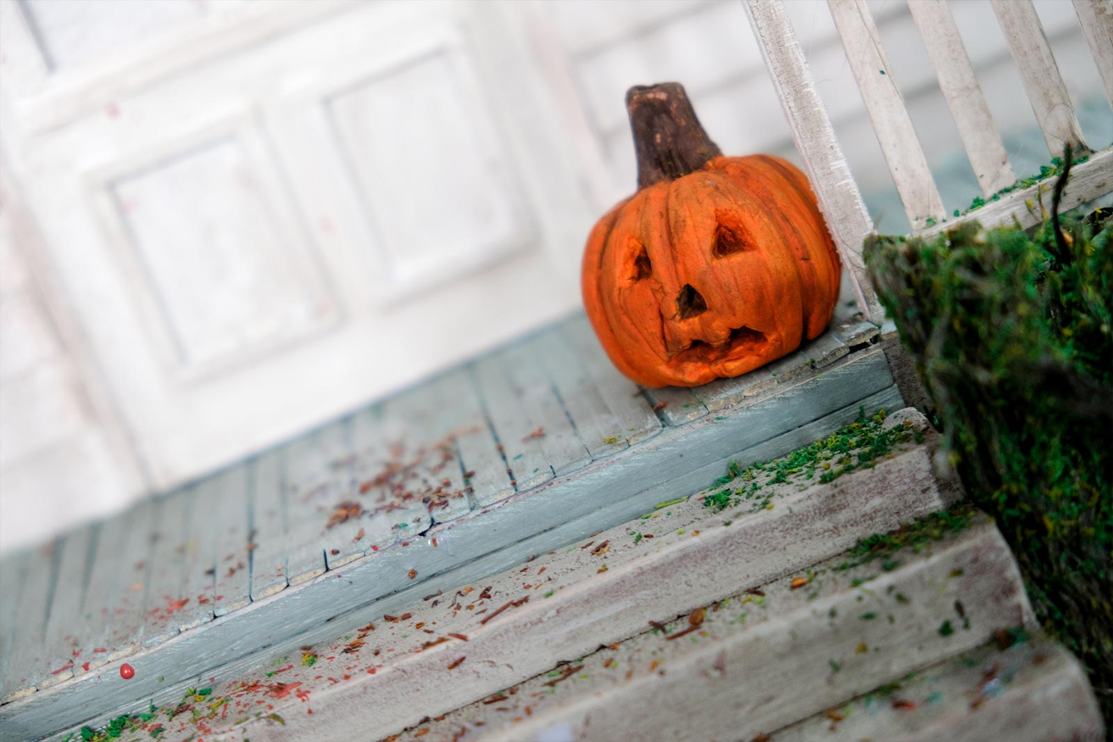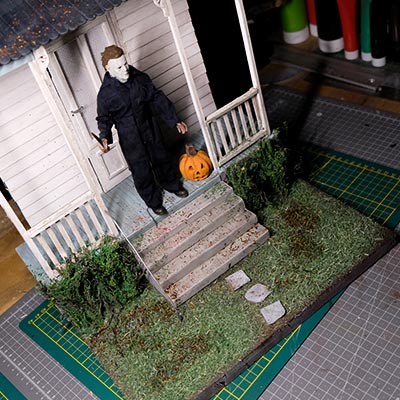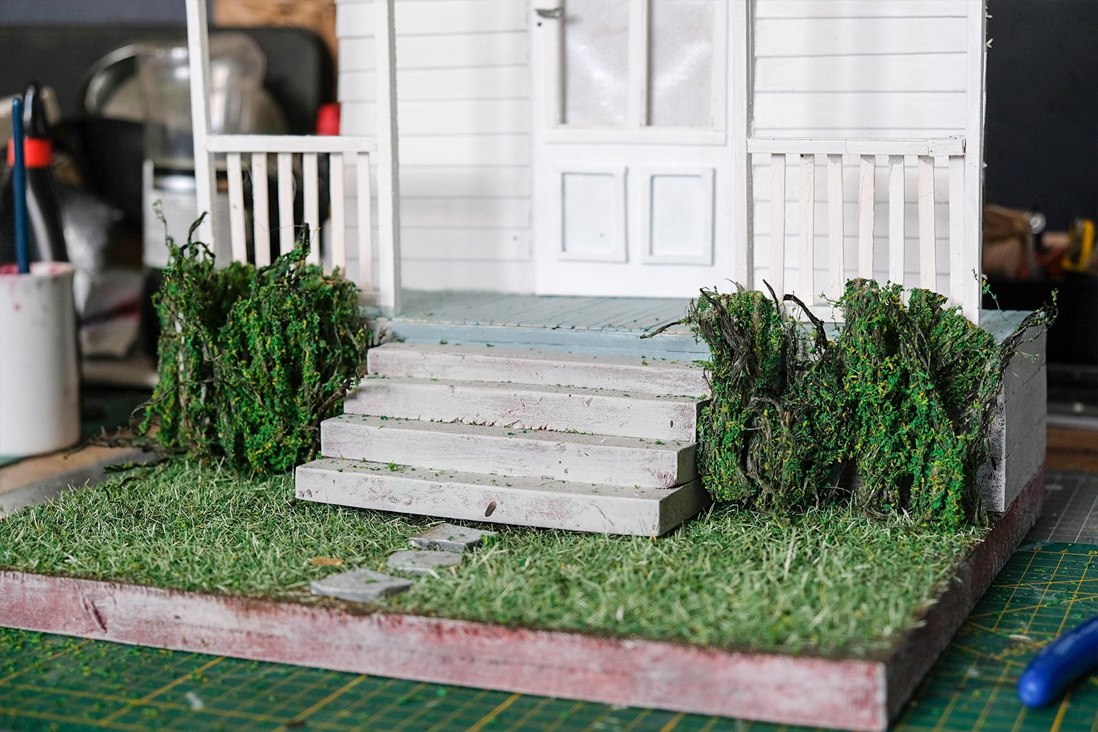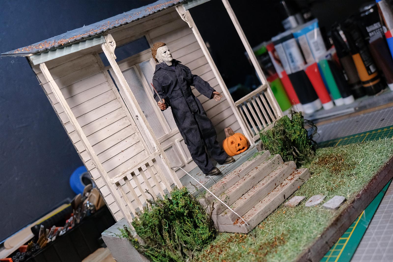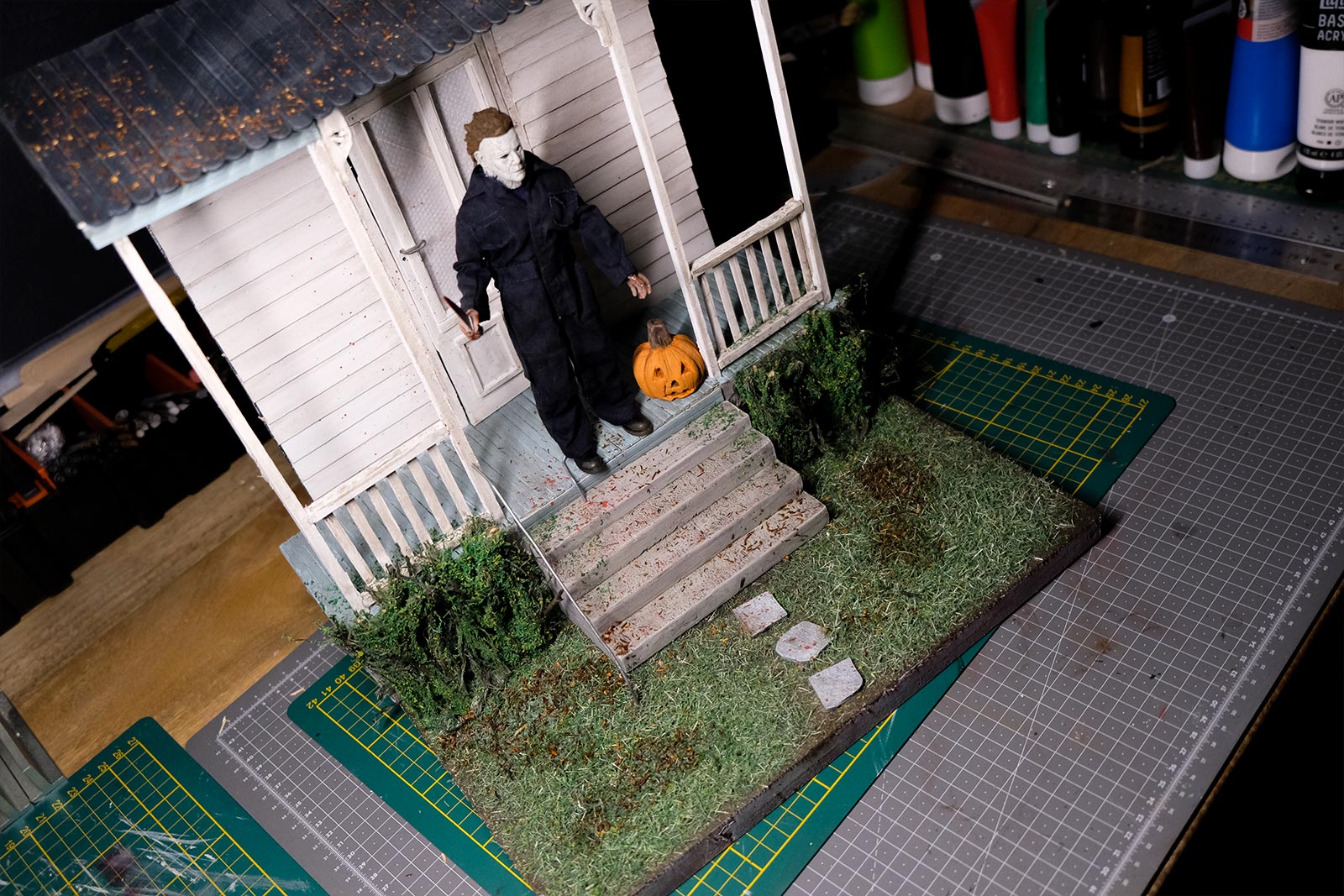 On continue, on parle “effet”. De la peinture en passant par la création du gazon sans oublier la citrouille ! L’assemblage continue son petit bout de chemin.