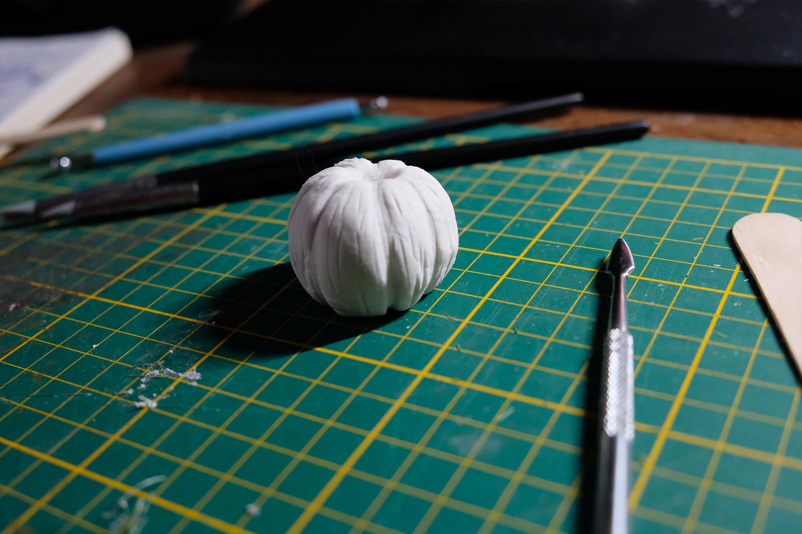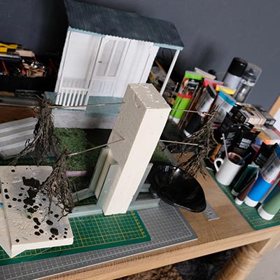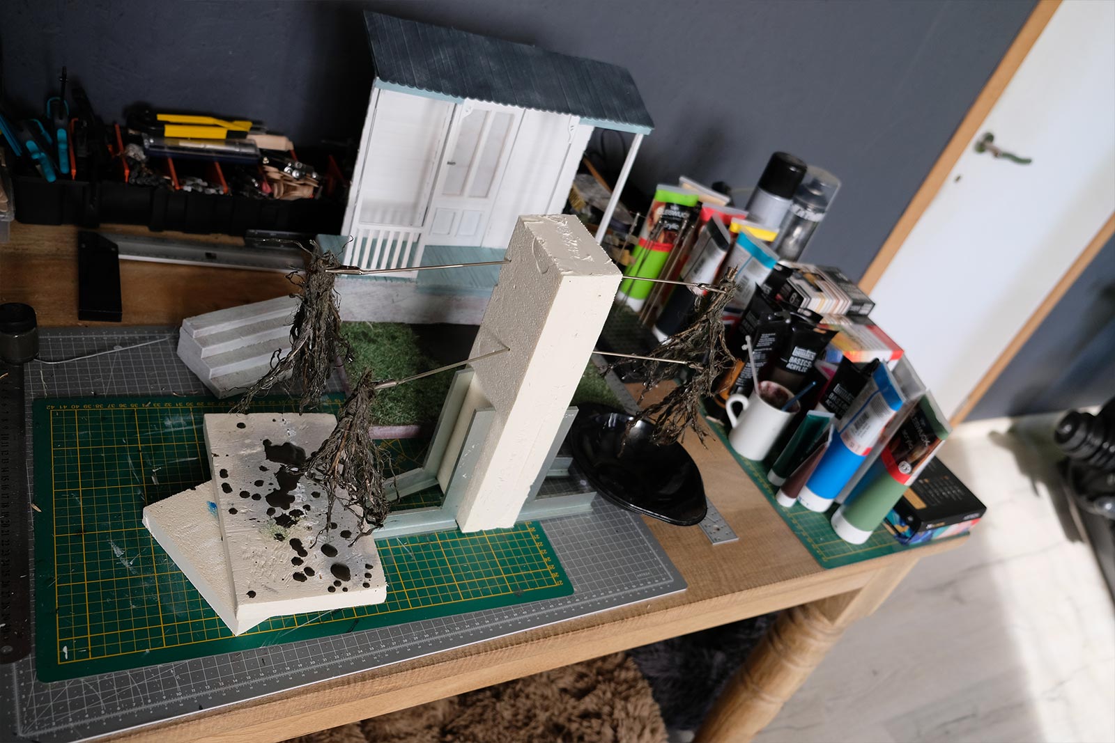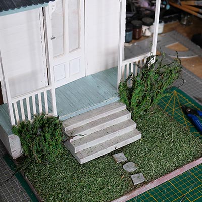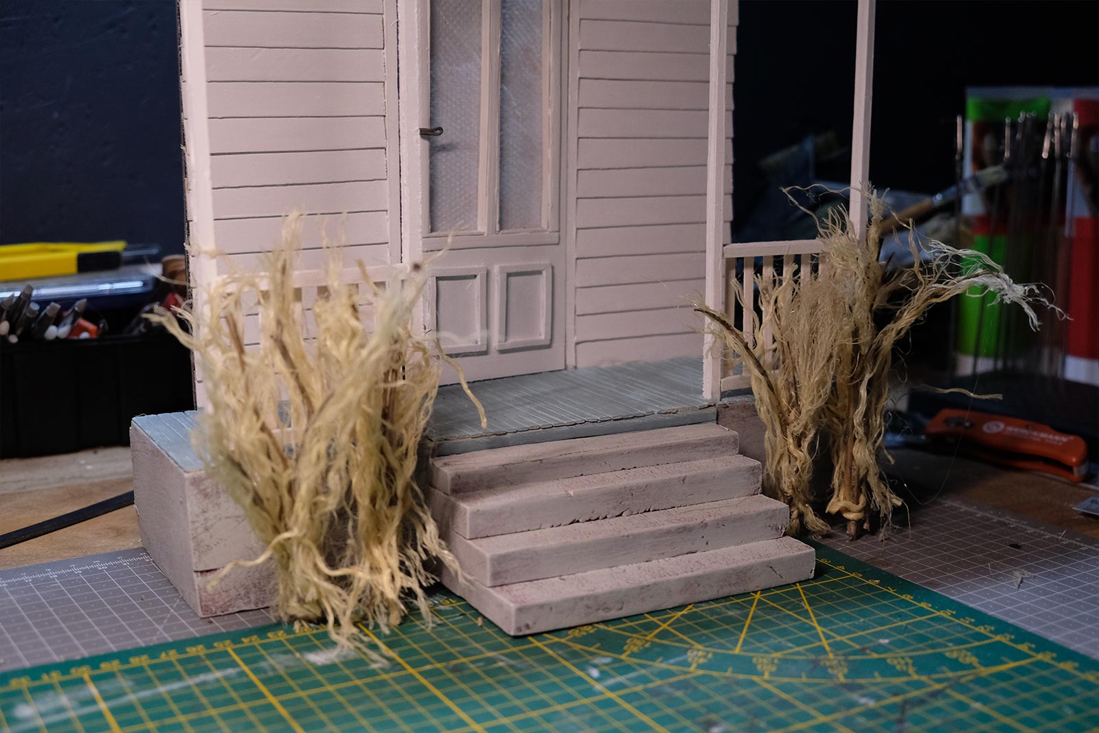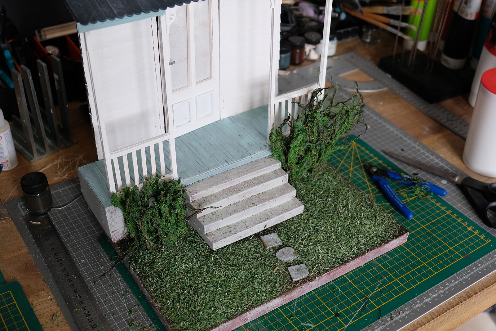 On continue, on parle “effet”. De la peinture en passant par la création du gazon sans oublier la citrouille ! L’assemblage continue son petit bout de chemin.