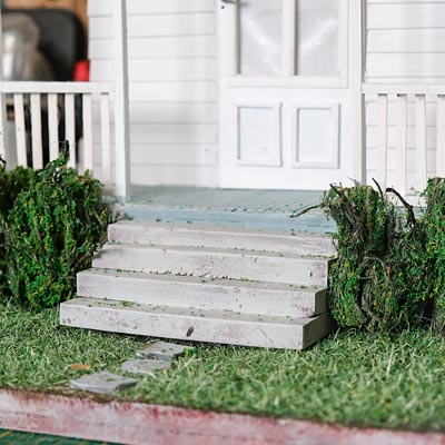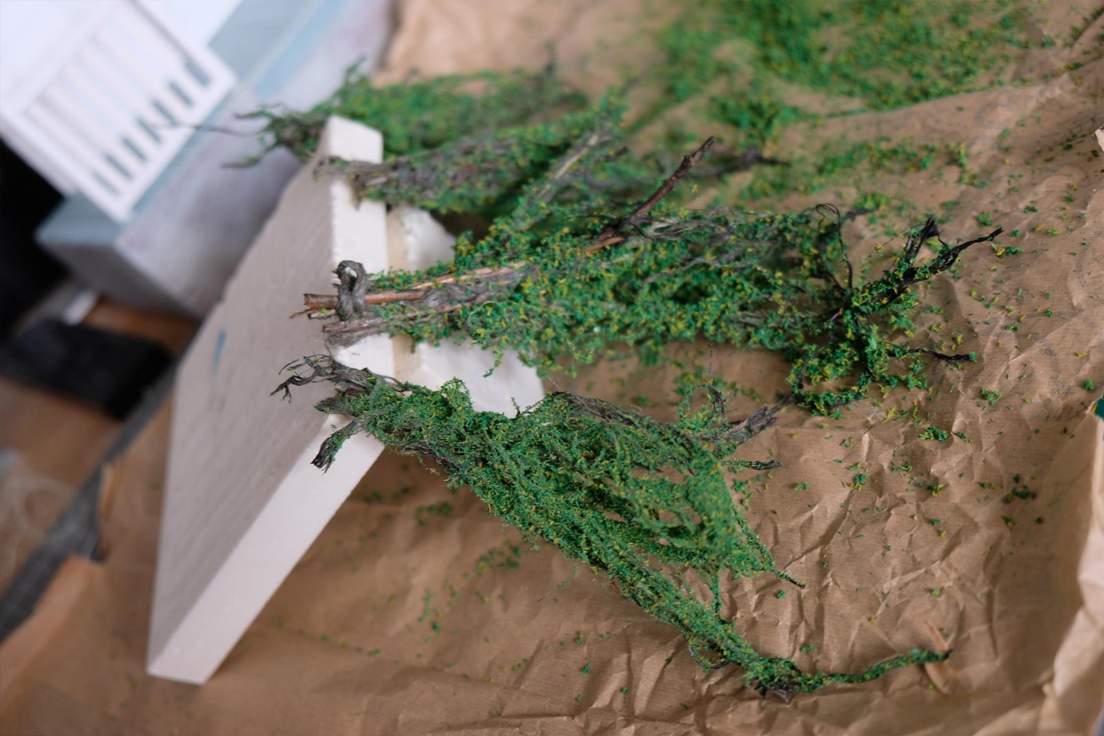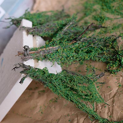 Pour les buissons, ils sont créés à partir de code de jus et de sciure de bois. La sciure de bois est mélangée dans différents mélanges de couleurs acryliques afin d’obtenir des teintes différentes.