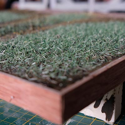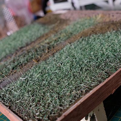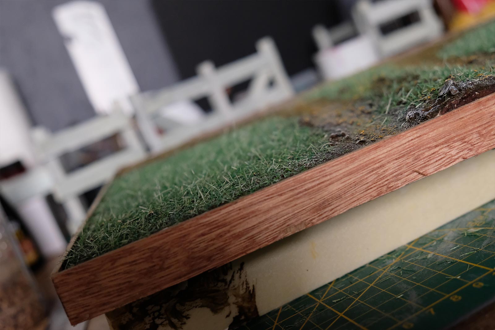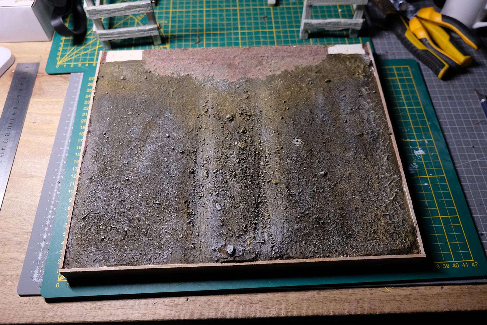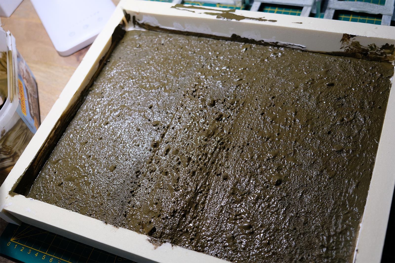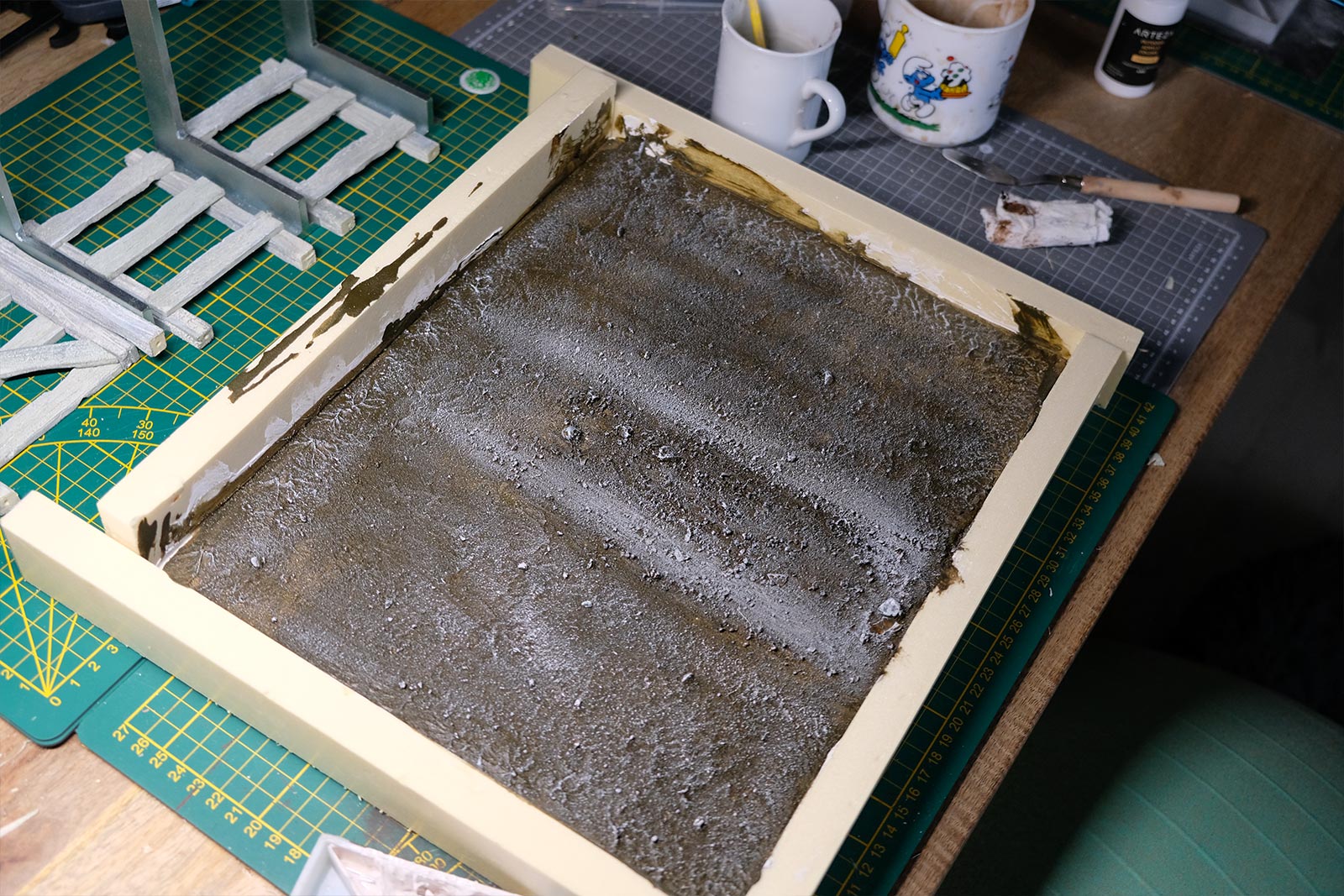 Une plaque de polystyrène sur lequel je place une couche de rebouche-tout mélangé avec une peu de colle à bois afin de servir d’accroche pour l’acrylique qui sera mélangée avec du sable de Rhin et de la code de jus pour la couche d’herbe.