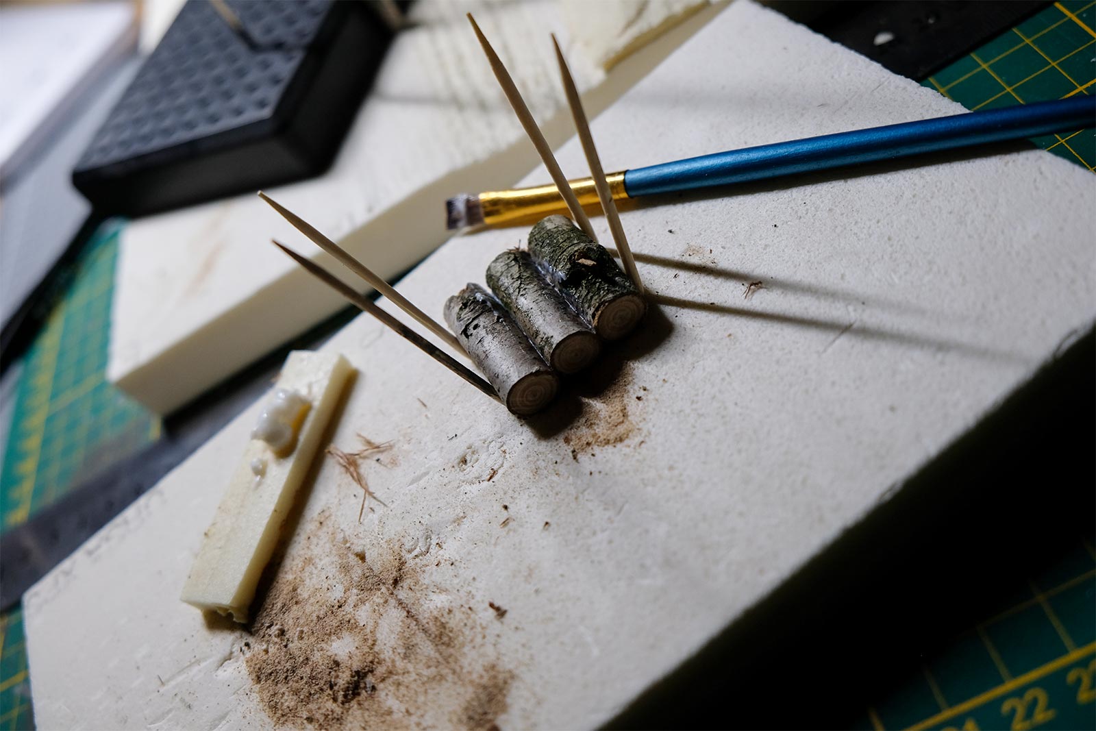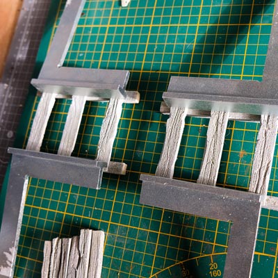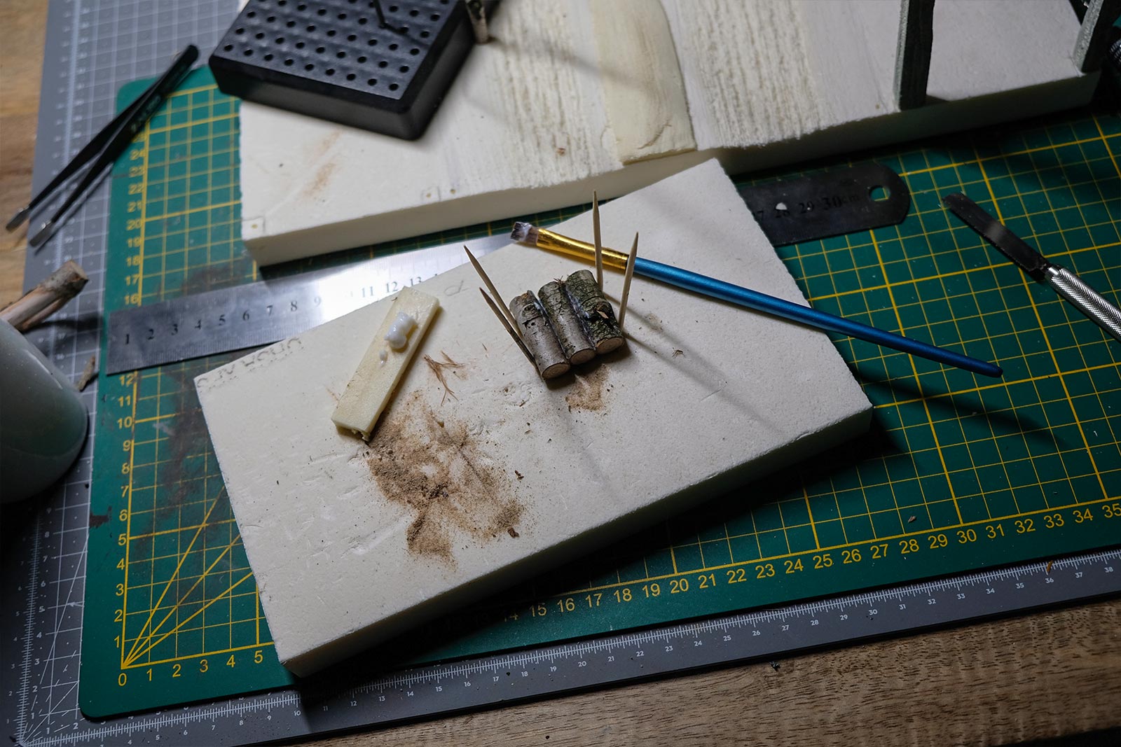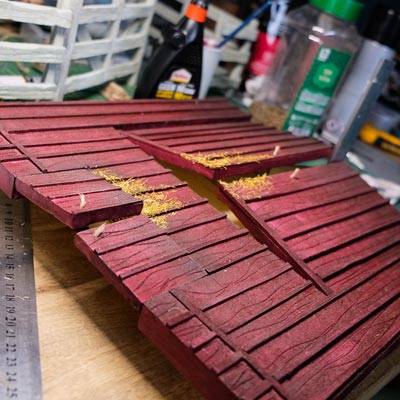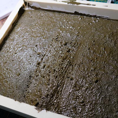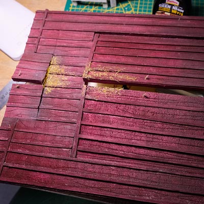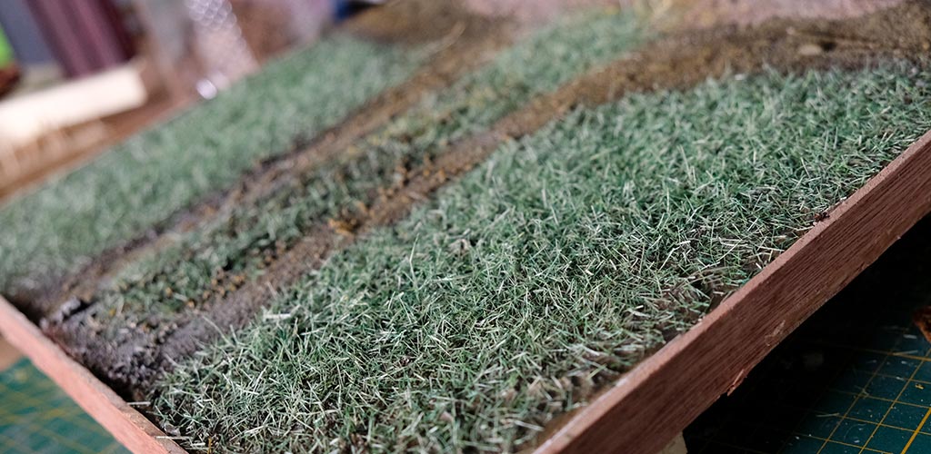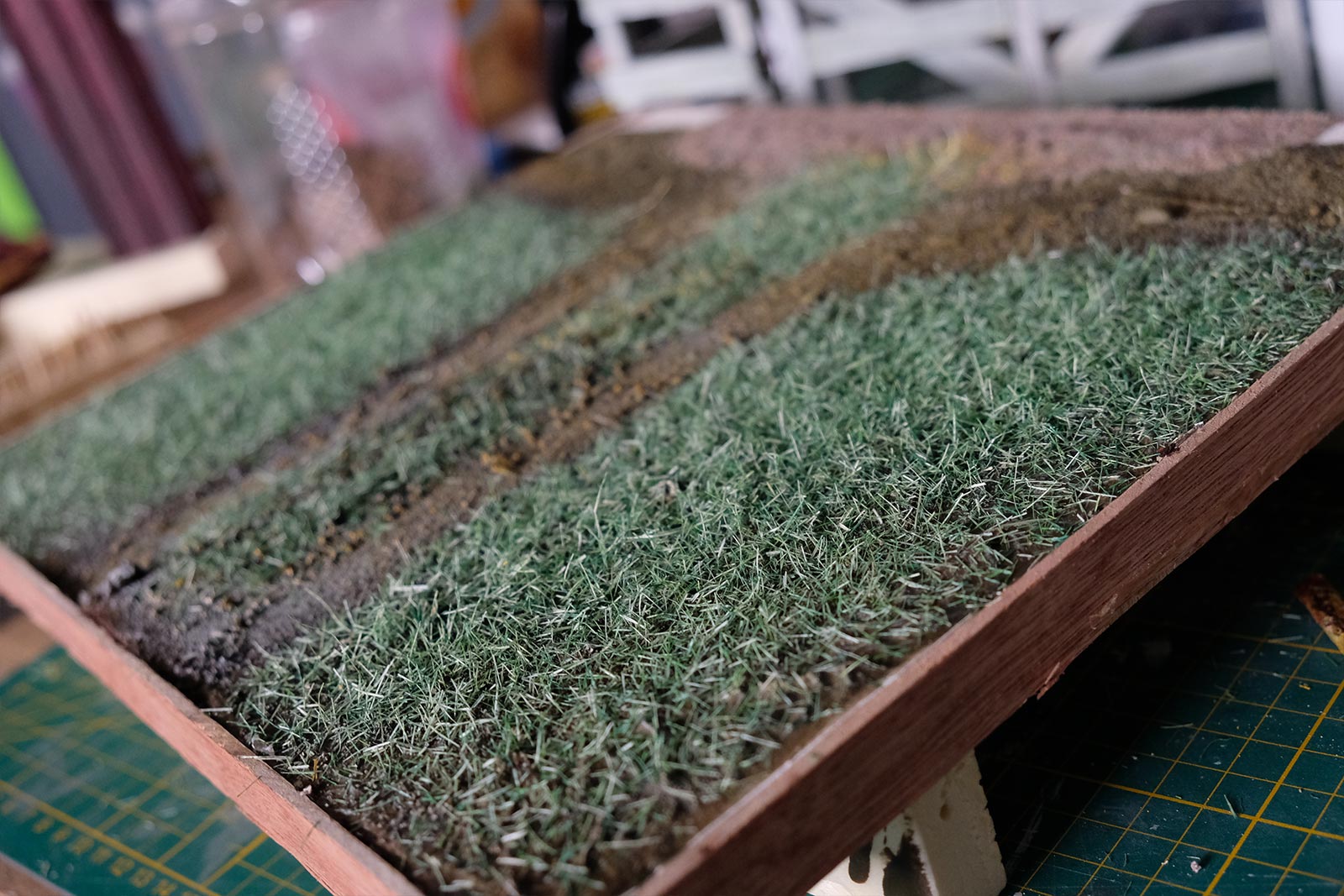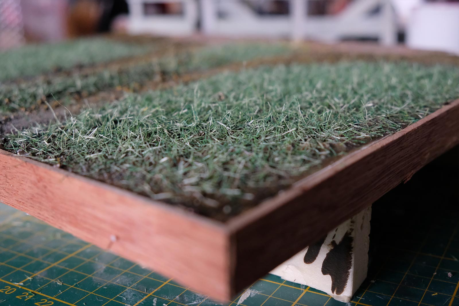 Une plaque de polystyrène sur lequel je place une couche de rebouche-tout mélangé avec une peu de colle à bois afin de servir d’accroche pour l’acrylique qui sera mélangée avec du sable de Rhin et de la code de jus pour la couche d’herbe.