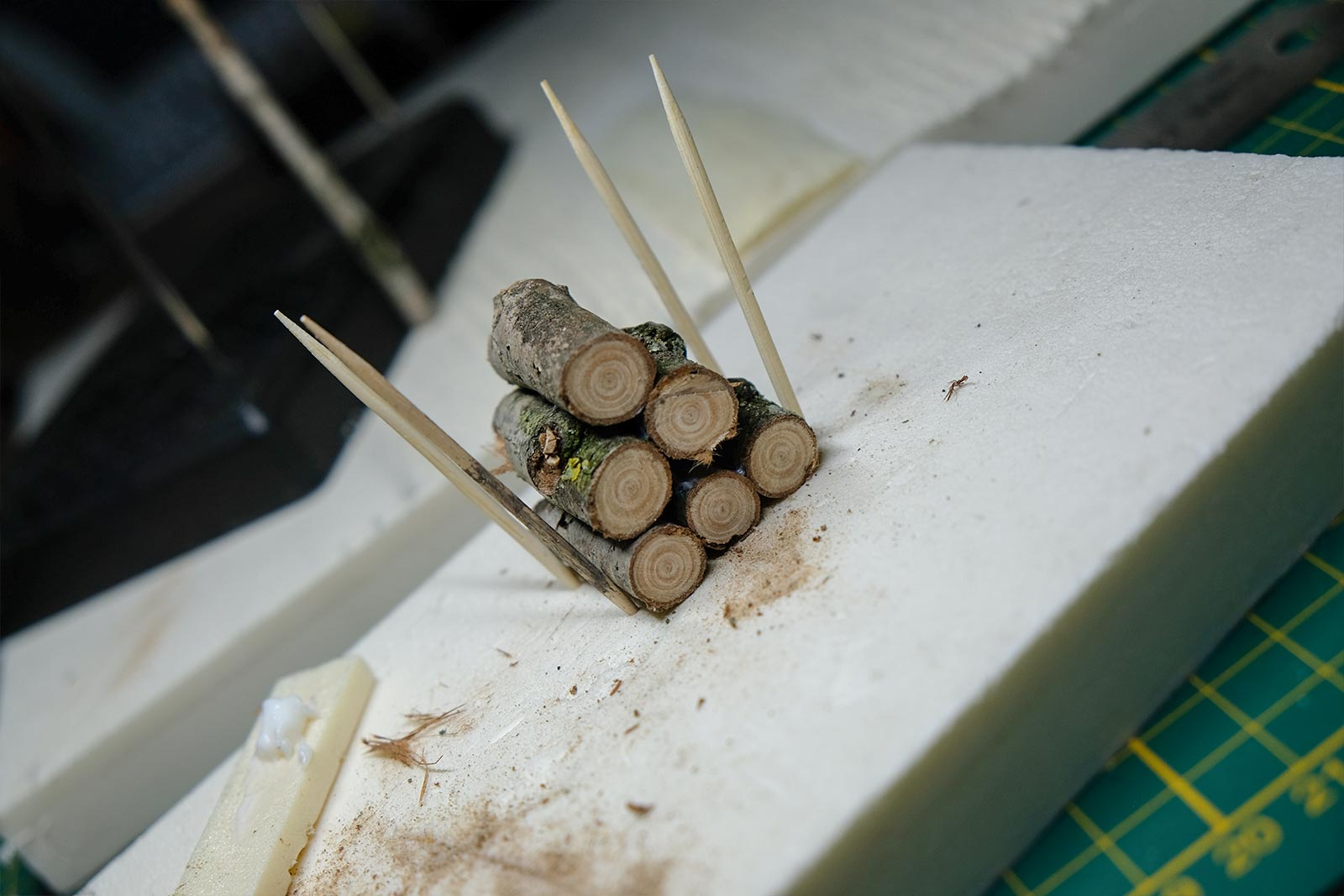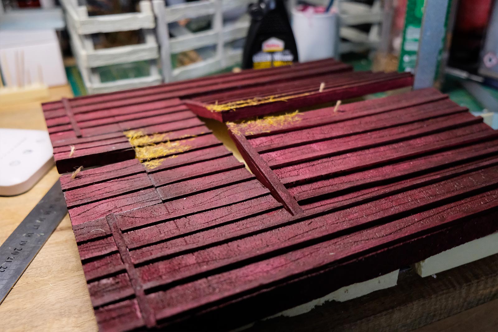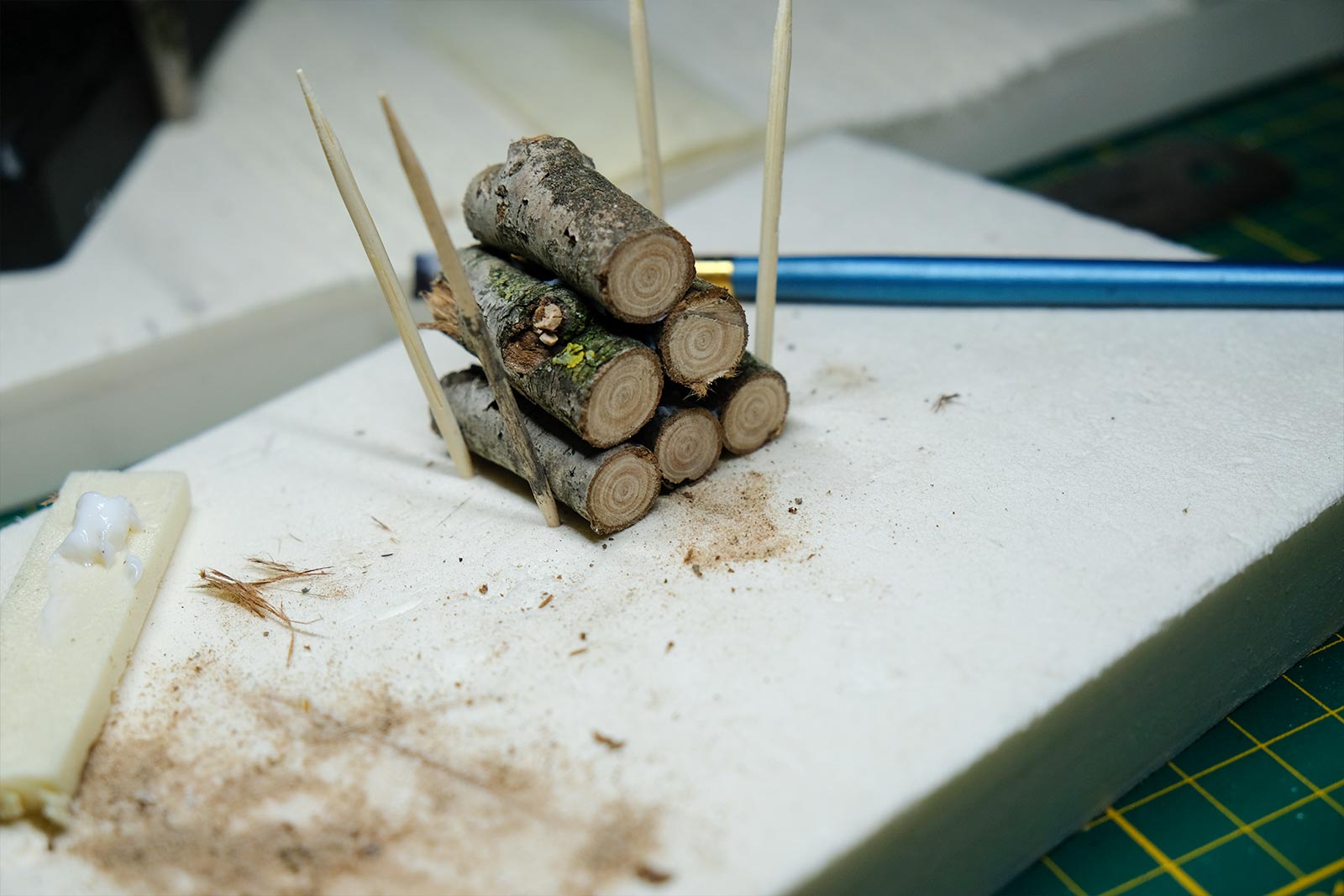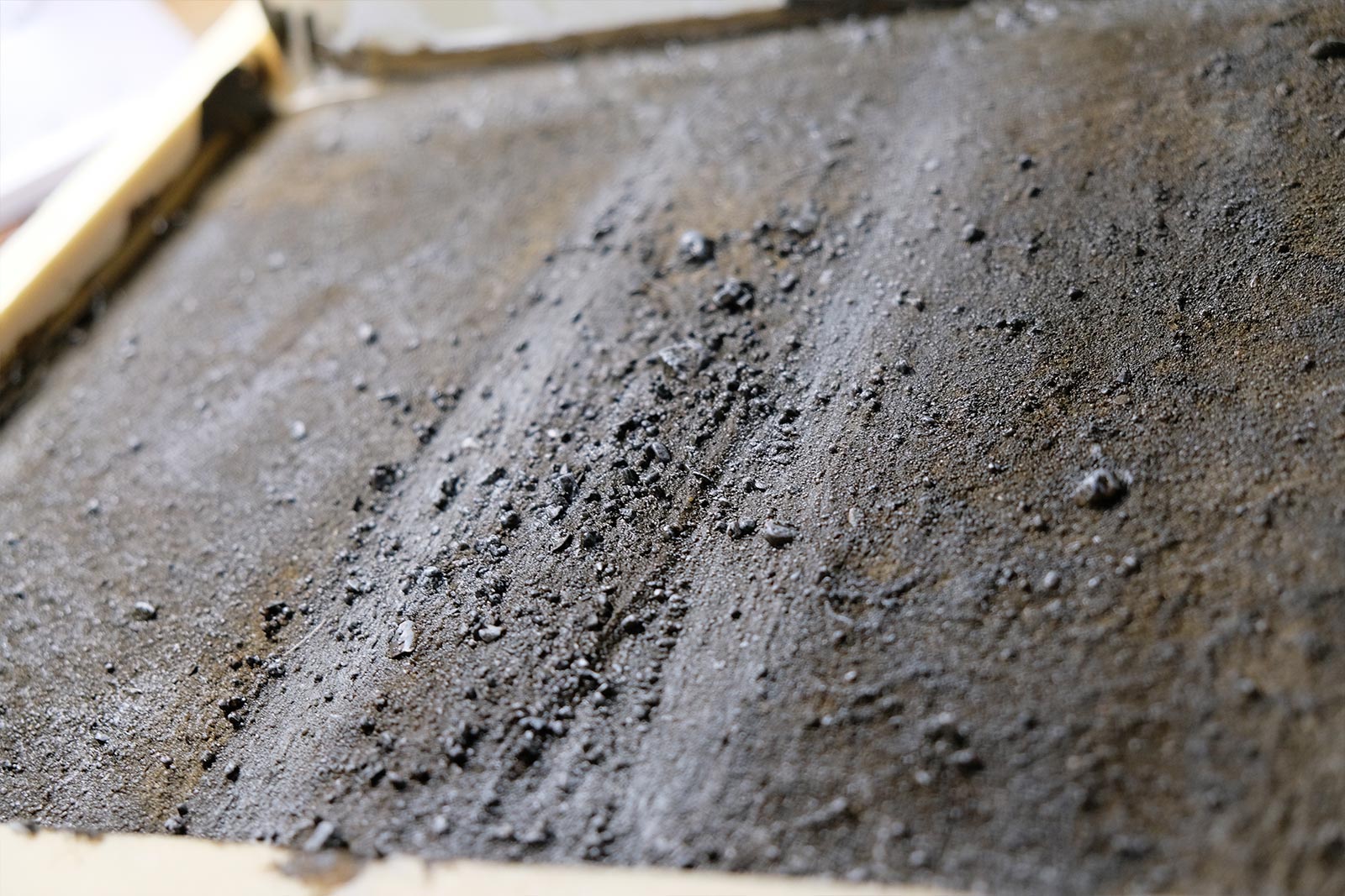 Une plaque de polystyrène sur lequel je place une couche de rebouche-tout mélangé avec une peu de colle à bois afin de servir d’accroche pour l’acrylique qui sera mélangée avec du sable de Rhin et de la code de jus pour la couche d’herbe.