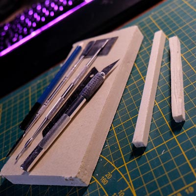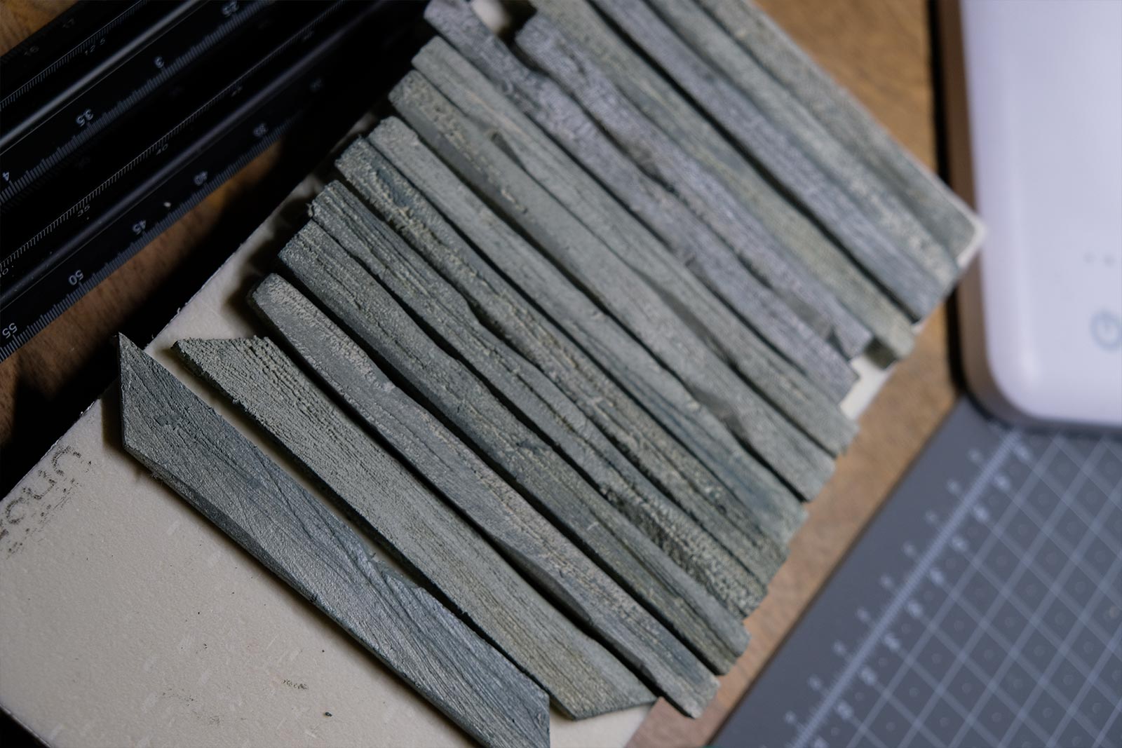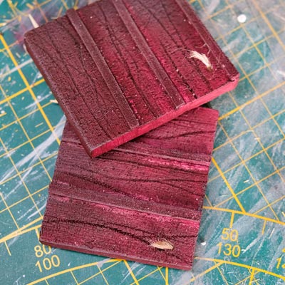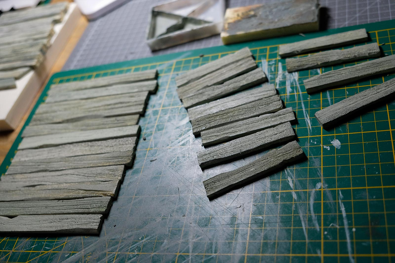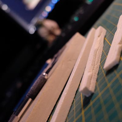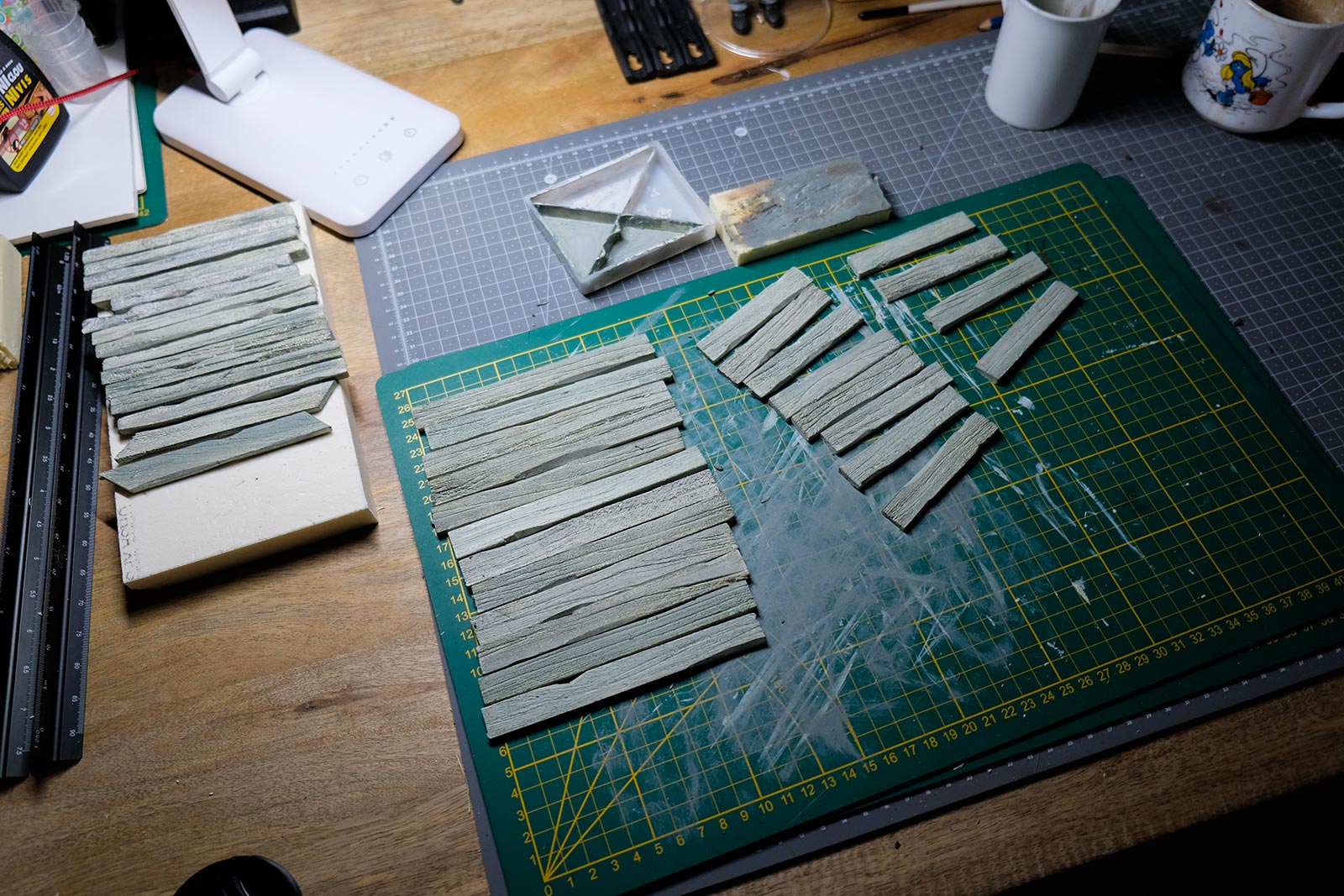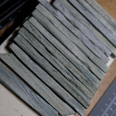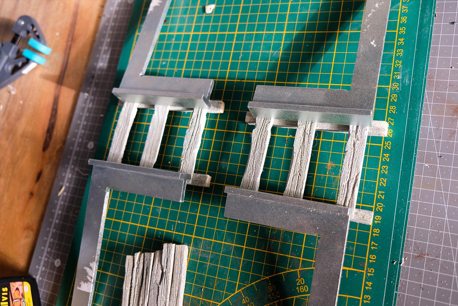 Une plaque de polystyrène sur lequel je place une couche de rebouche-tout mélangé avec une peu de colle à bois afin de servir d’accroche pour l’acrylique qui sera mélangée avec du sable de Rhin et de la code de jus pour la couche d’herbe.