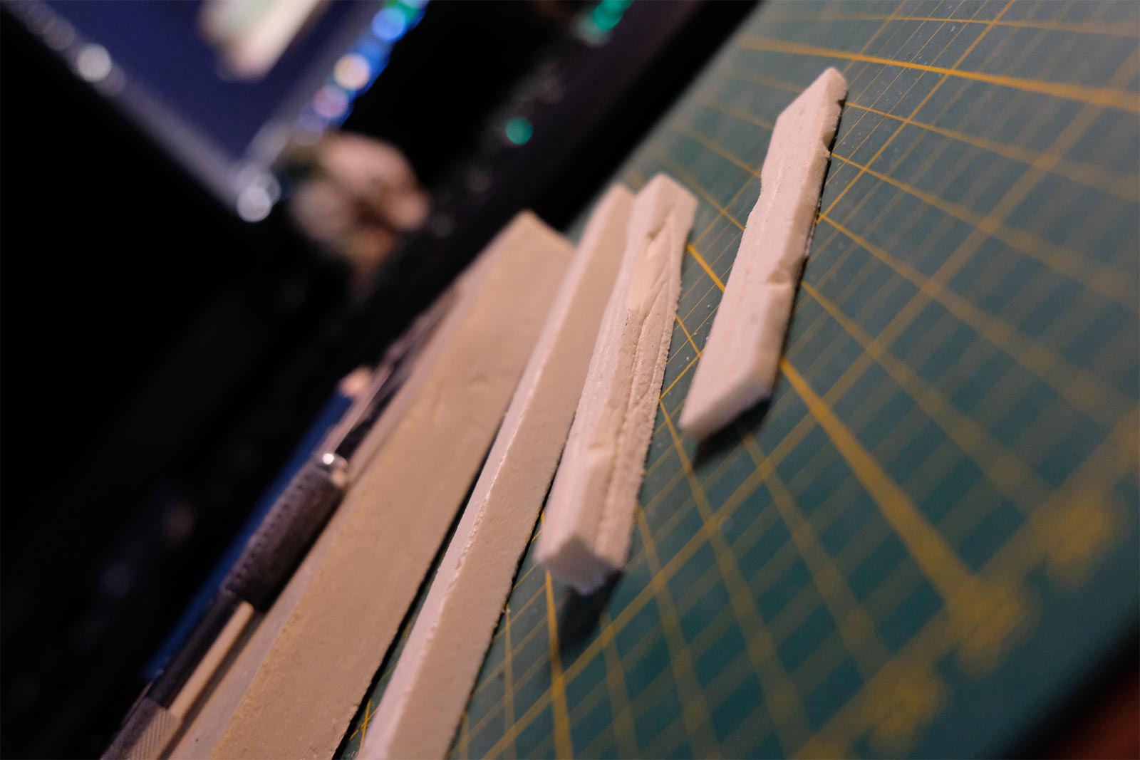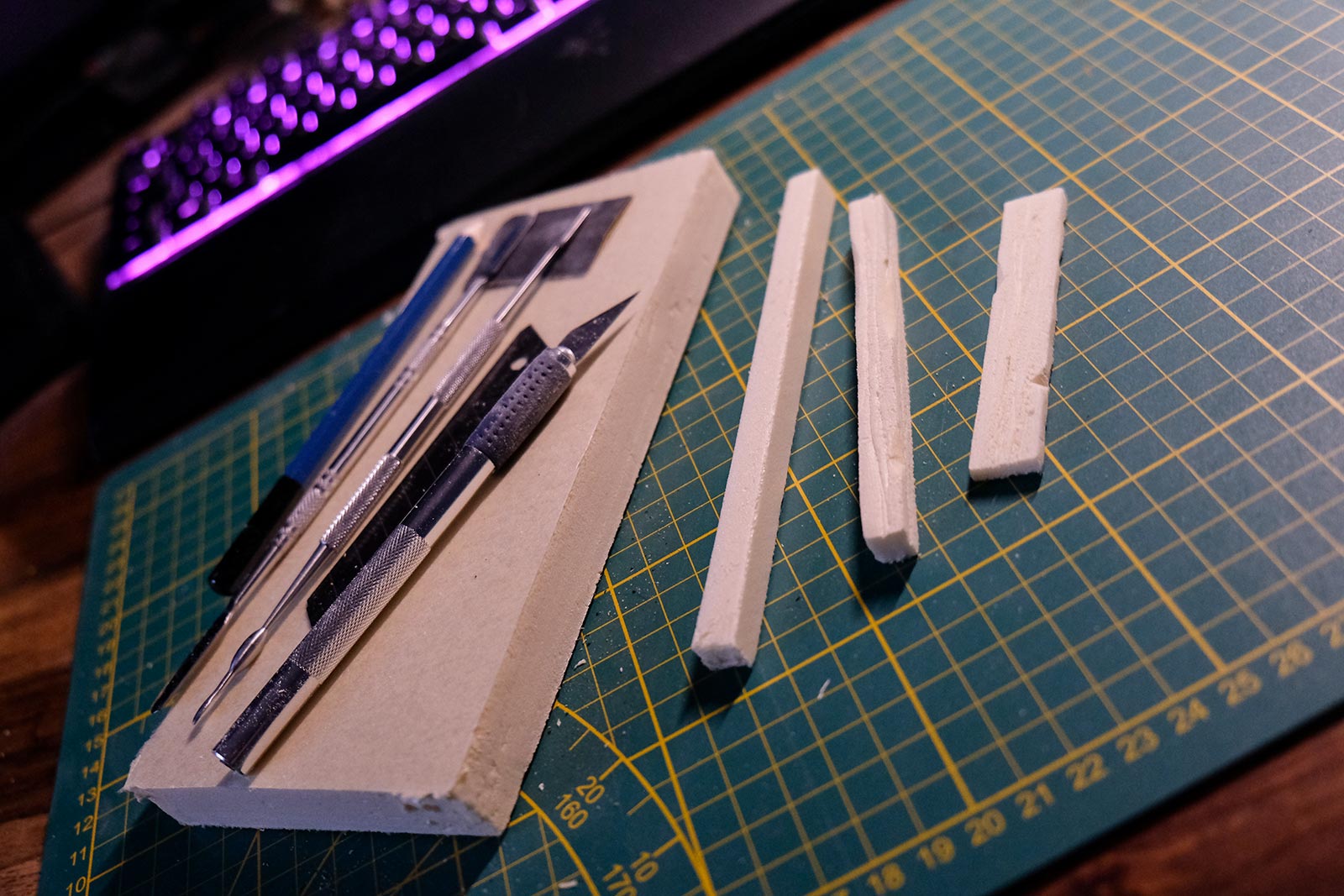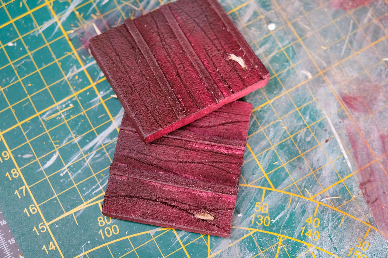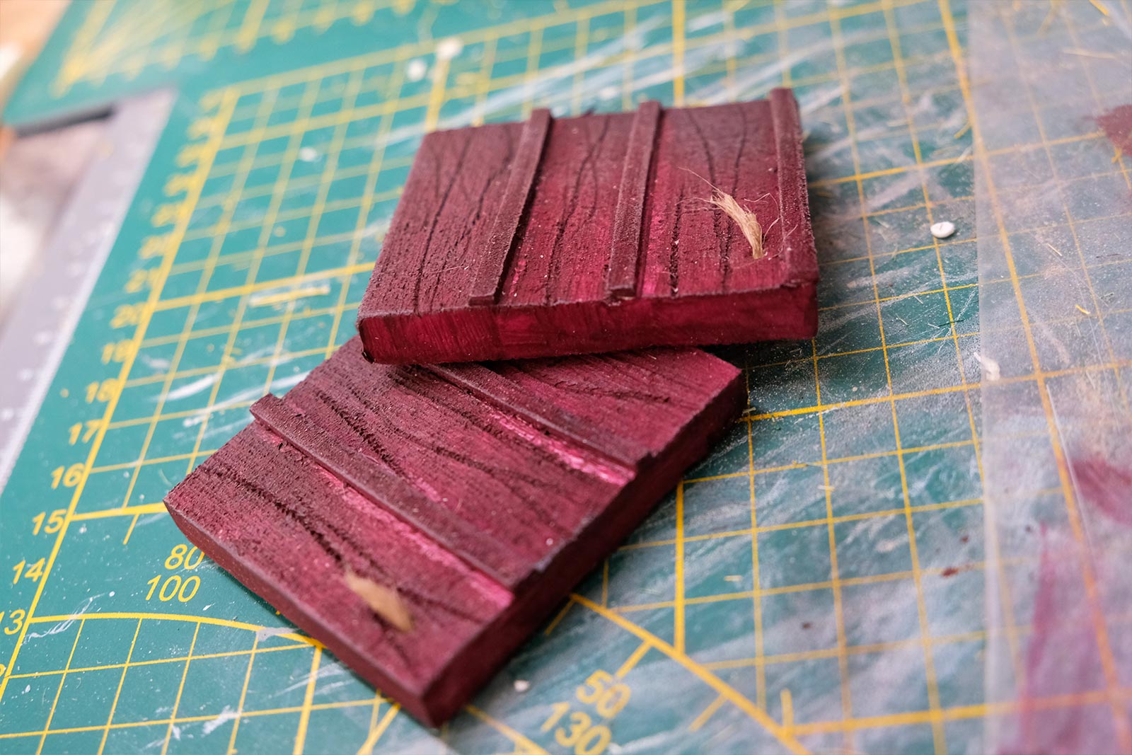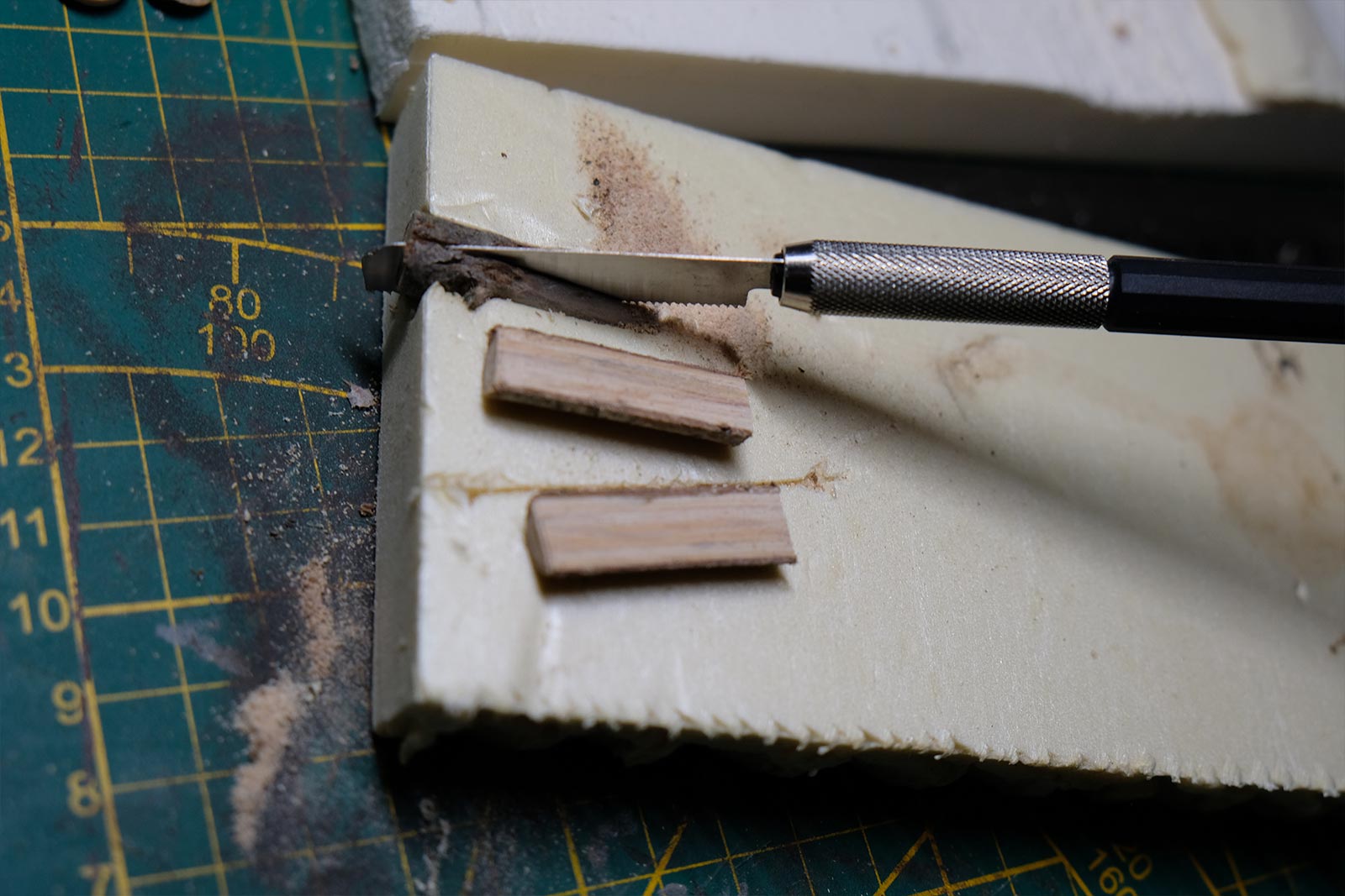 Une plaque de polystyrène sur lequel je place une couche de rebouche-tout mélangé avec une peu de colle à bois afin de servir d’accroche pour l’acrylique qui sera mélangée avec du sable de Rhin et de la code de jus pour la couche d’herbe.