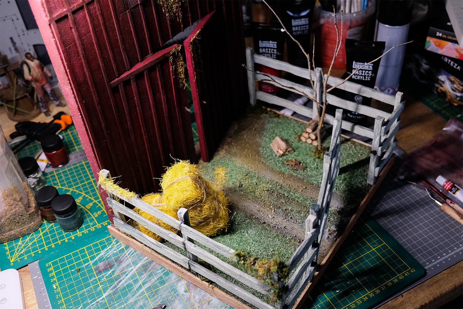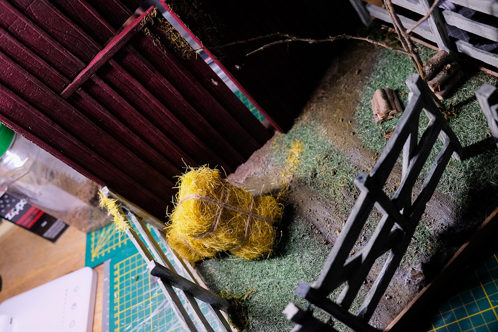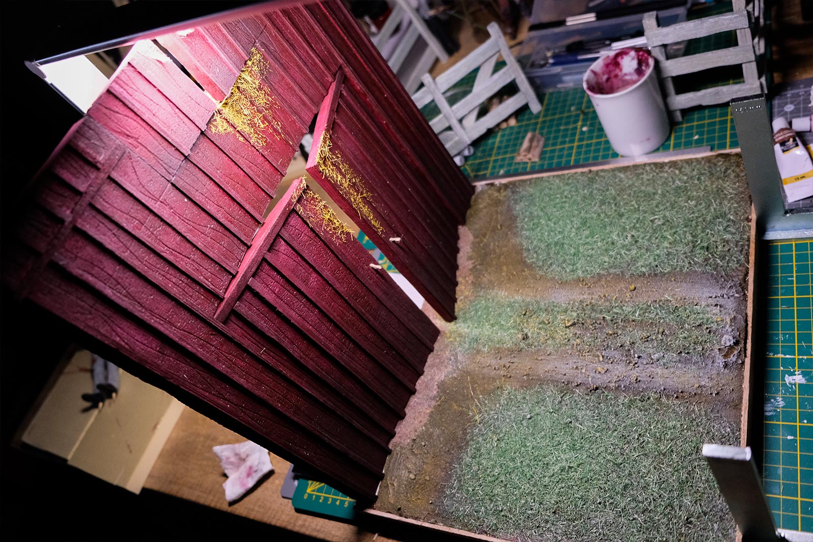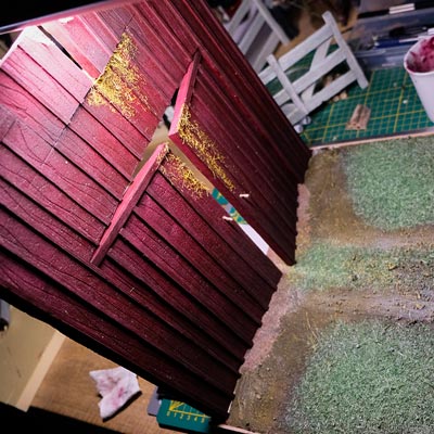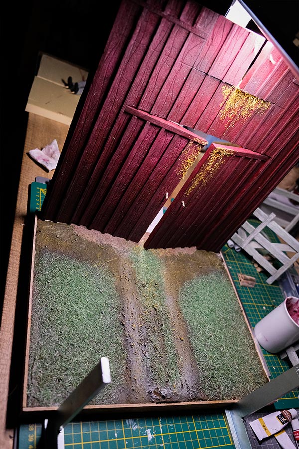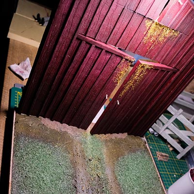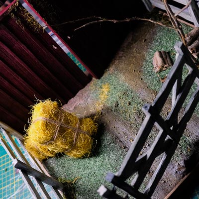 Après les barrières, la grange. Toujours avec comme peinture de base l’acrylique, le jus à partir d’essence de "Zippo" et de peinture à l’huile. De la corde de jus, aussi pour la paille et ses dépôts.
