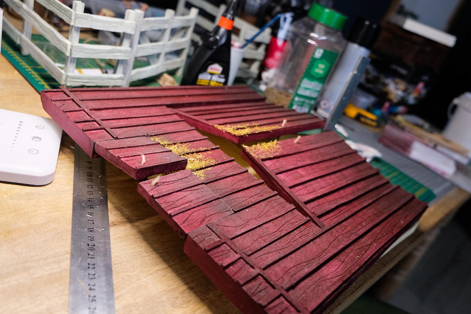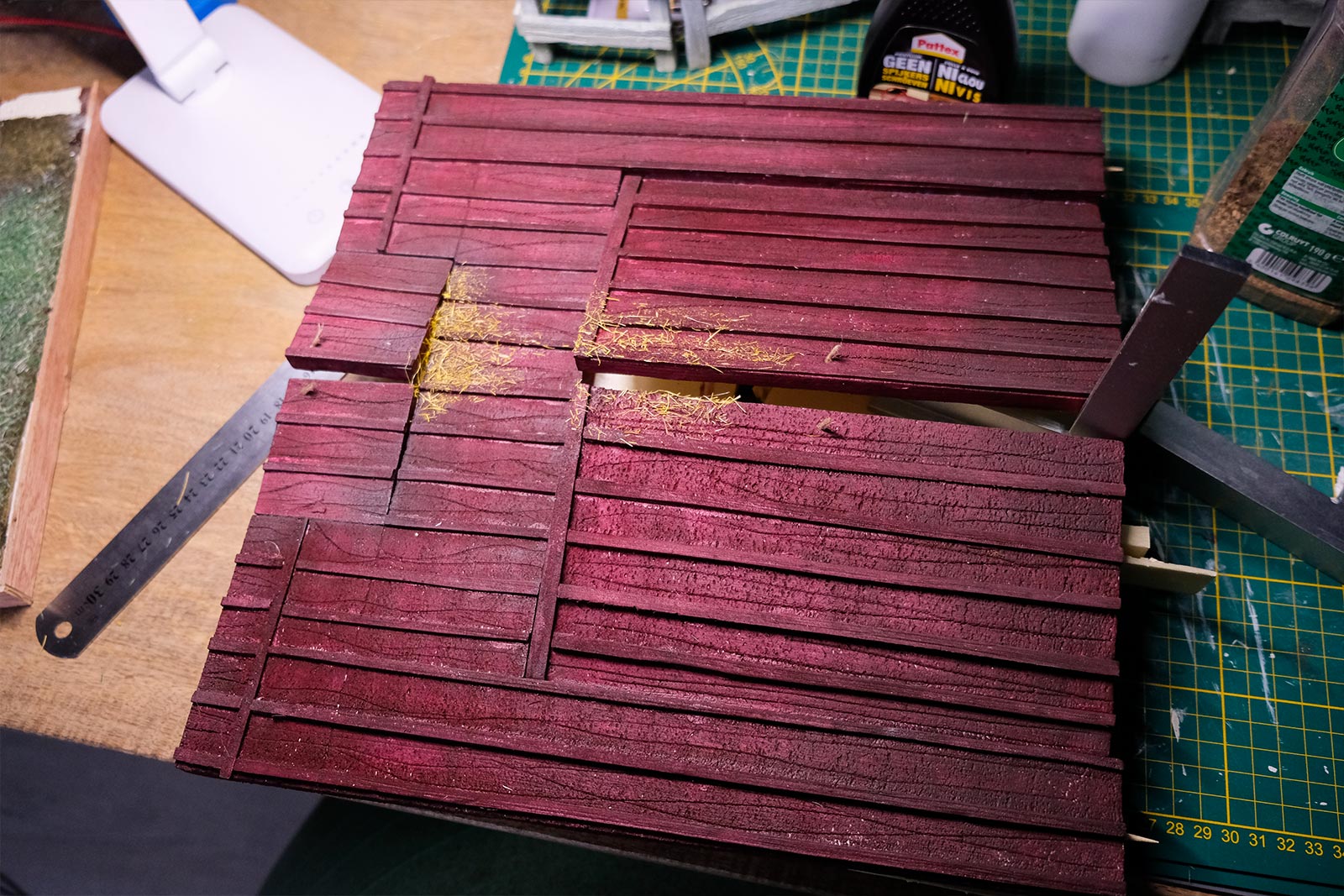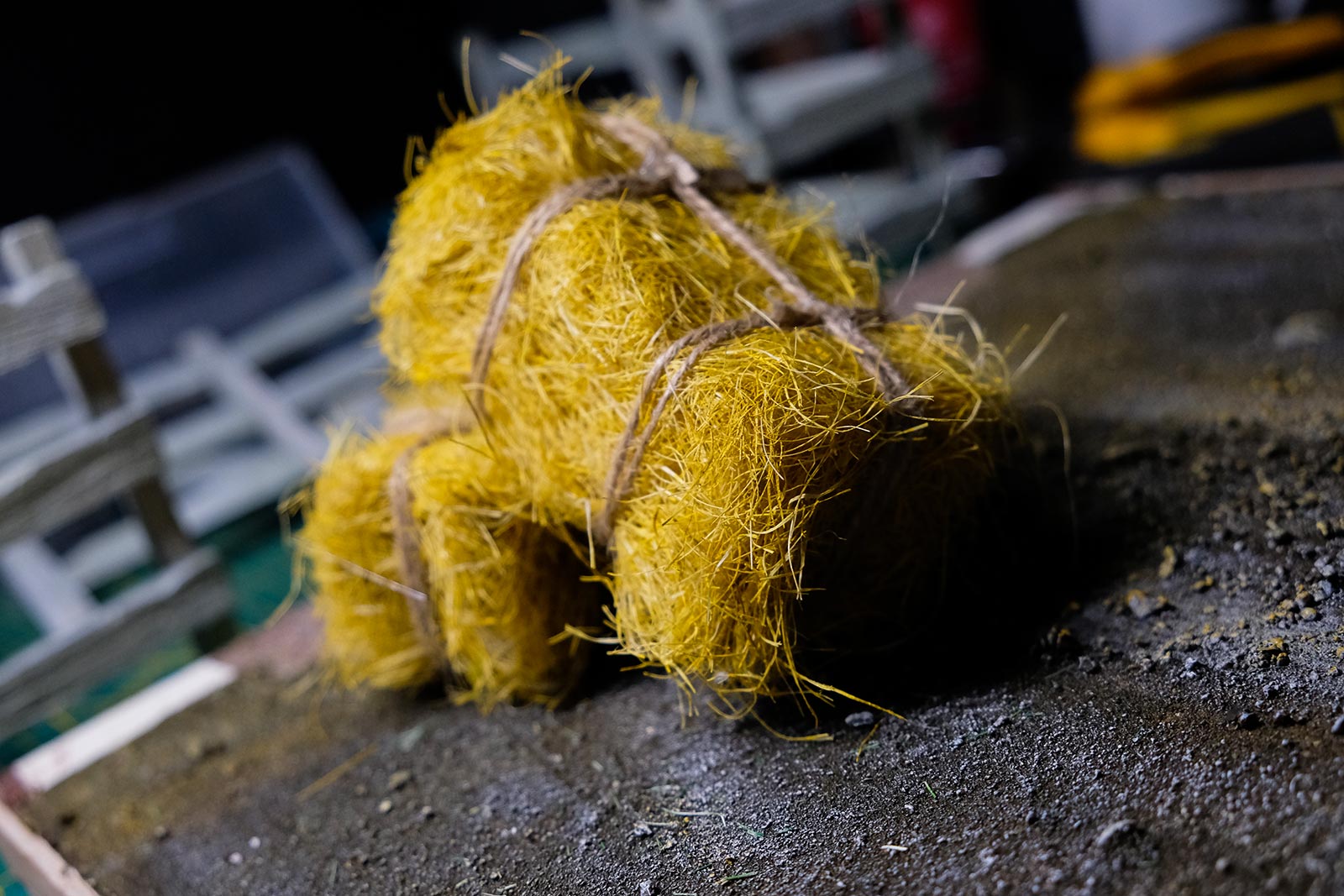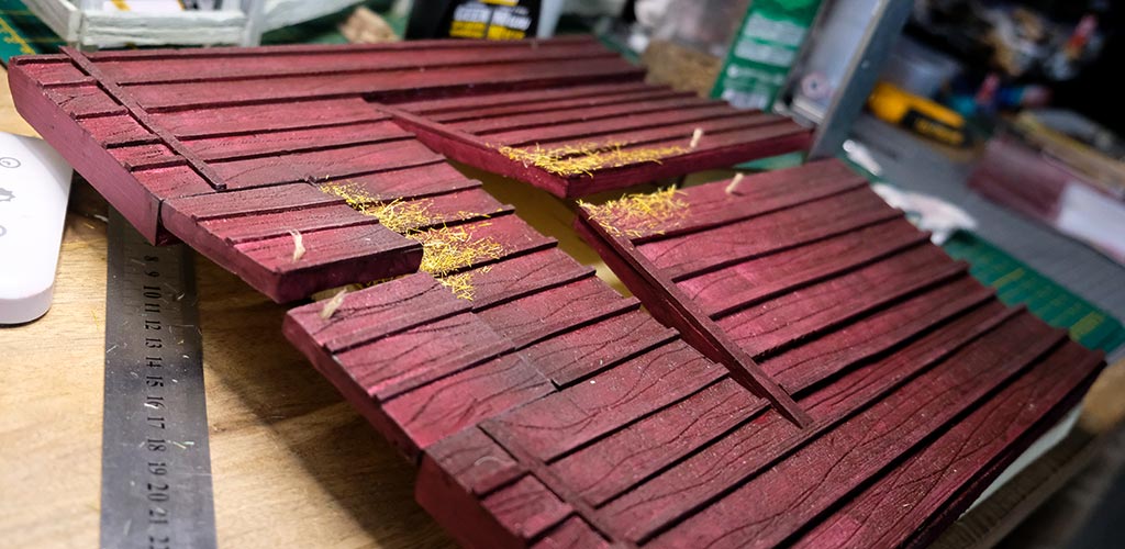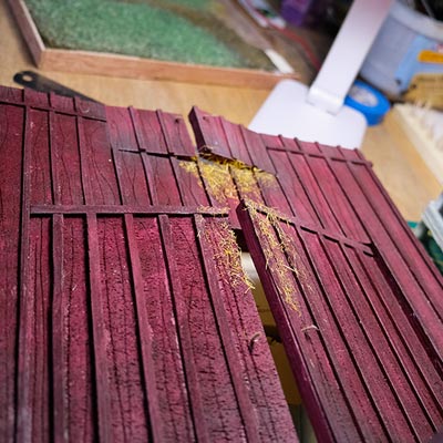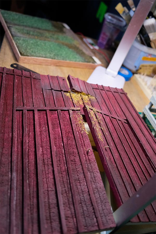 Après les barrières, la grange. Toujours avec comme peinture de base l’acrylique, le jus à partir d’essence de "Zippo" et de peinture à l’huile. De la corde de jus, aussi pour la paille et ses dépôts.