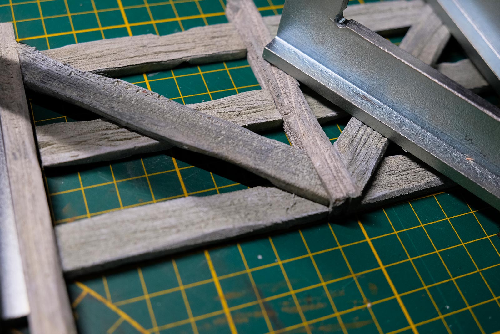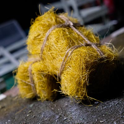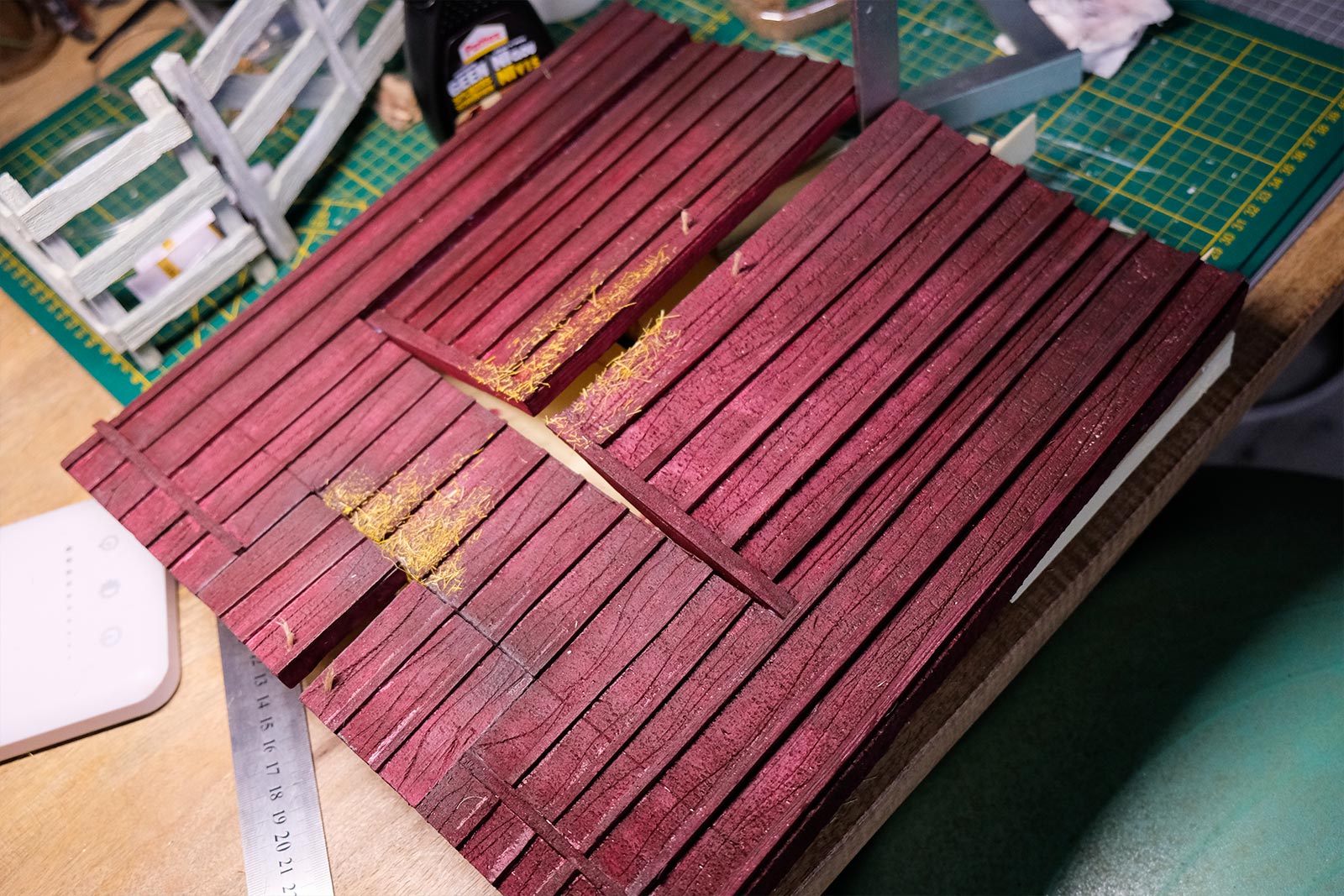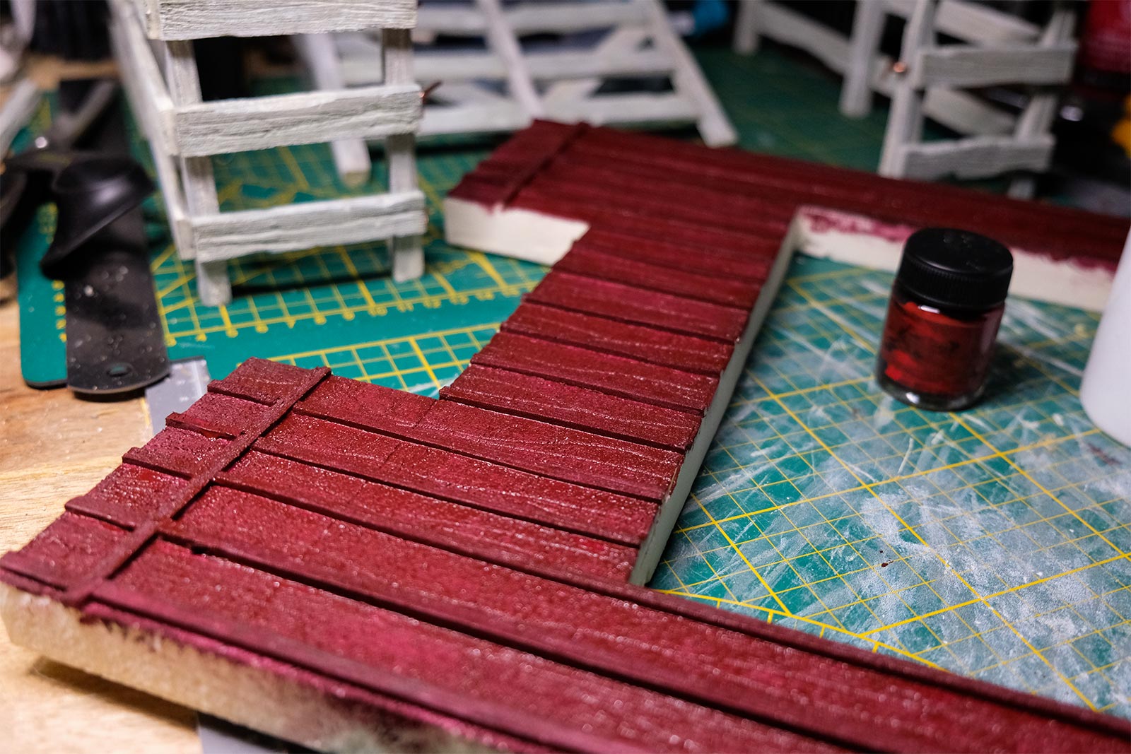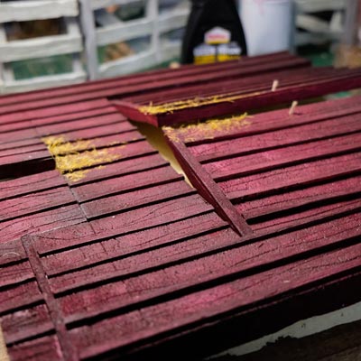 Après les barrières, la grange. Toujours avec comme peinture de base l’acrylique, le jus à partir d’essence de "Zippo" et de peinture à l’huile. De la corde de jus, aussi pour la paille et ses dépôts.
