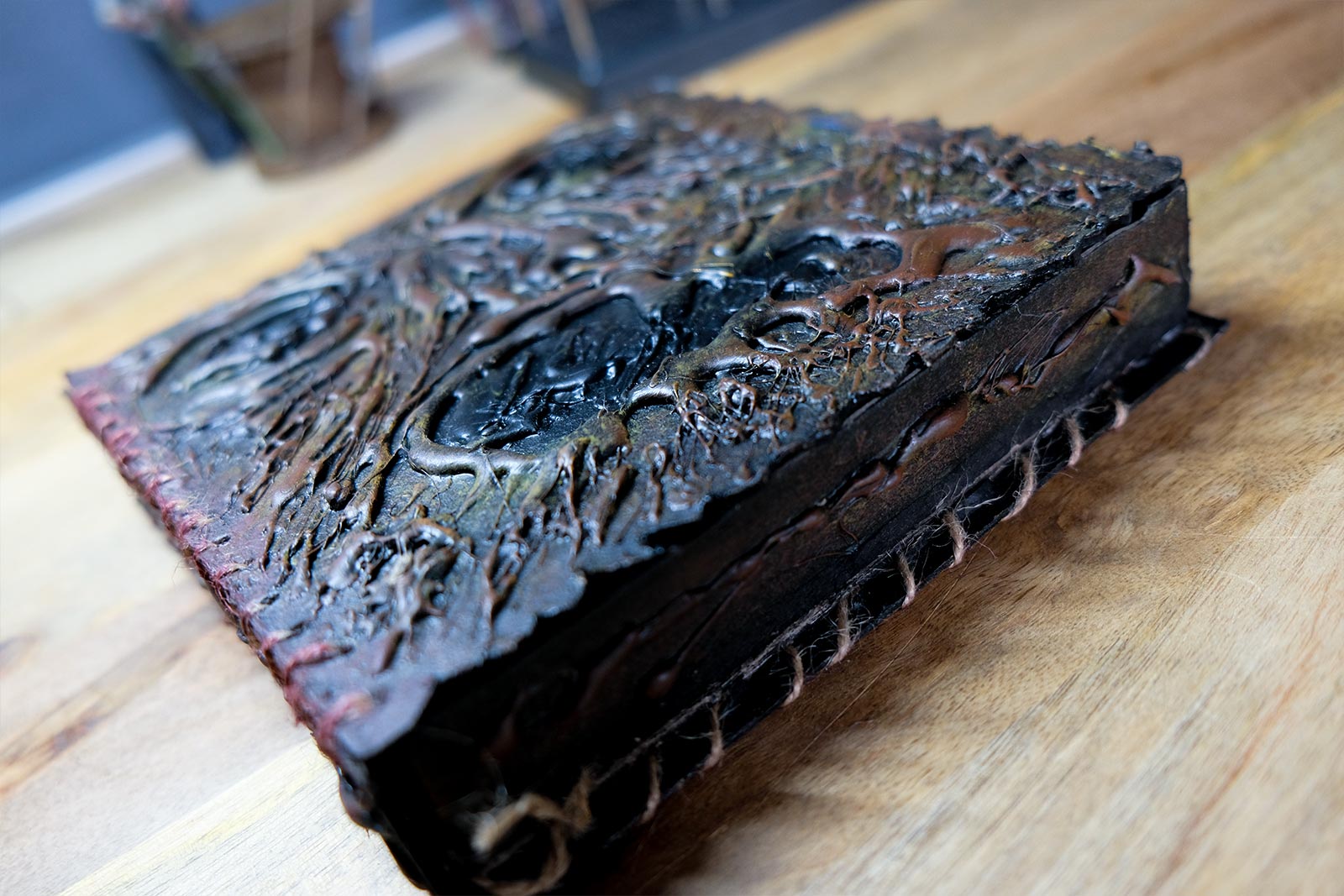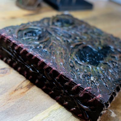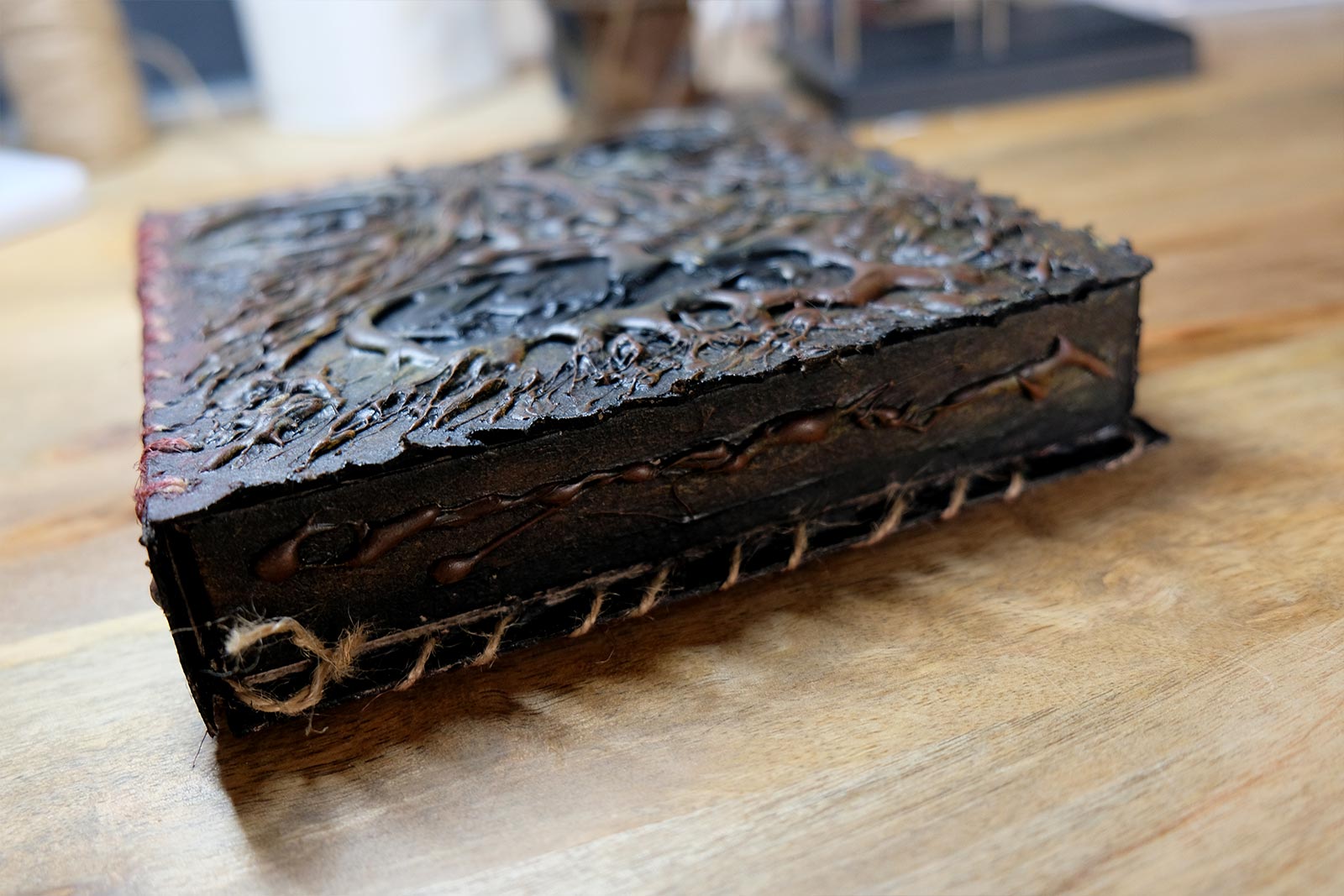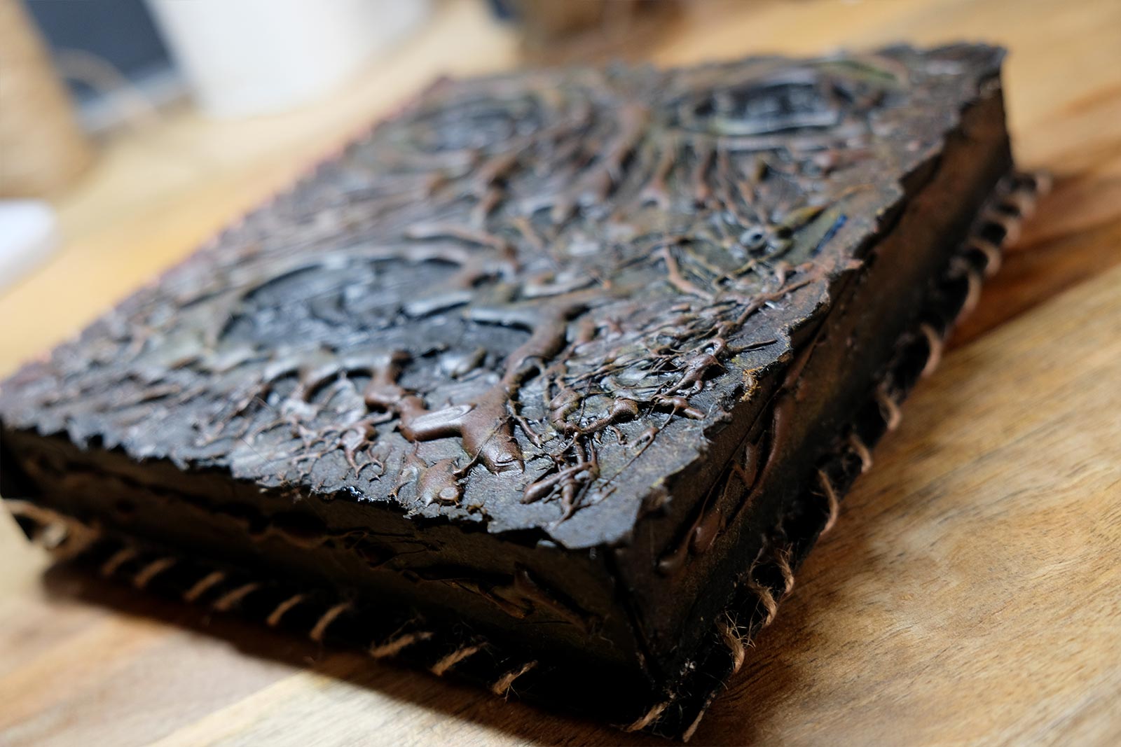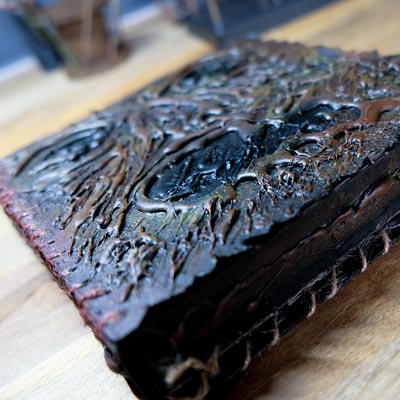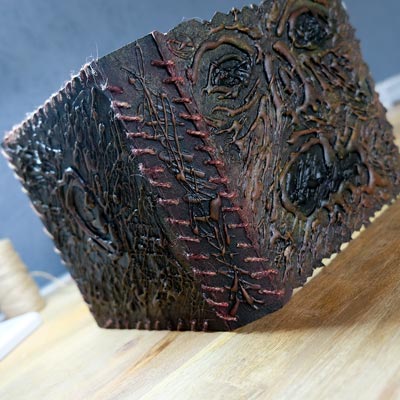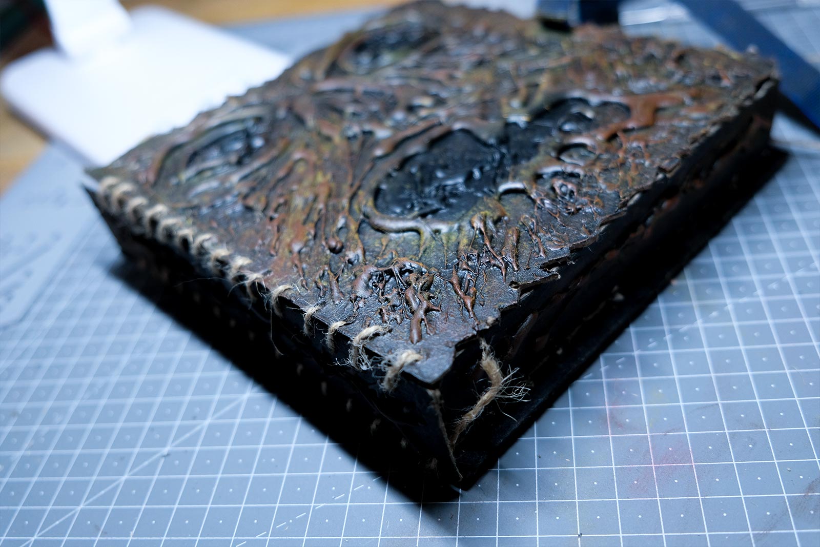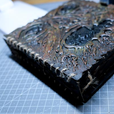Une boîte en carton découpée, tailladée et remontée, voici la base de cette première création “Le Necromonicon Ex-Mortis”, tiré d’une scène d’Evil Dead III.
