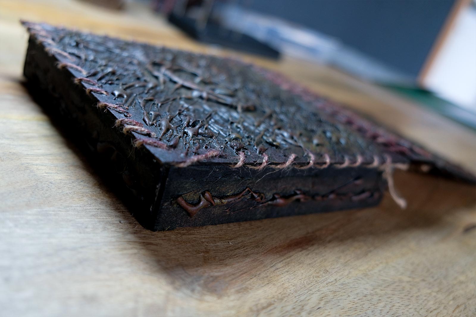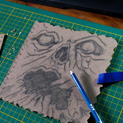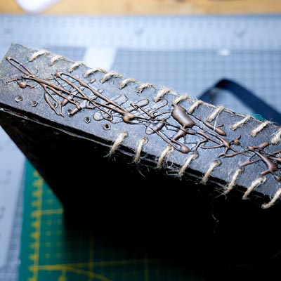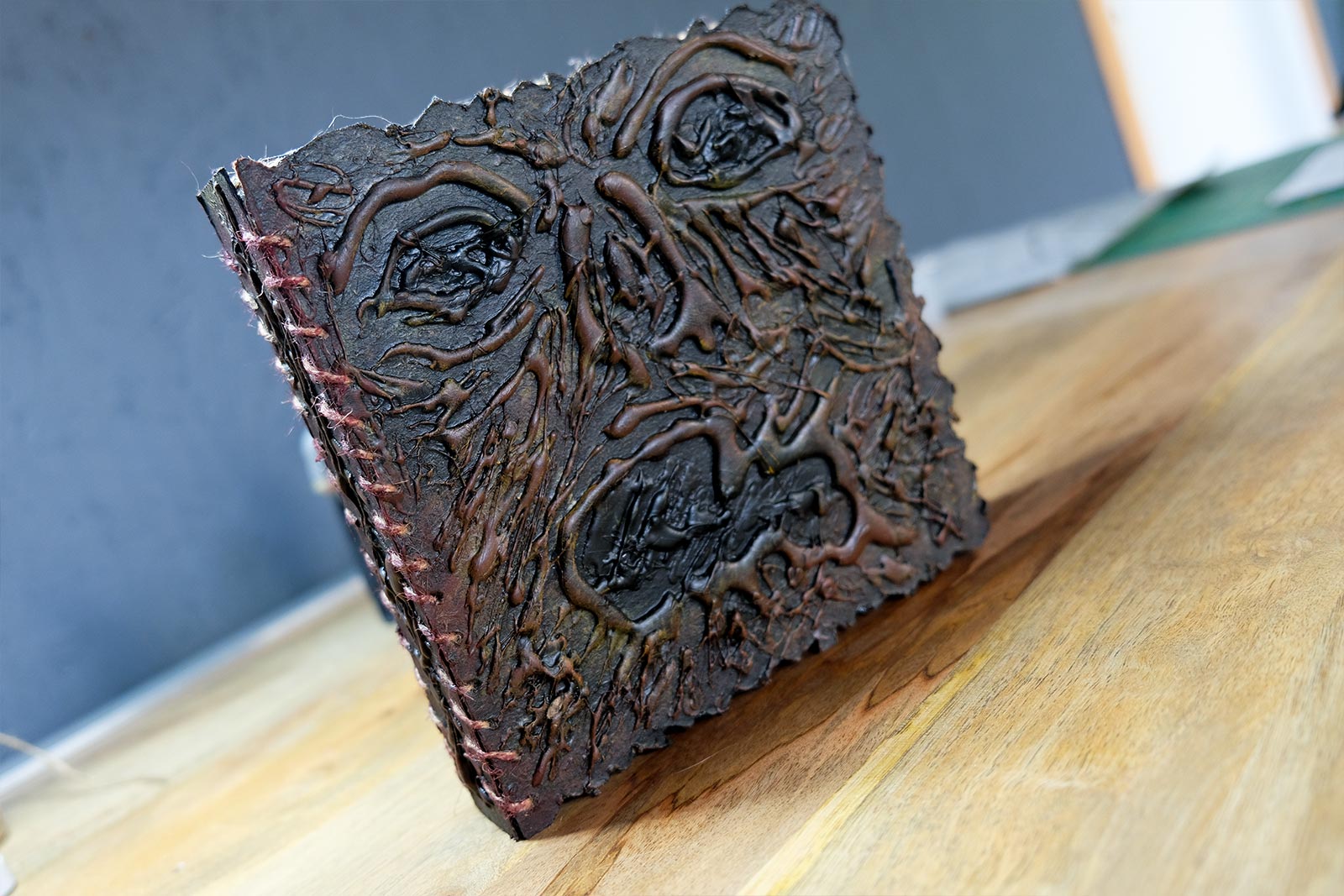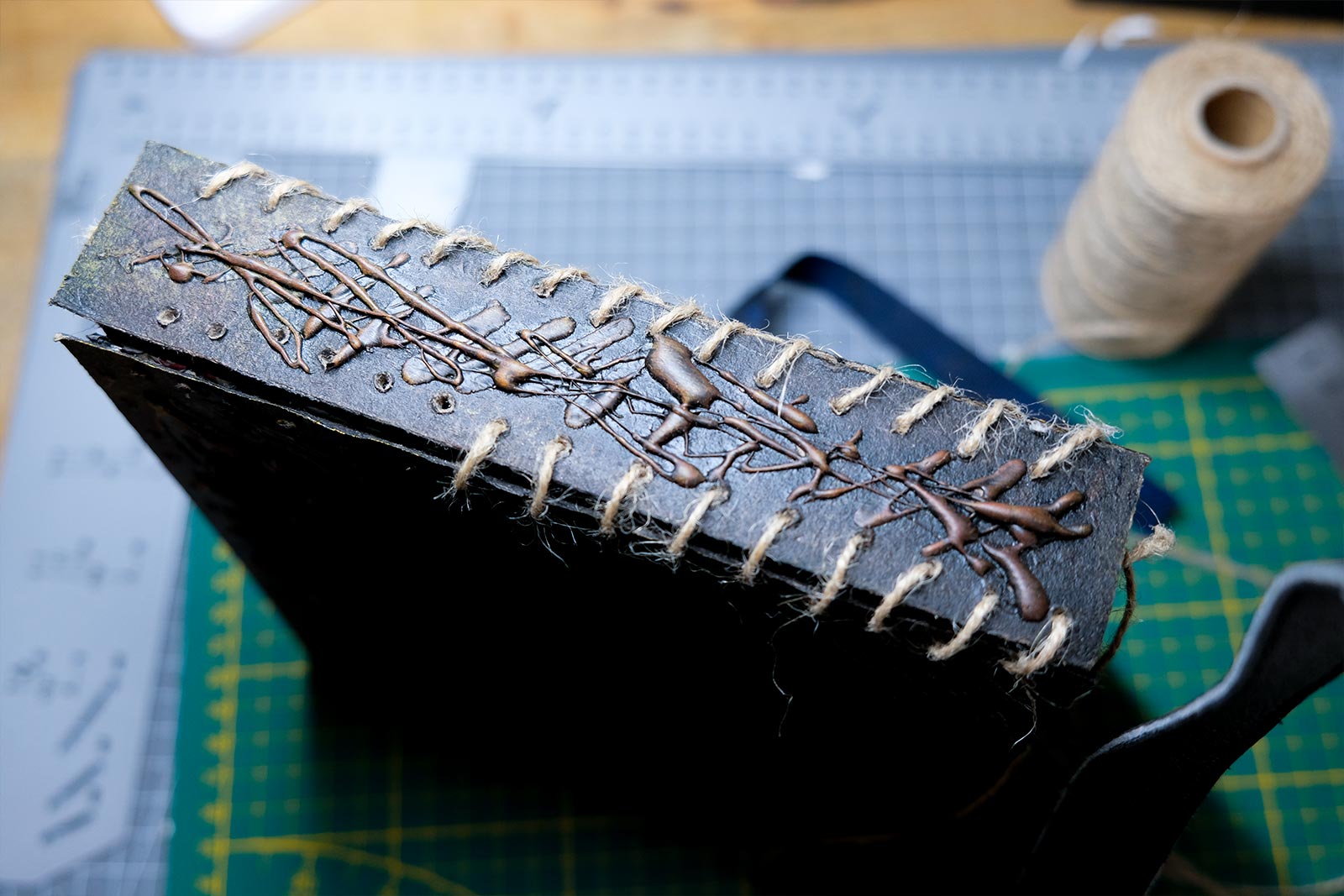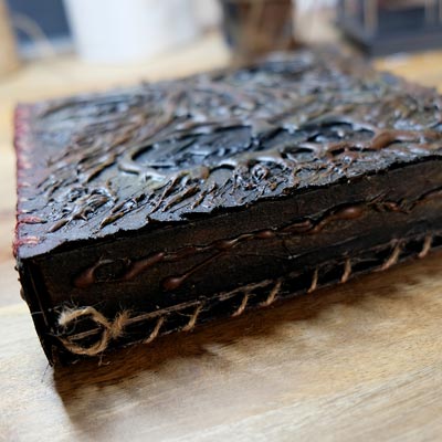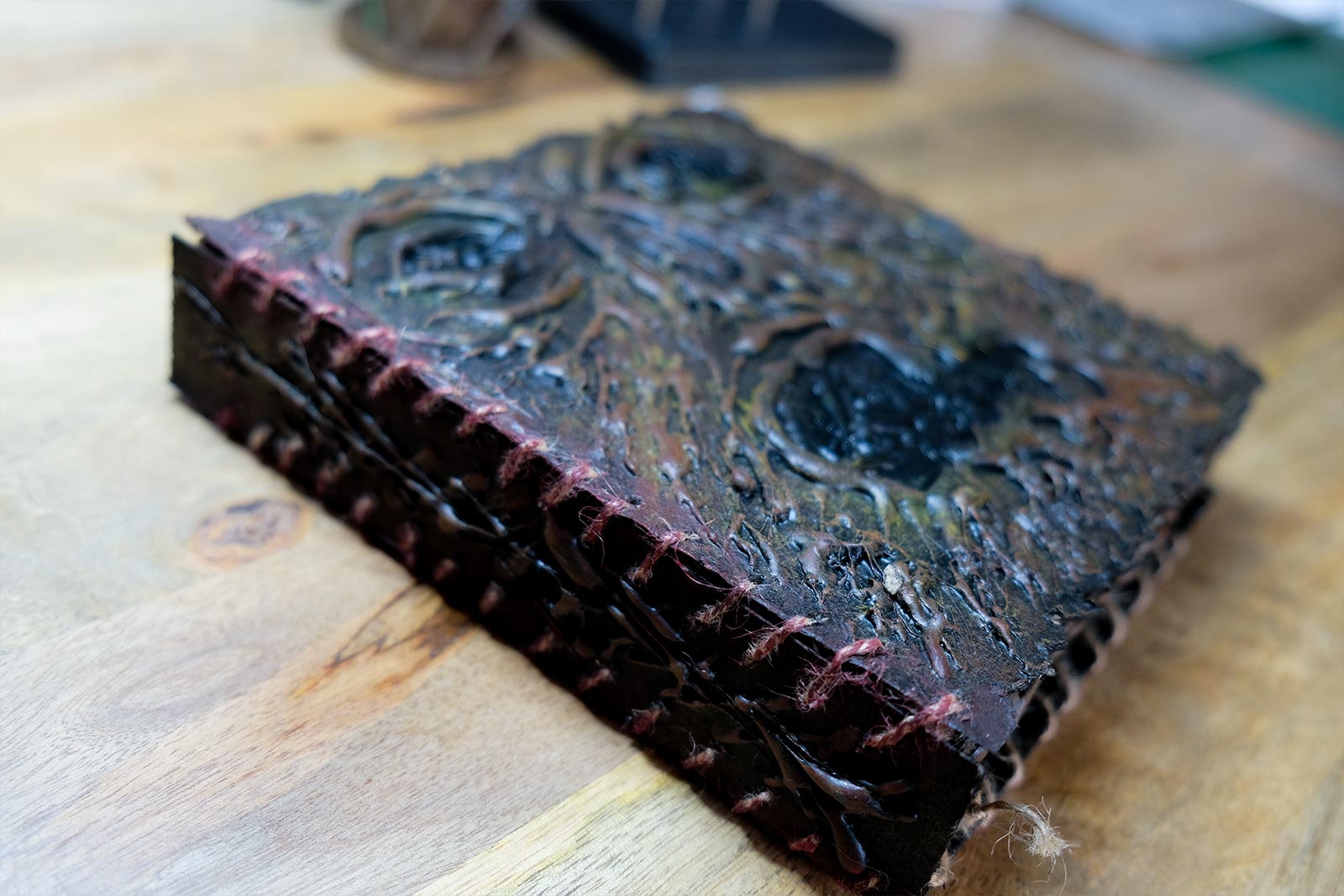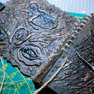 Une boîte en carton découpée, tailladée et remontée, voici la base de cette première création “Le Necromonicon Ex-Mortis”, tiré d’une scène d’Evil Dead III.