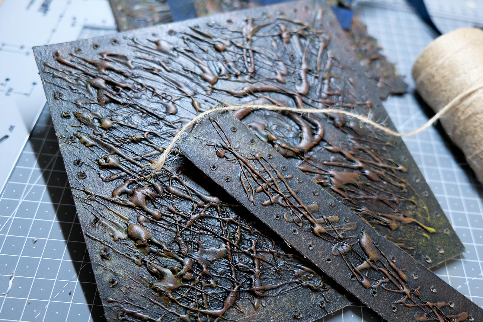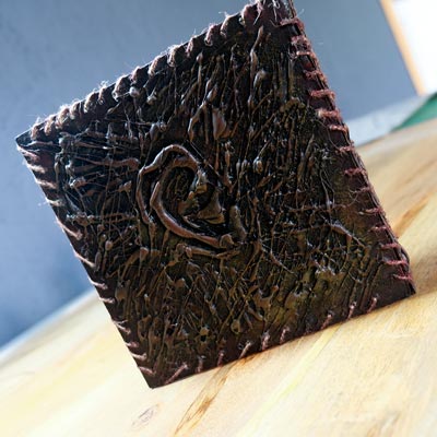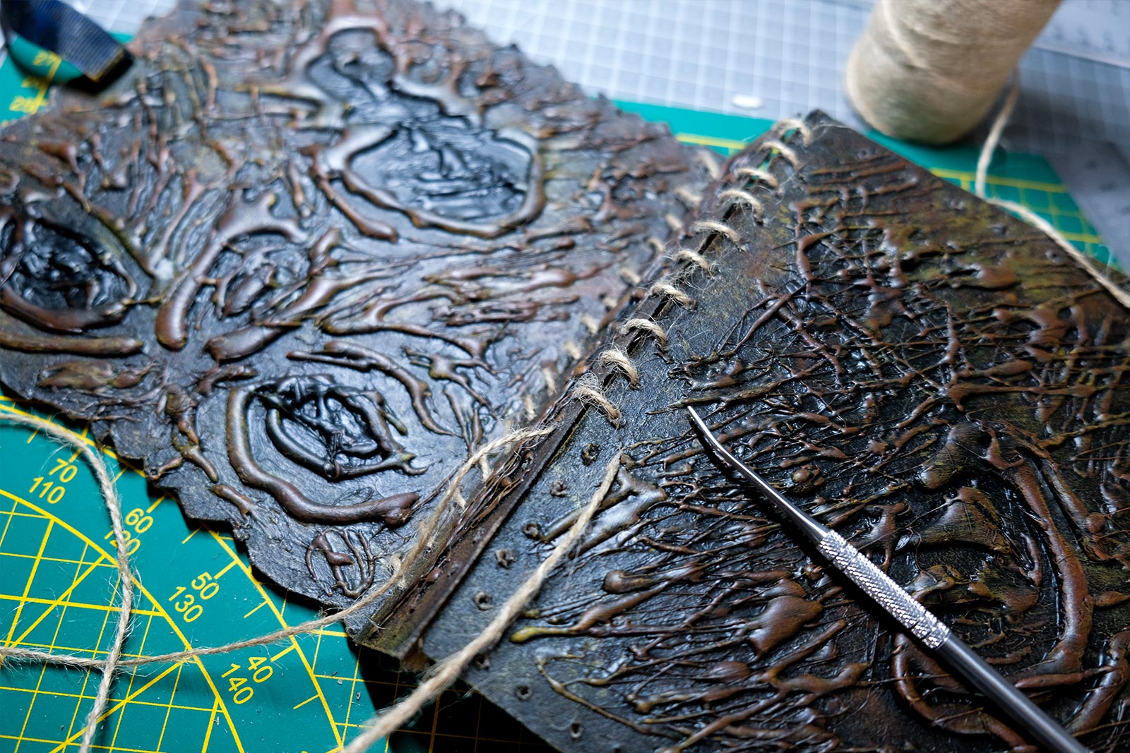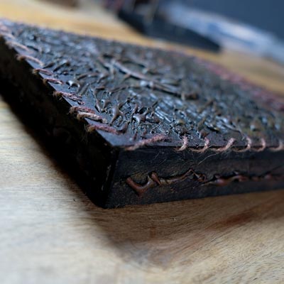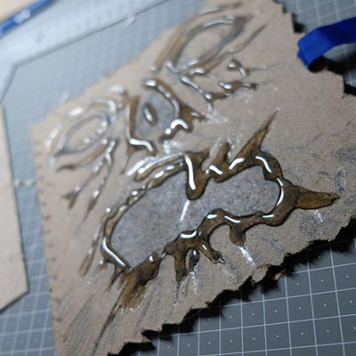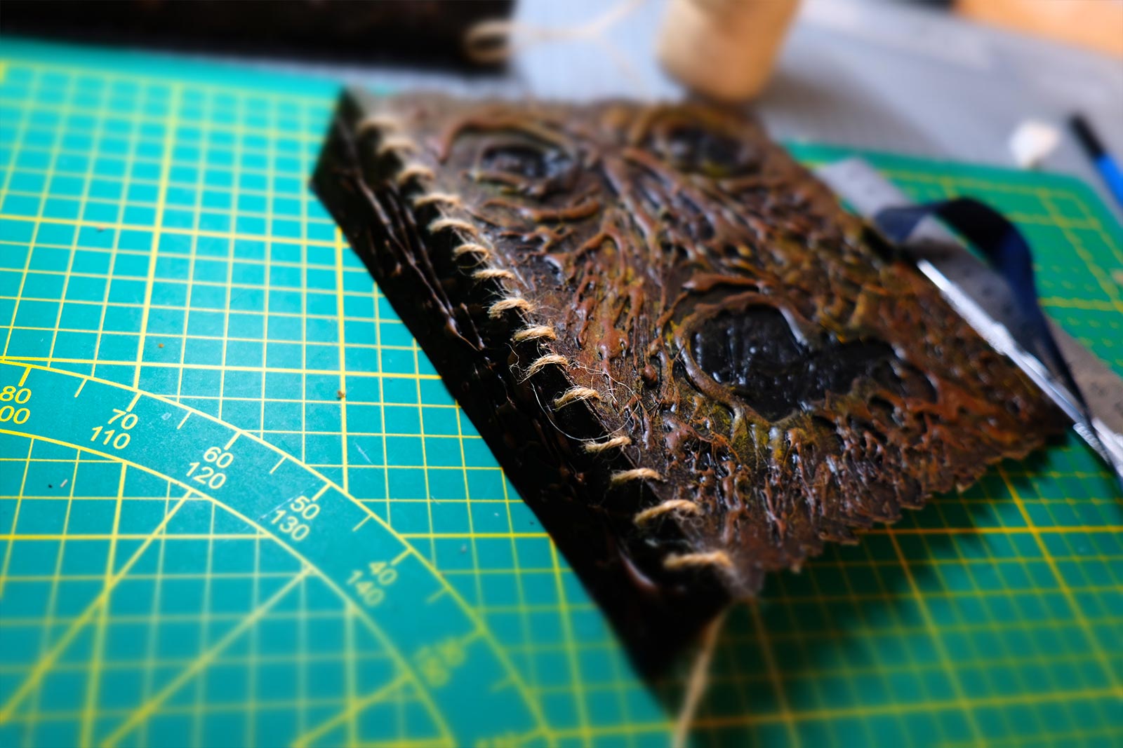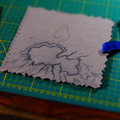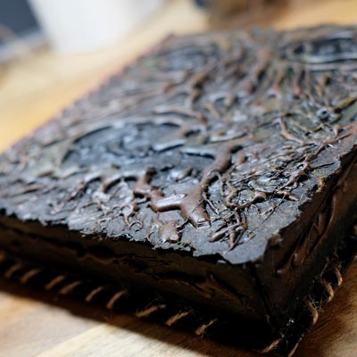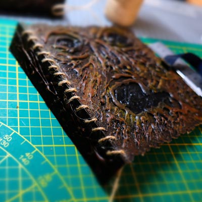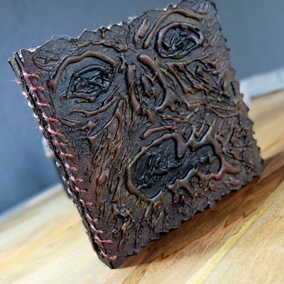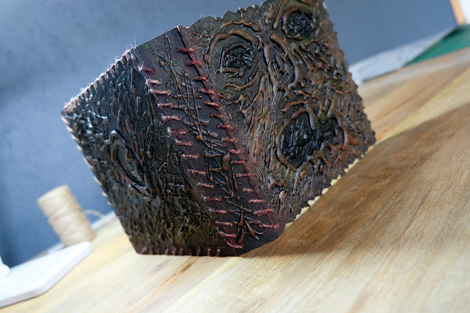 Une boîte en carton découpée, tailladée et remontée, voici la base de cette première création “Le Necromonicon Ex-Mortis”, tiré d’une scène d’Evil Dead III.